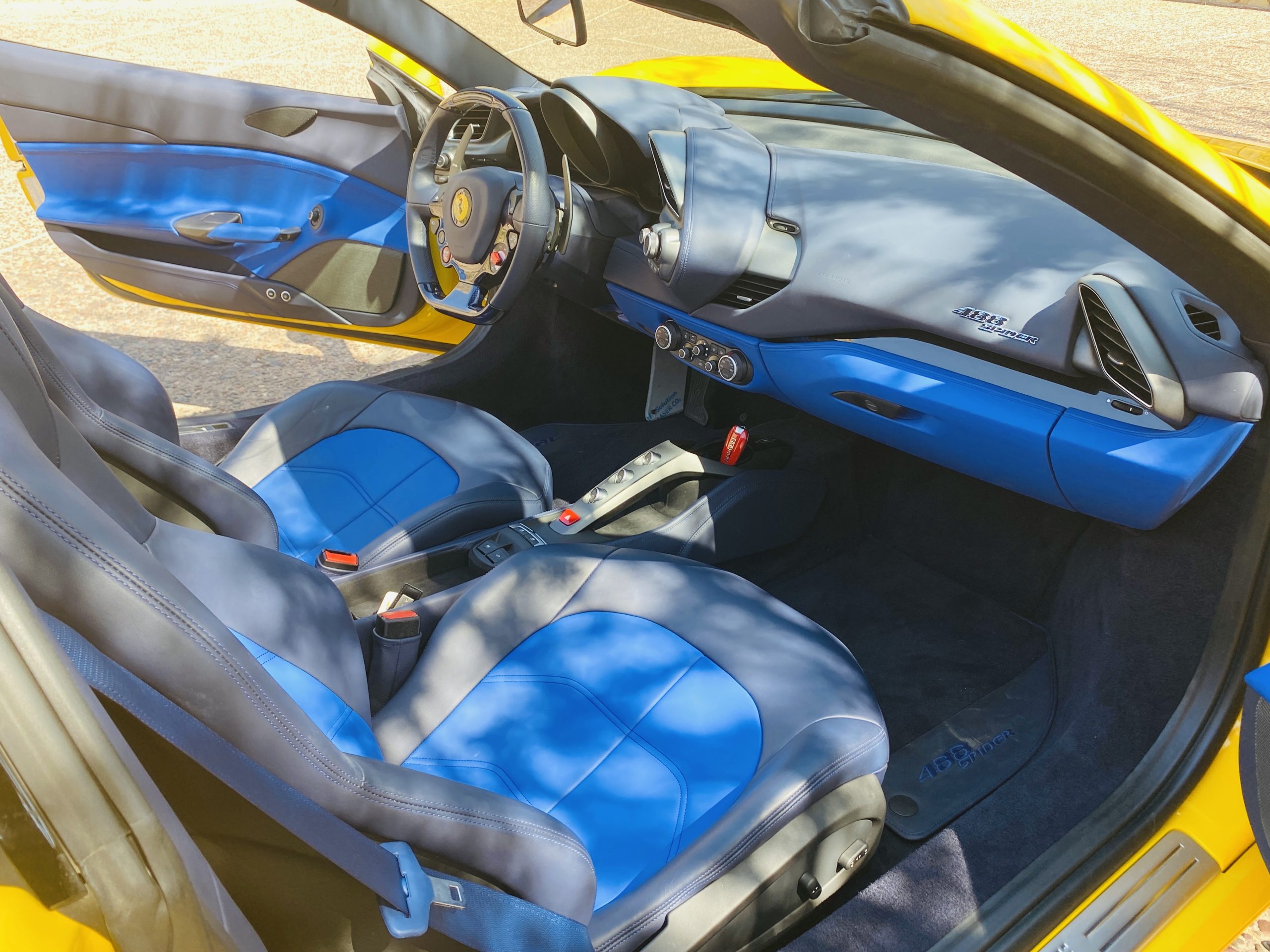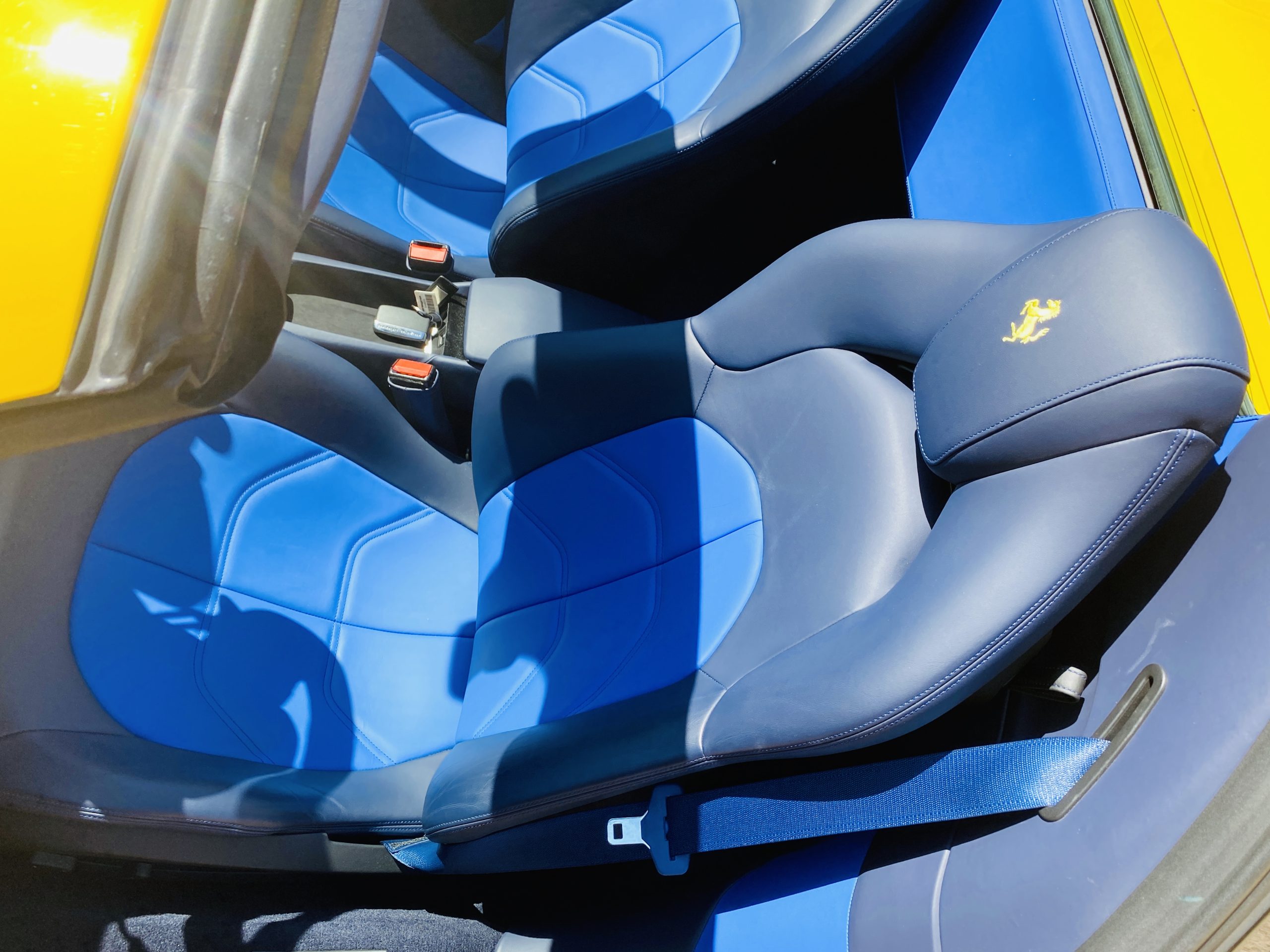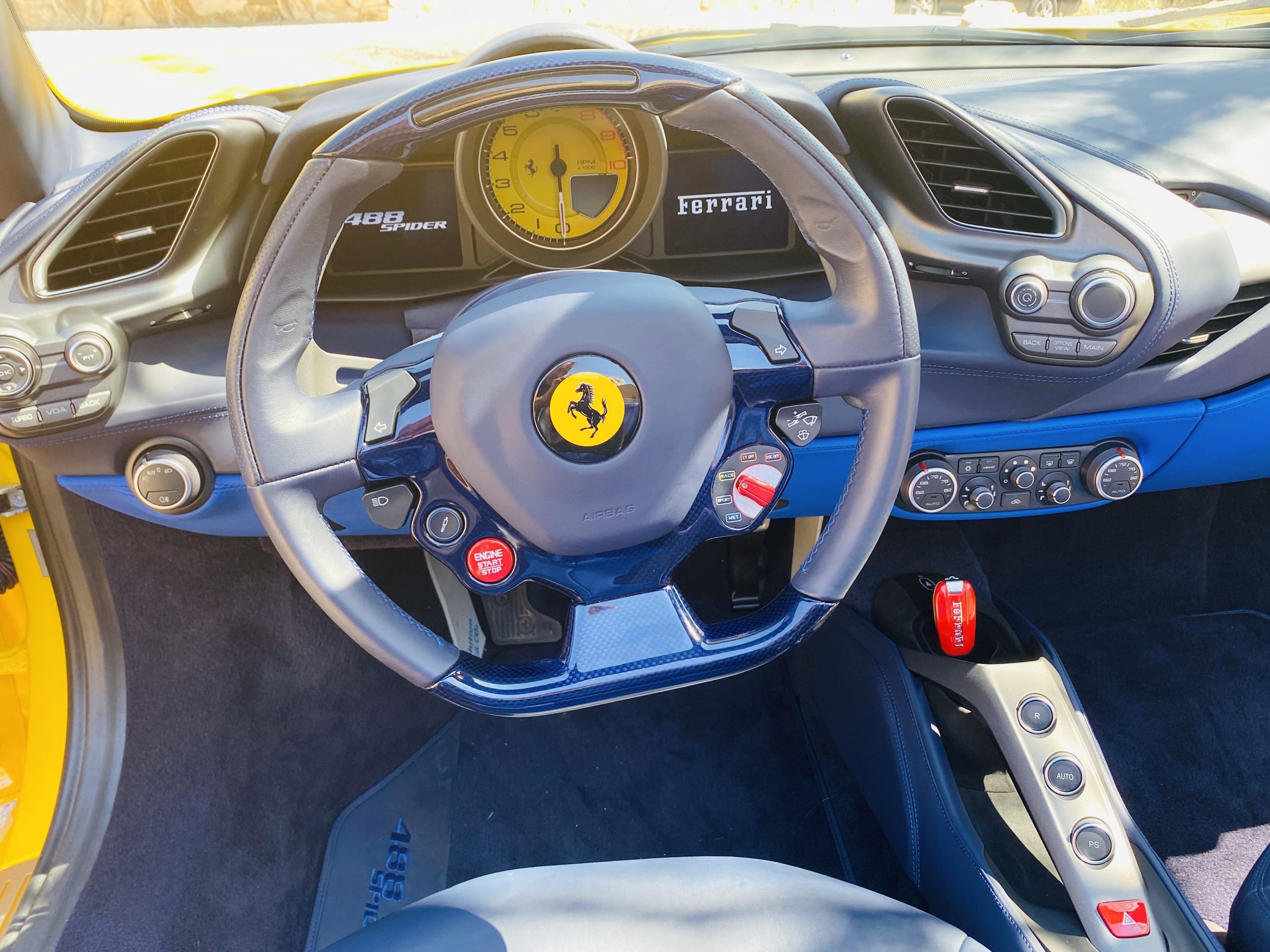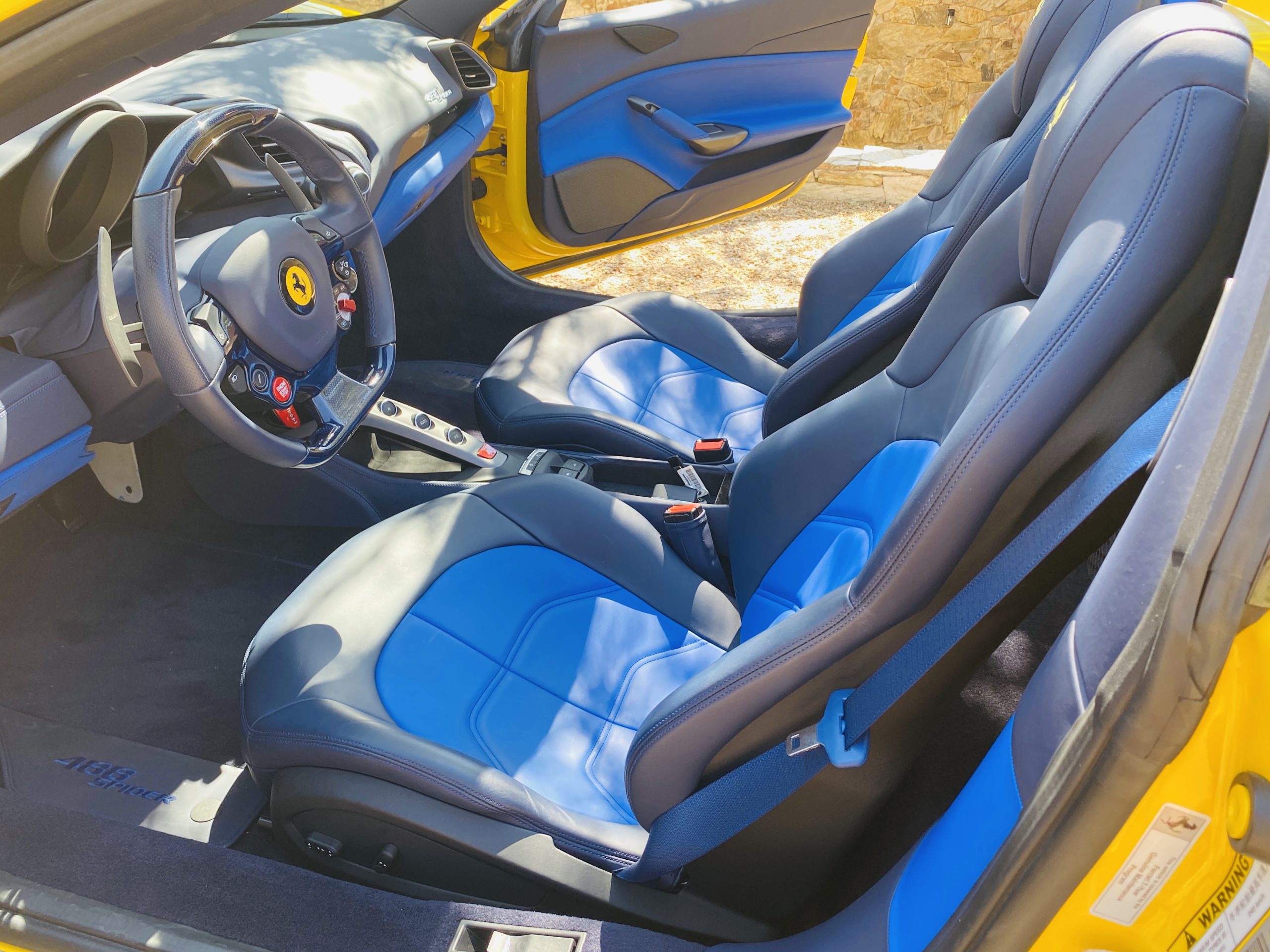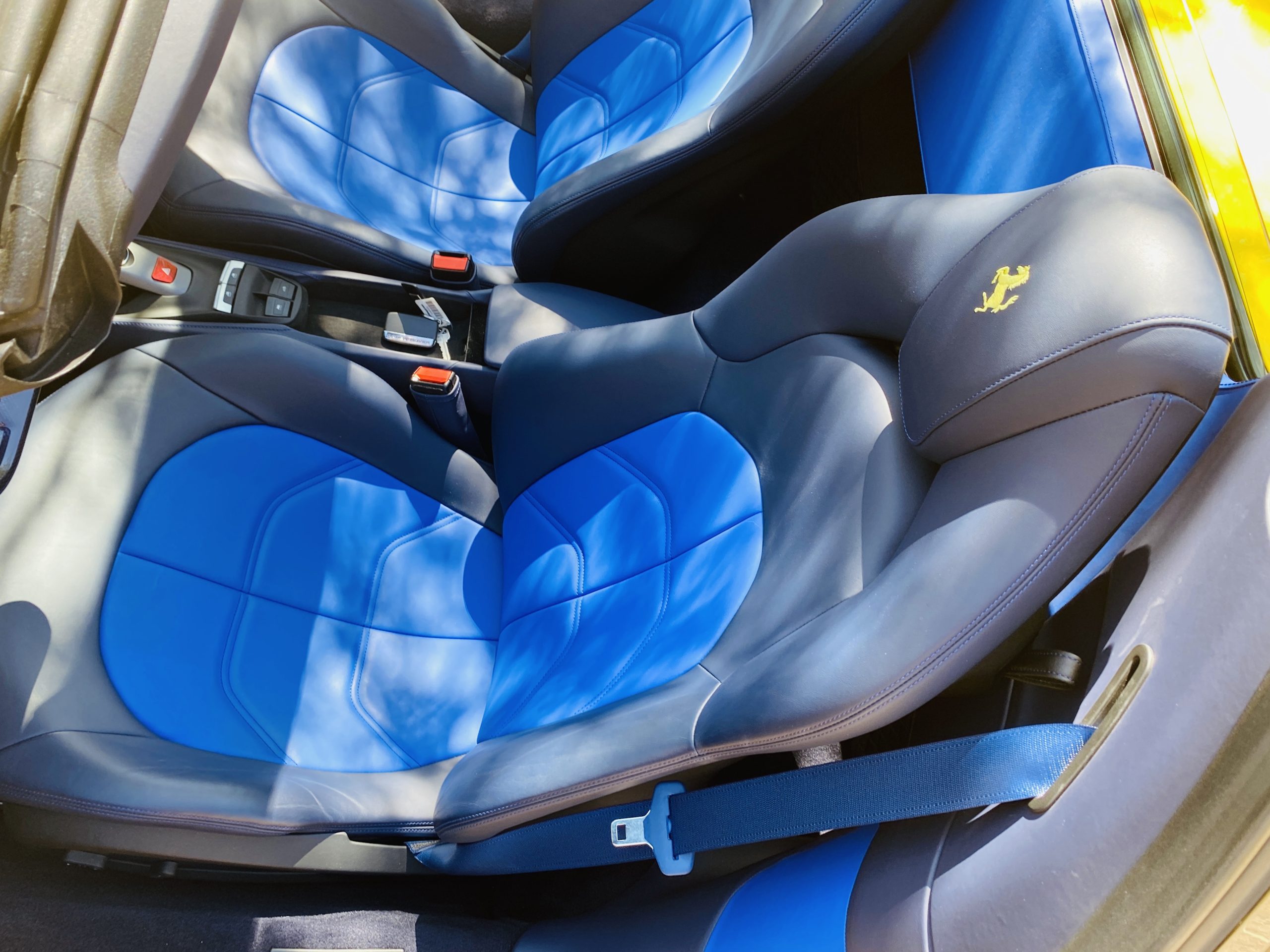 Its Giallo Modena yellow (Paint Code 4305) is stunning when contrasted with the two tone Blu Sterling and an Azzurro Santorini Blu hand stitched leather interior featuring electrically operated seats. We love the striking yellow Cavallino prancing horse embroidered on the headrests and the yellow Scuderia shields on the front fenders. The steering wheel looks straight out of an F1 formula car and is made from Blu carbon fiber and Blu leather, with no detail left unattended. The interior is dripping with the special order leather, making this more luxurious and sporty than most 488’s.