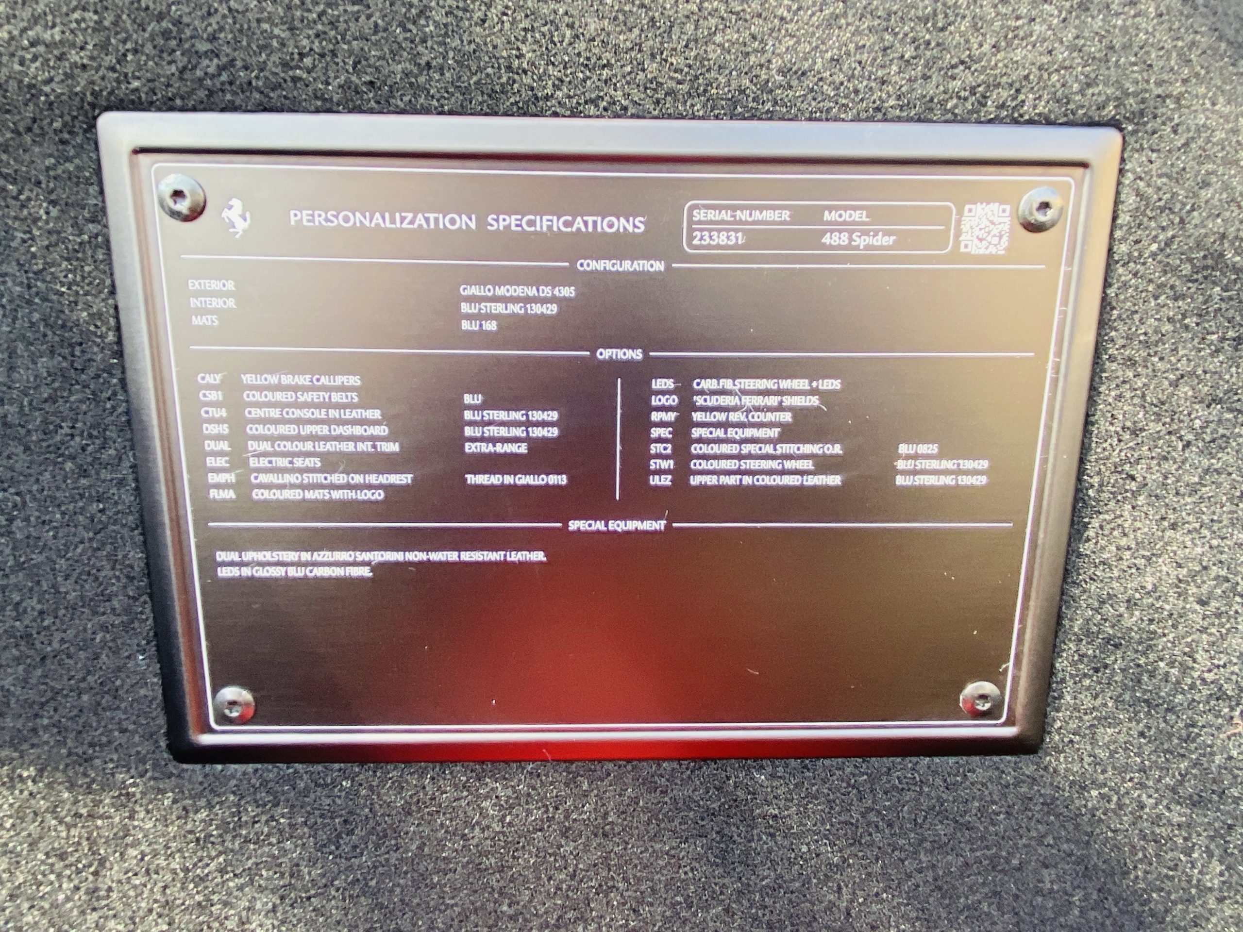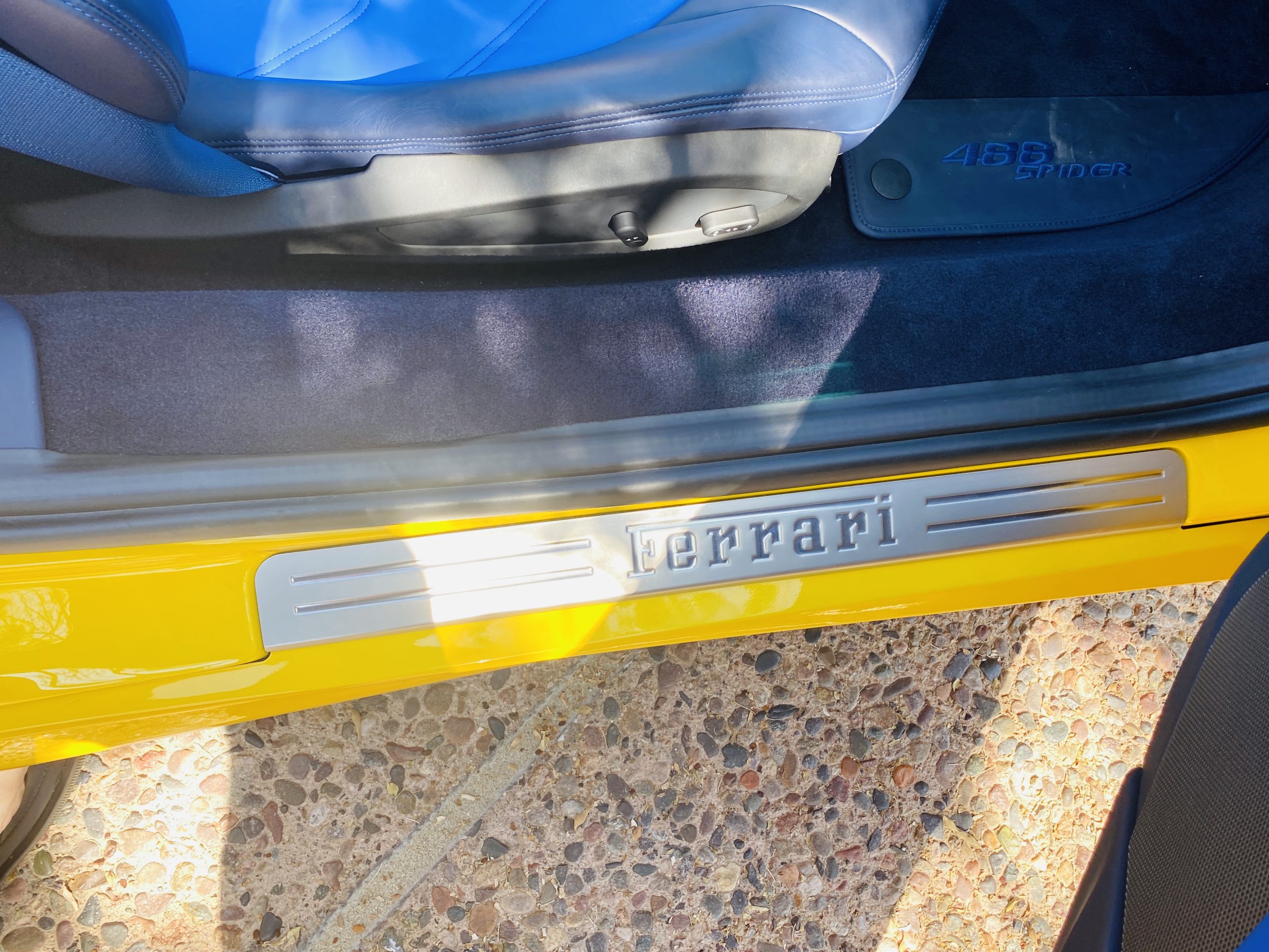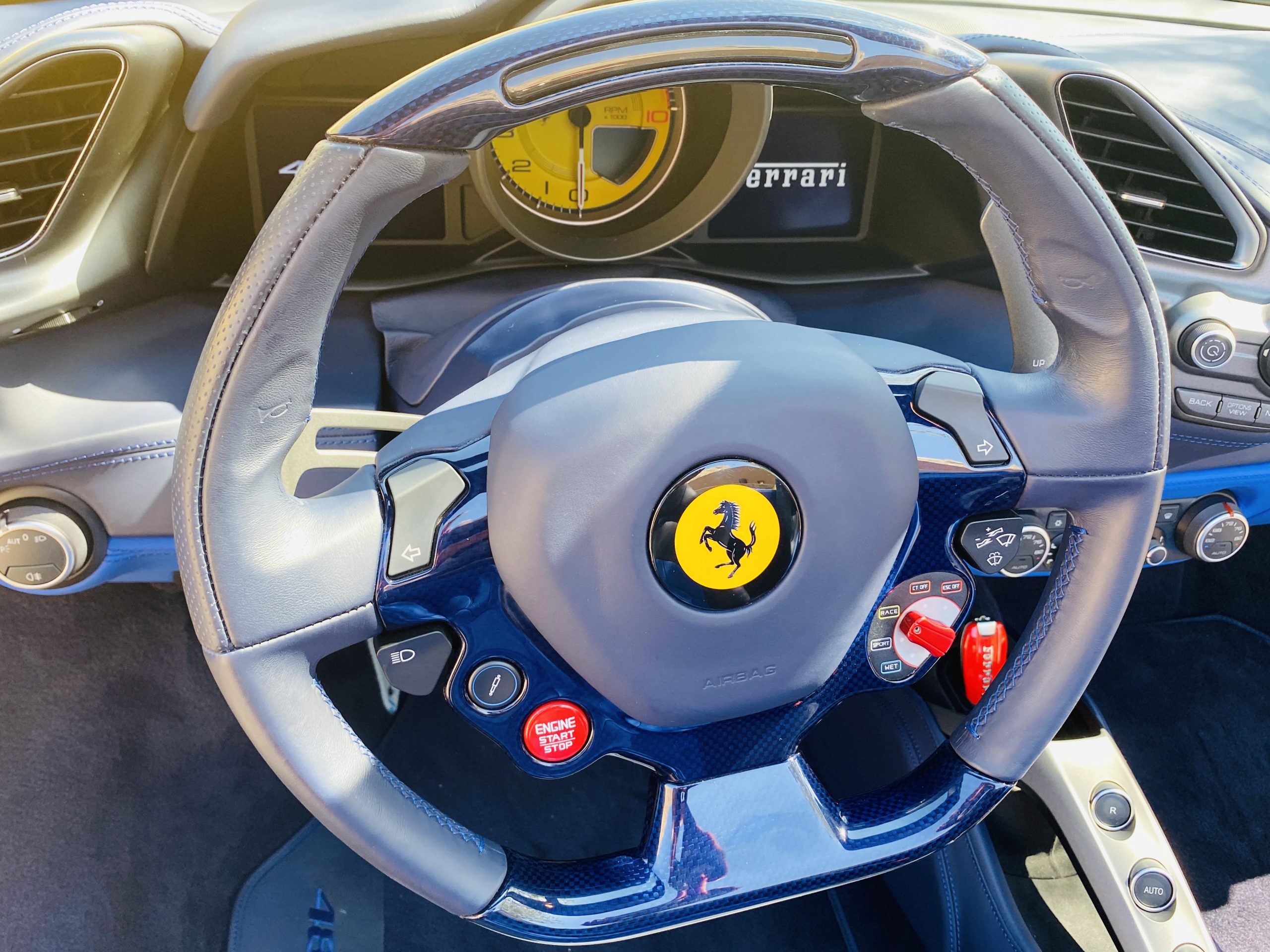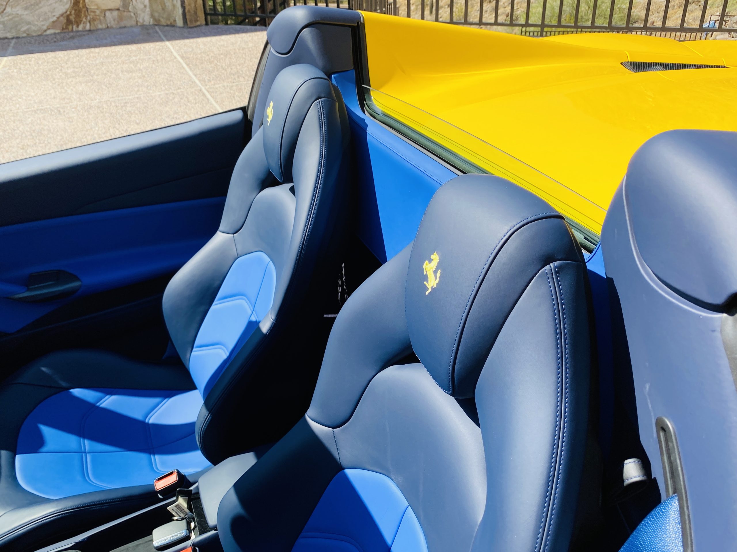 Its Giallo Modena yellow (Paint Code 4305) is stunning when contrasted with the two tone Blu Sterling and an Azzurro Santorini Blu hand stitched leather interior featuring electrically operated seats. We love the striking yellow Cavallino prancing horse embroidered on the headrests and the yellow Scuderia shields on the front fenders. The steering wheel looks straight out of an F1 formula car and is made from Blu carbon fiber and Blu leather, with no detail left unattended. The interior is dripping with the special order leather, making this more luxurious and sporty than most 488’s.