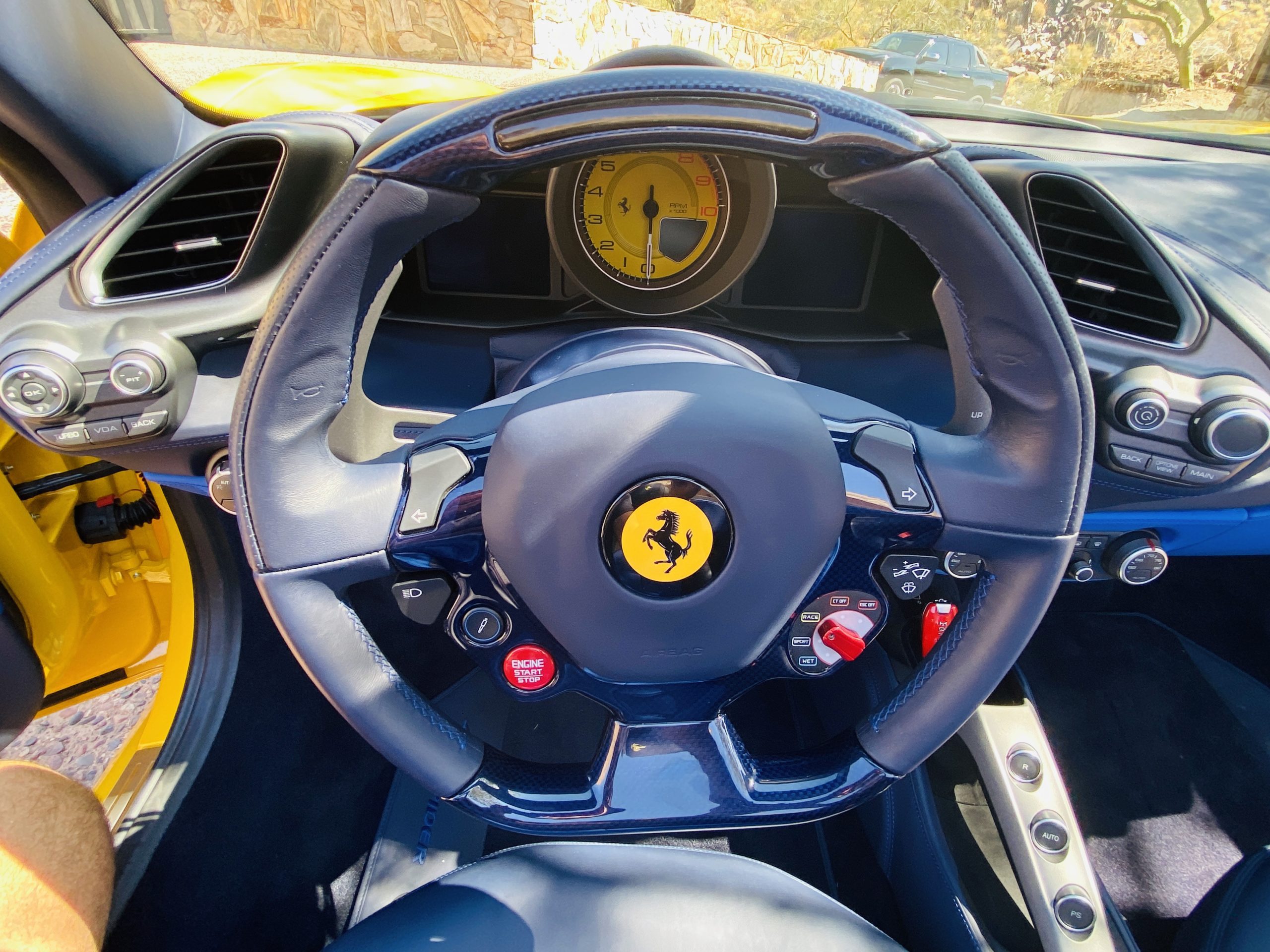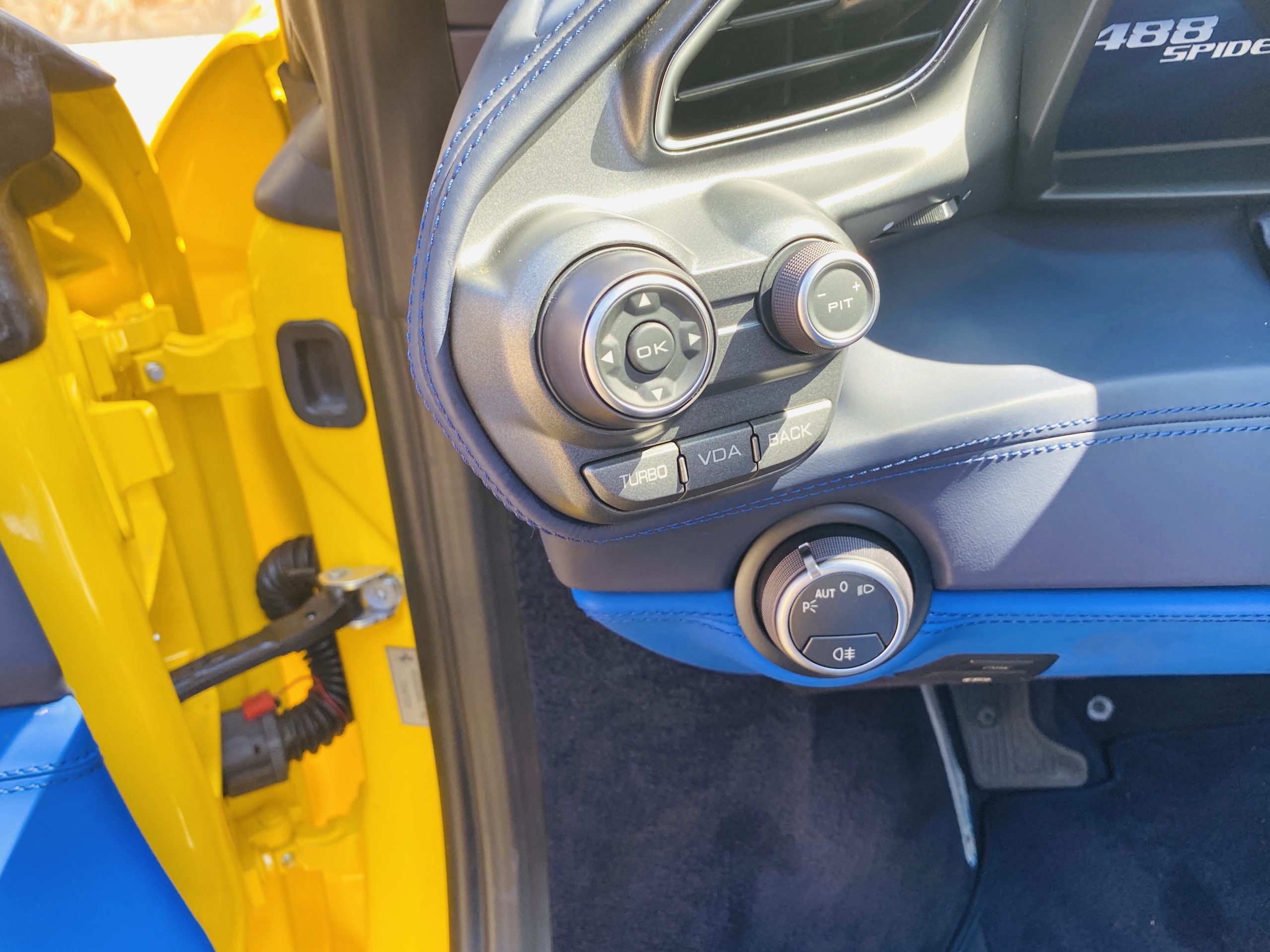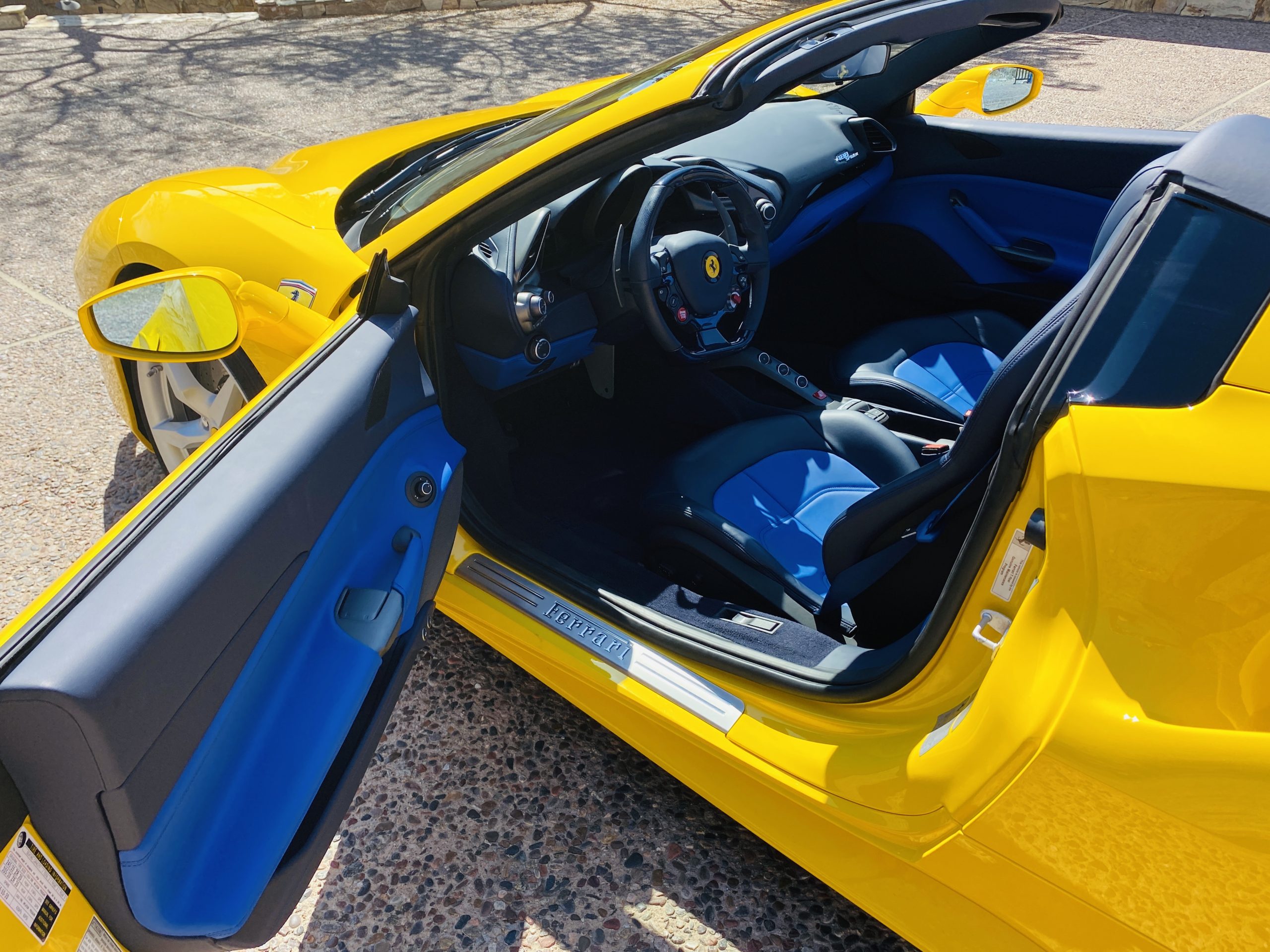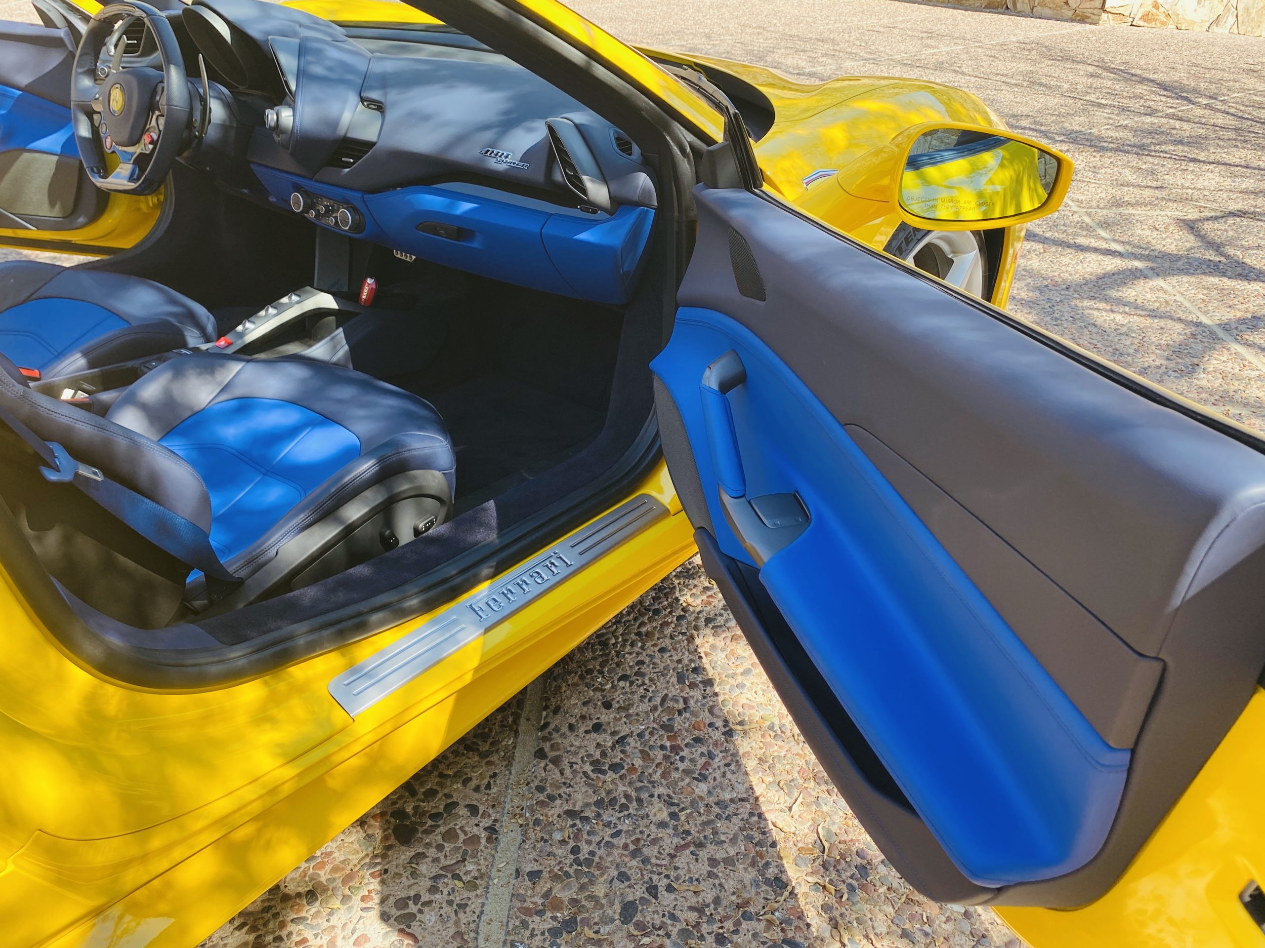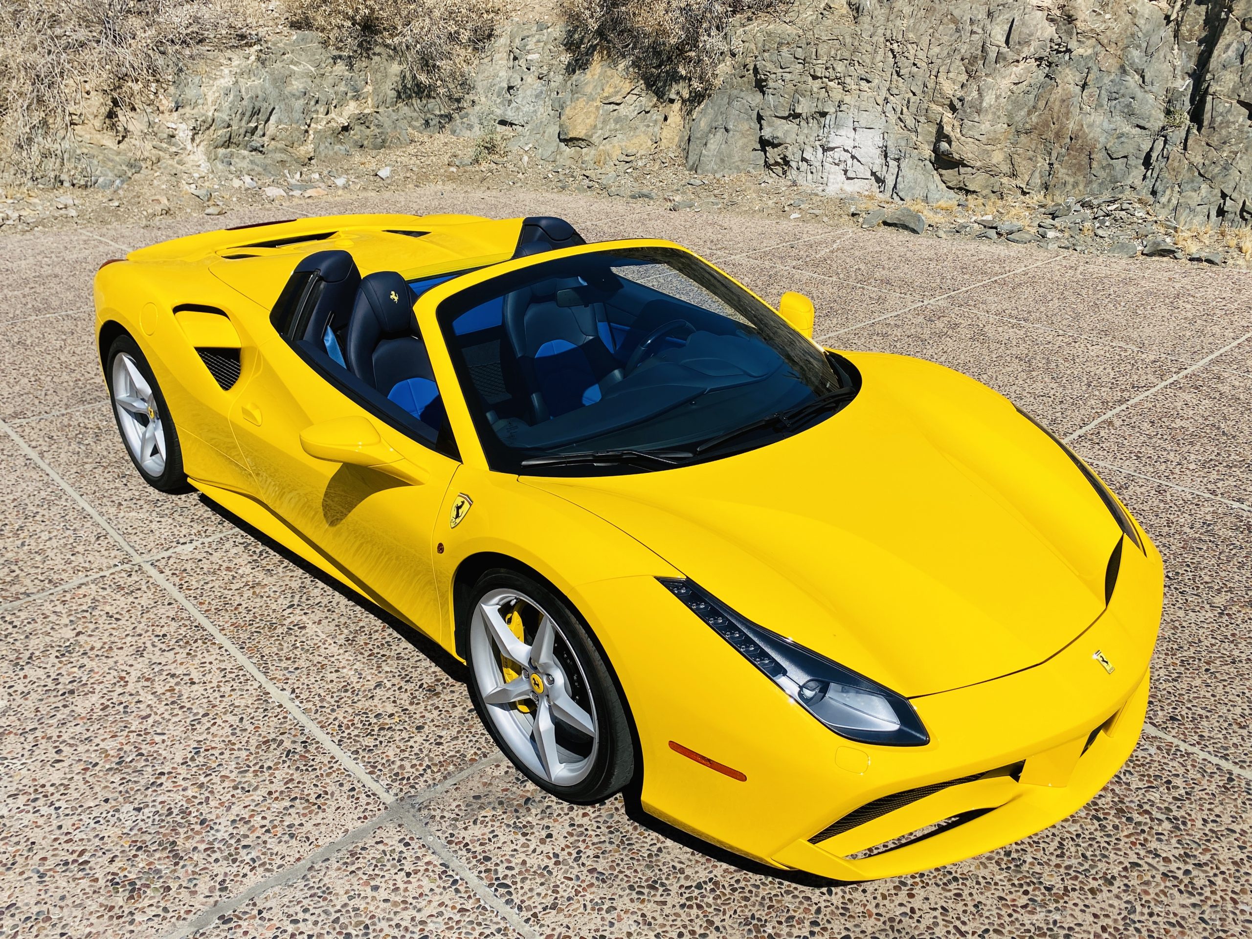 Its Giallo Modena yellow (Paint Code 4305) is stunning when contrasted with the two tone Blu Sterling and an Azzurro Santorini Blu hand stitched leather interior featuring electrically operated seats. We love the striking yellow Cavallino prancing horse embroidered on the headrests and the yellow Scuderia shields on the front fenders. The steering wheel looks straight out of an F1 formula car and is made from Blu carbon fiber and Blu leather, with no detail left unattended. The interior is dripping with the special order leather, making this more luxurious and sporty than most 488’s.