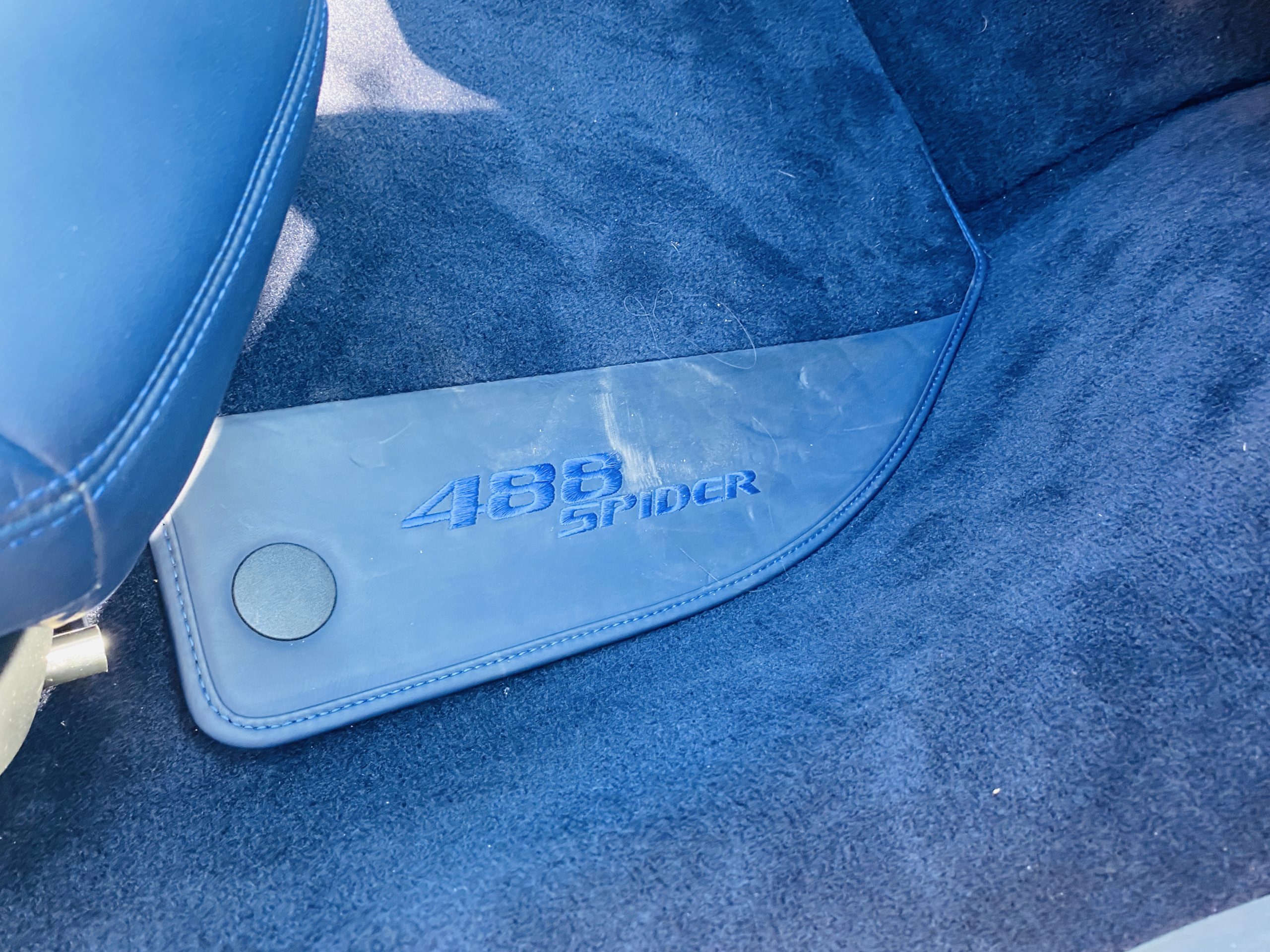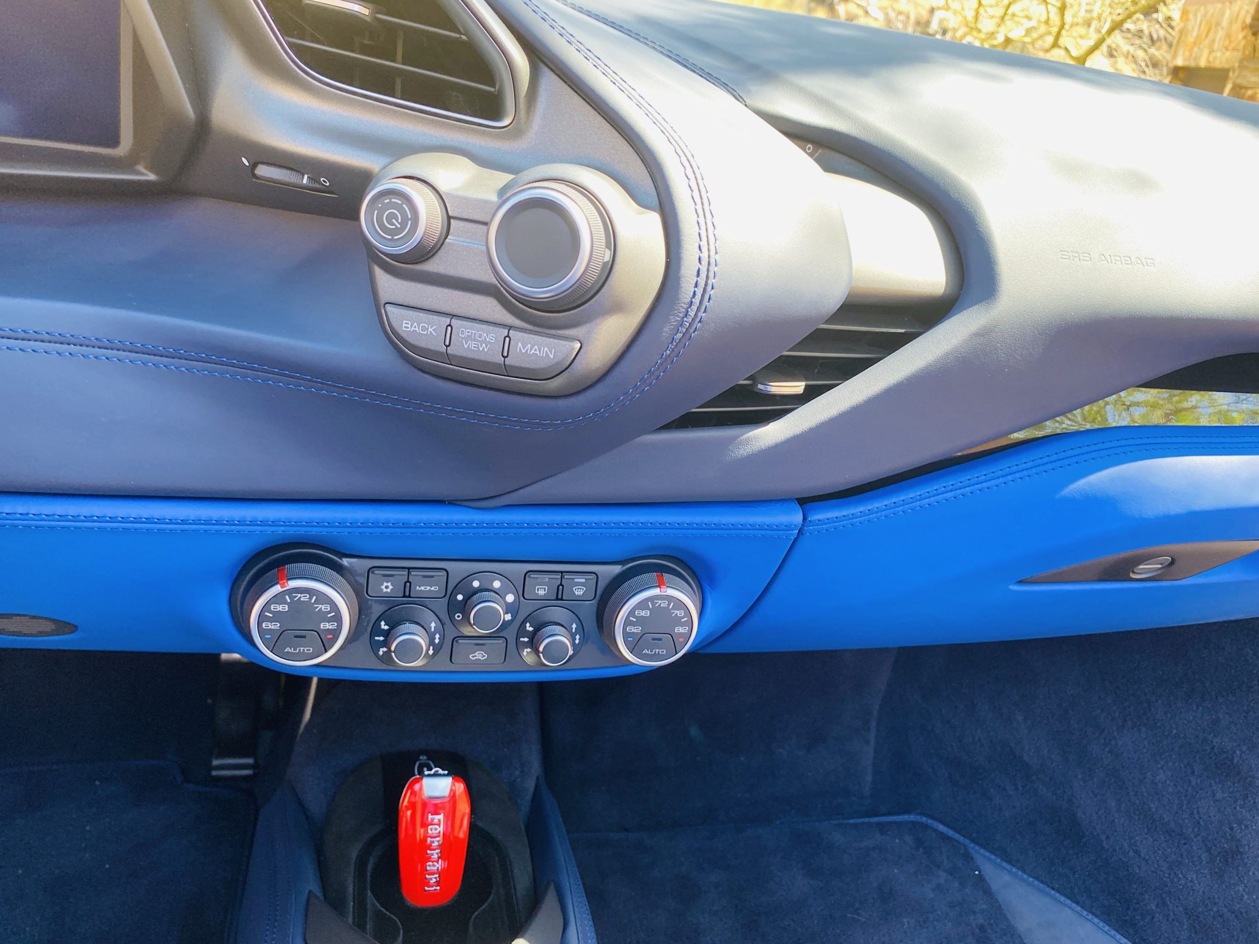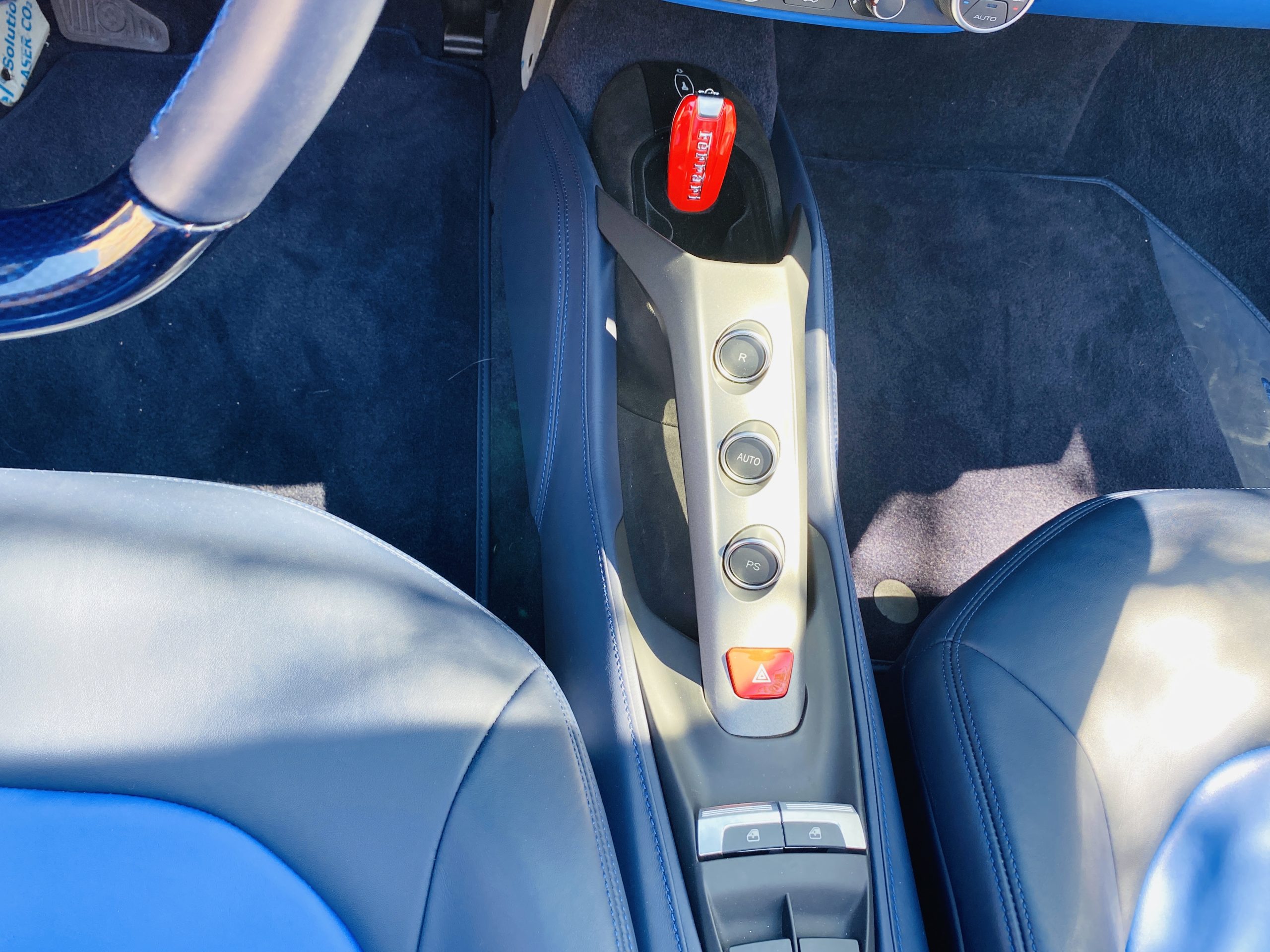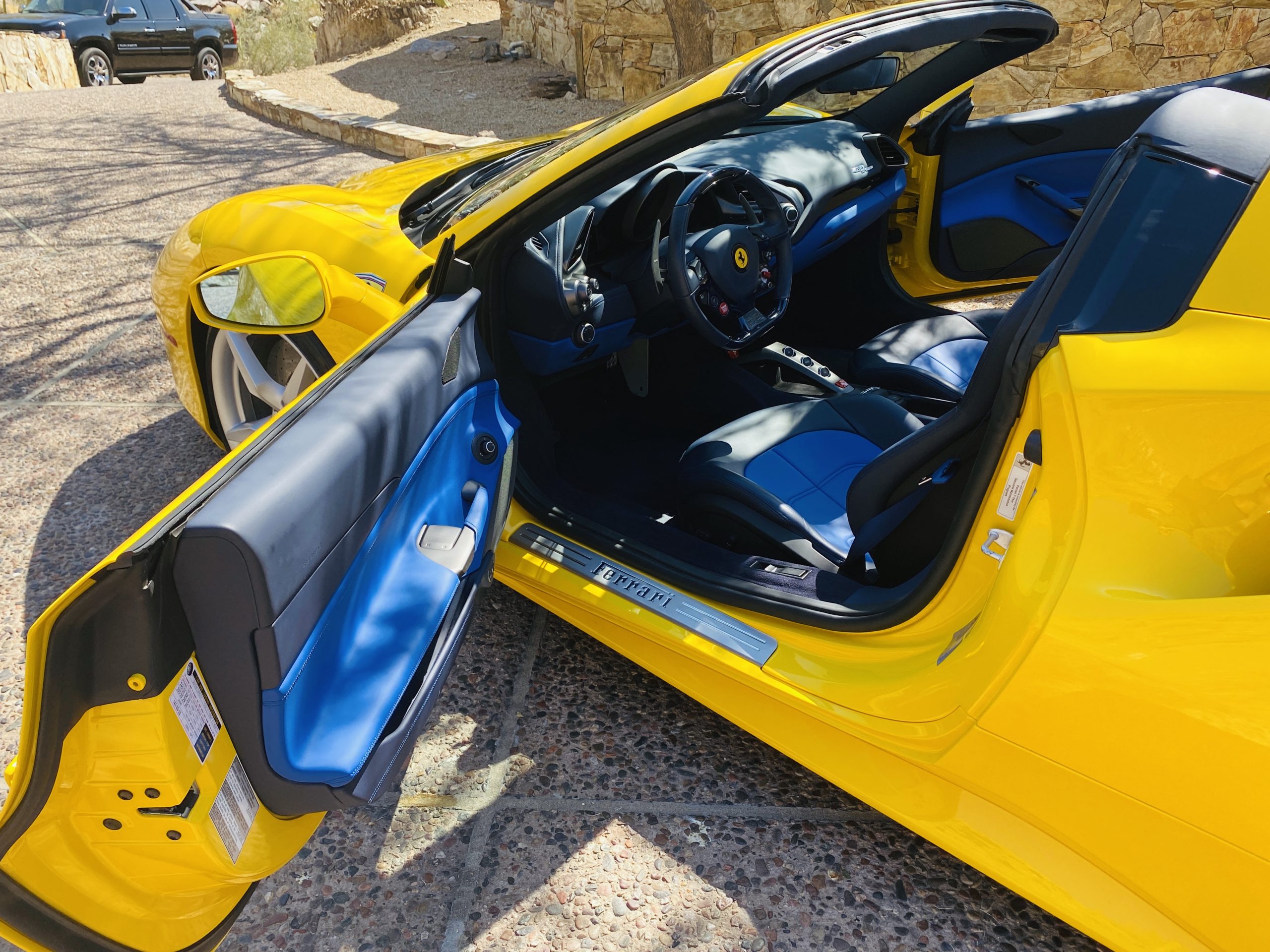Its Giallo Modena yellow (Paint Code 4305) is stunning when contrasted with the two tone Blu Sterling and an Azzurro Santorini Blu hand stitched leather interior featuring electrically operated seats. We love the striking yellow Cavallino prancing horse embroidered on the headrests and the yellow Scuderia shields on the front fenders. The steering wheel looks straight out of an F1 formula car and is made from Blu carbon fiber and Blu leather, with no detail left unattended. The interior is dripping with the special order leather, making this more luxurious and sporty than most 488’s.