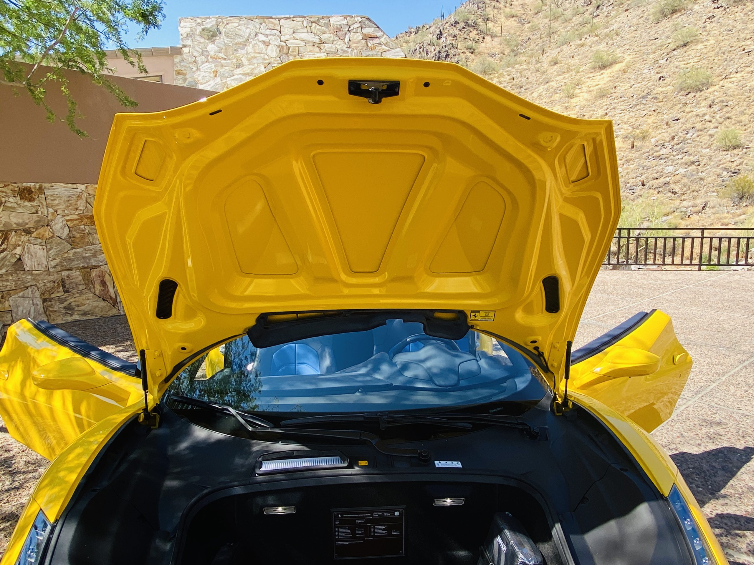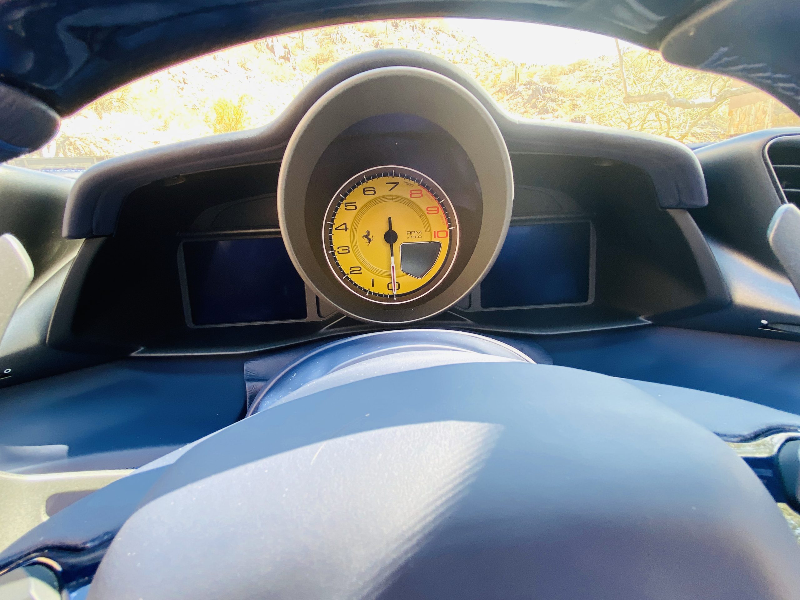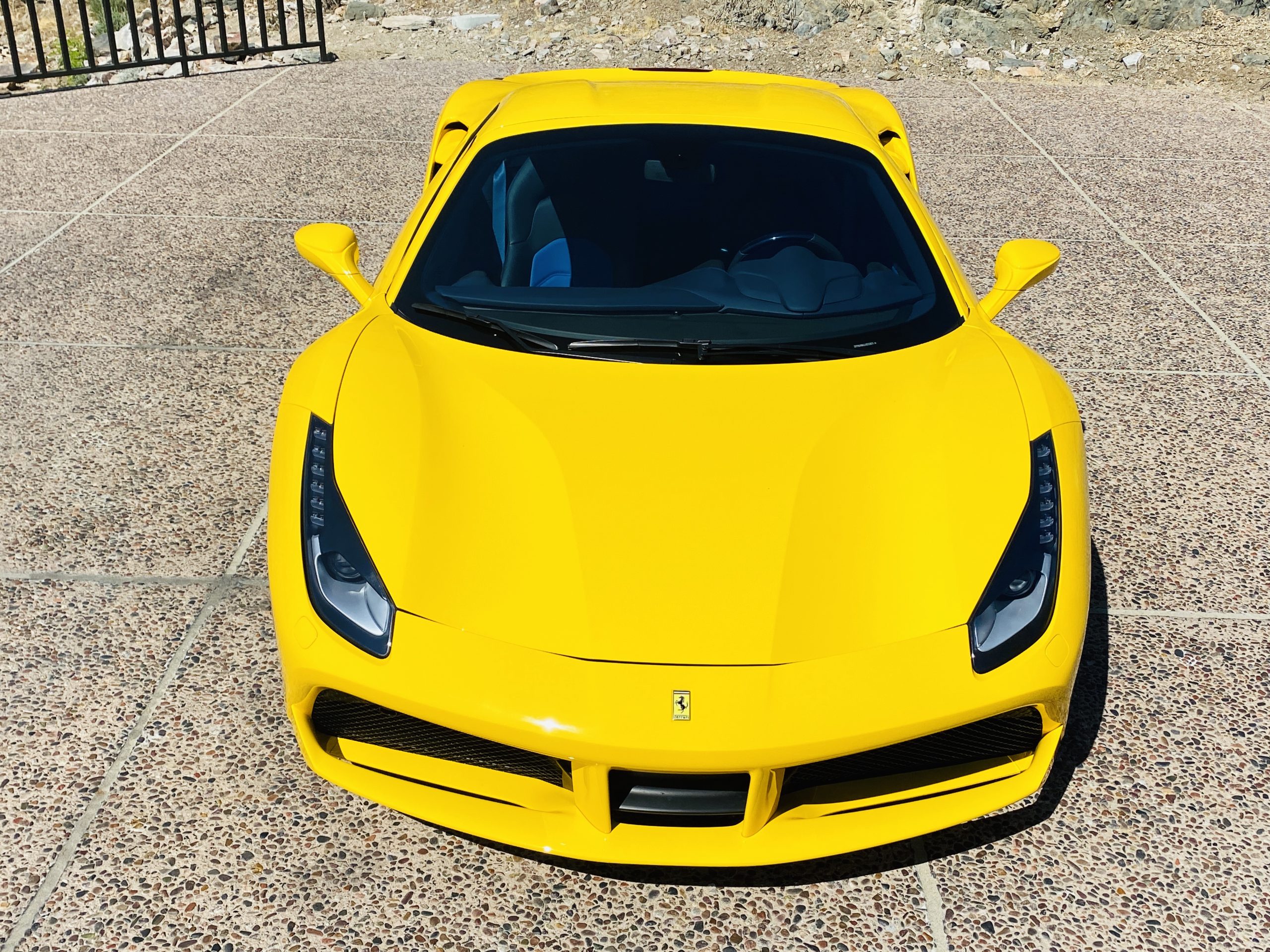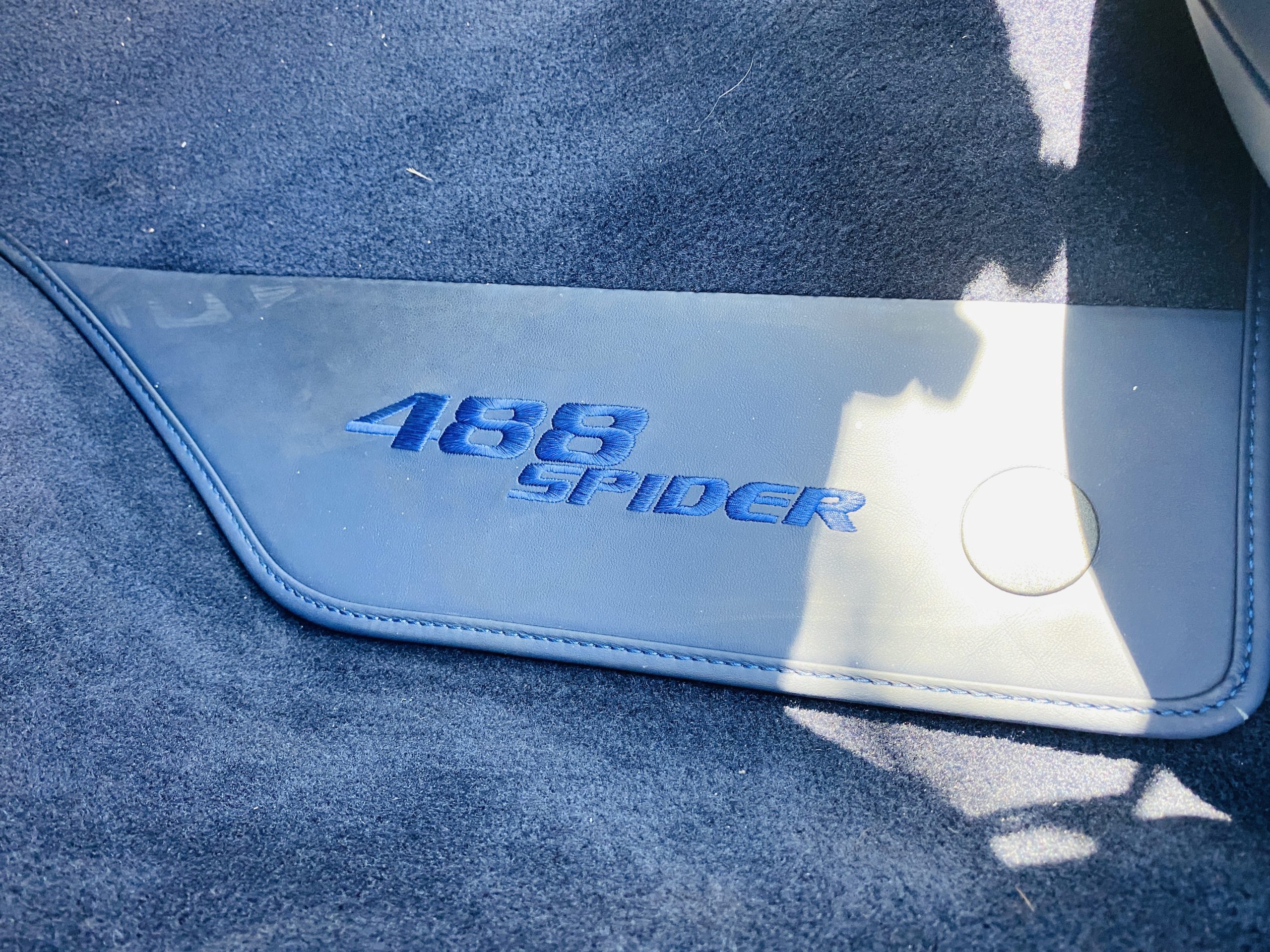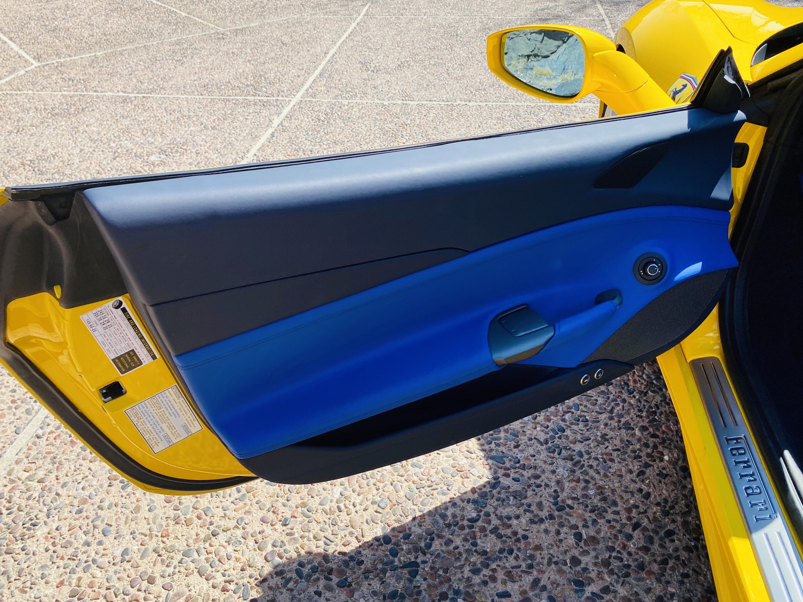 Its Giallo Modena yellow (Paint Code 4305) is stunning when contrasted with the two tone Blu Sterling and an Azzurro Santorini Blu hand stitched leather interior featuring electrically operated seats. We love the striking yellow Cavallino prancing horse embroidered on the headrests and the yellow Scuderia shields on the front fenders. The steering wheel looks straight out of an F1 formula car and is made from Blu carbon fiber and Blu leather, with no detail left unattended. The interior is dripping with the special order leather, making this more luxurious and sporty than most 488’s.