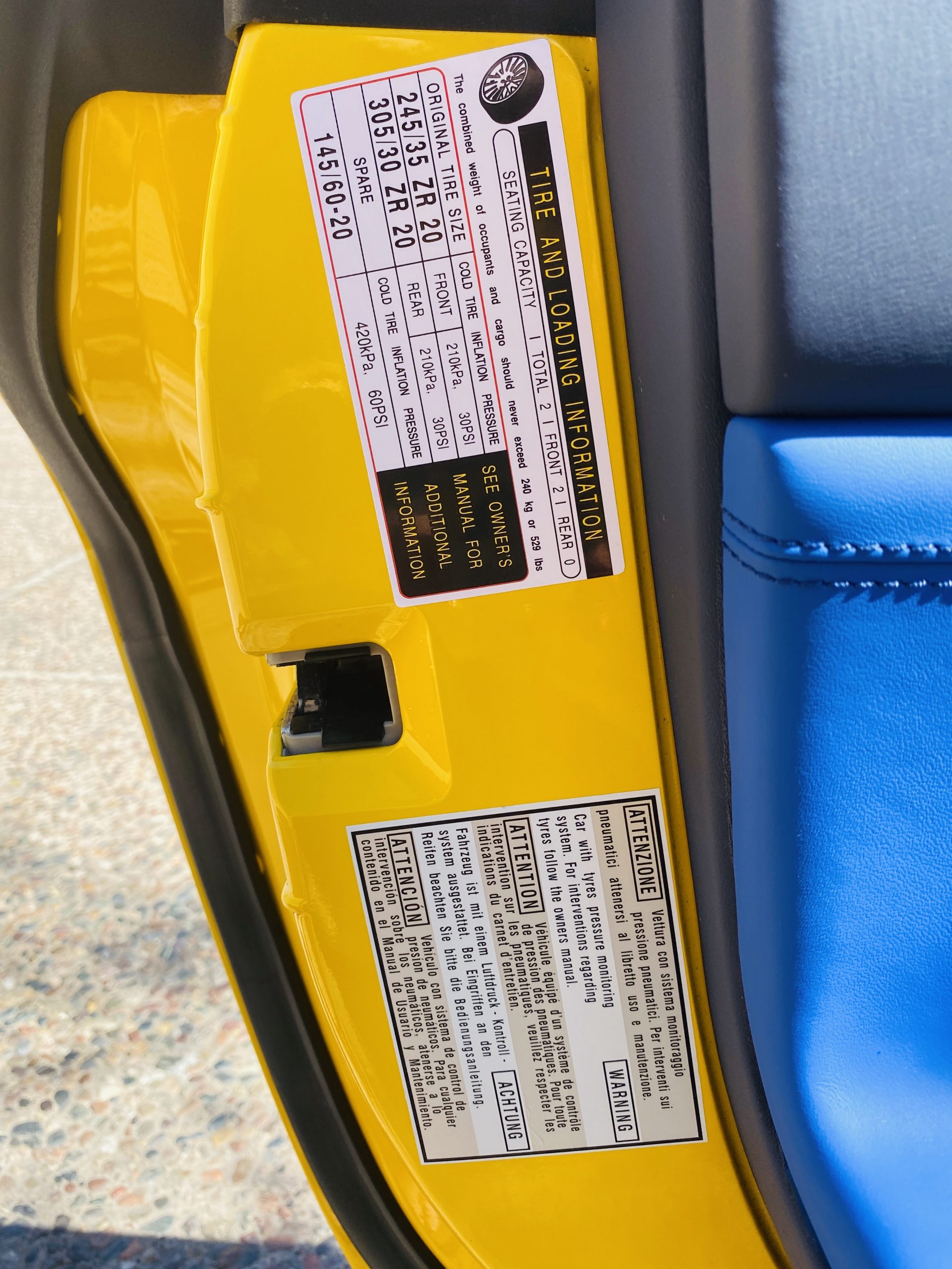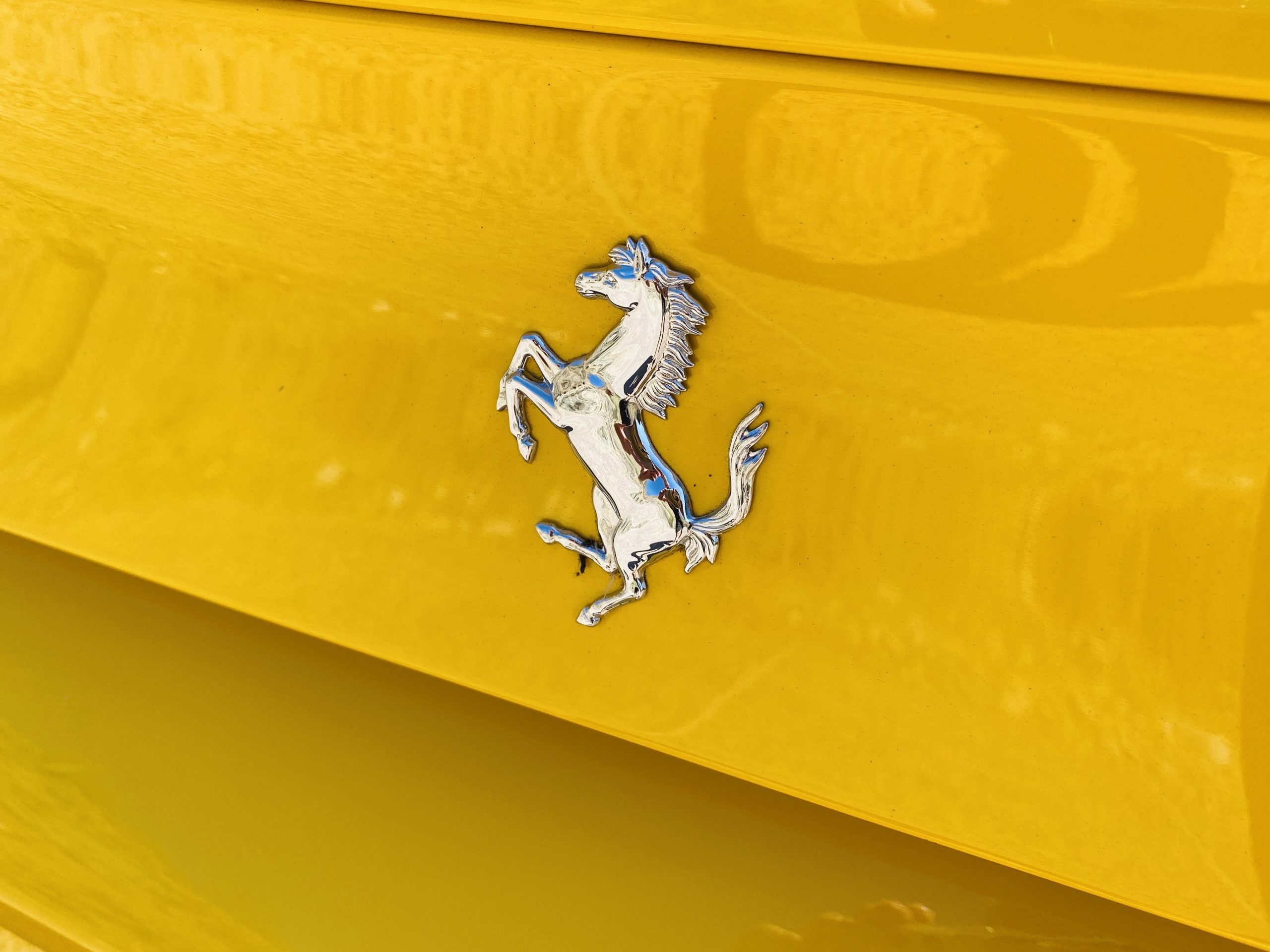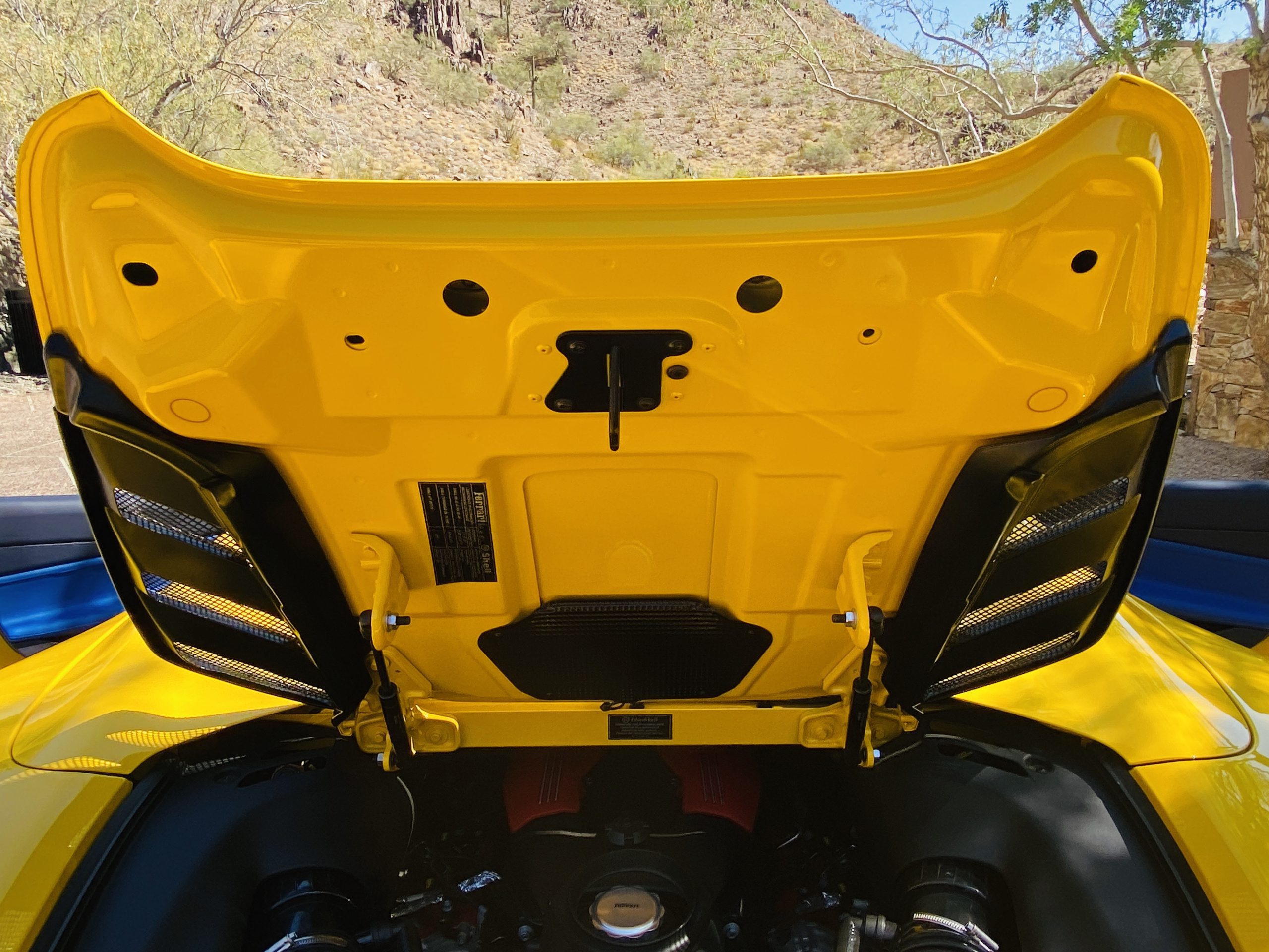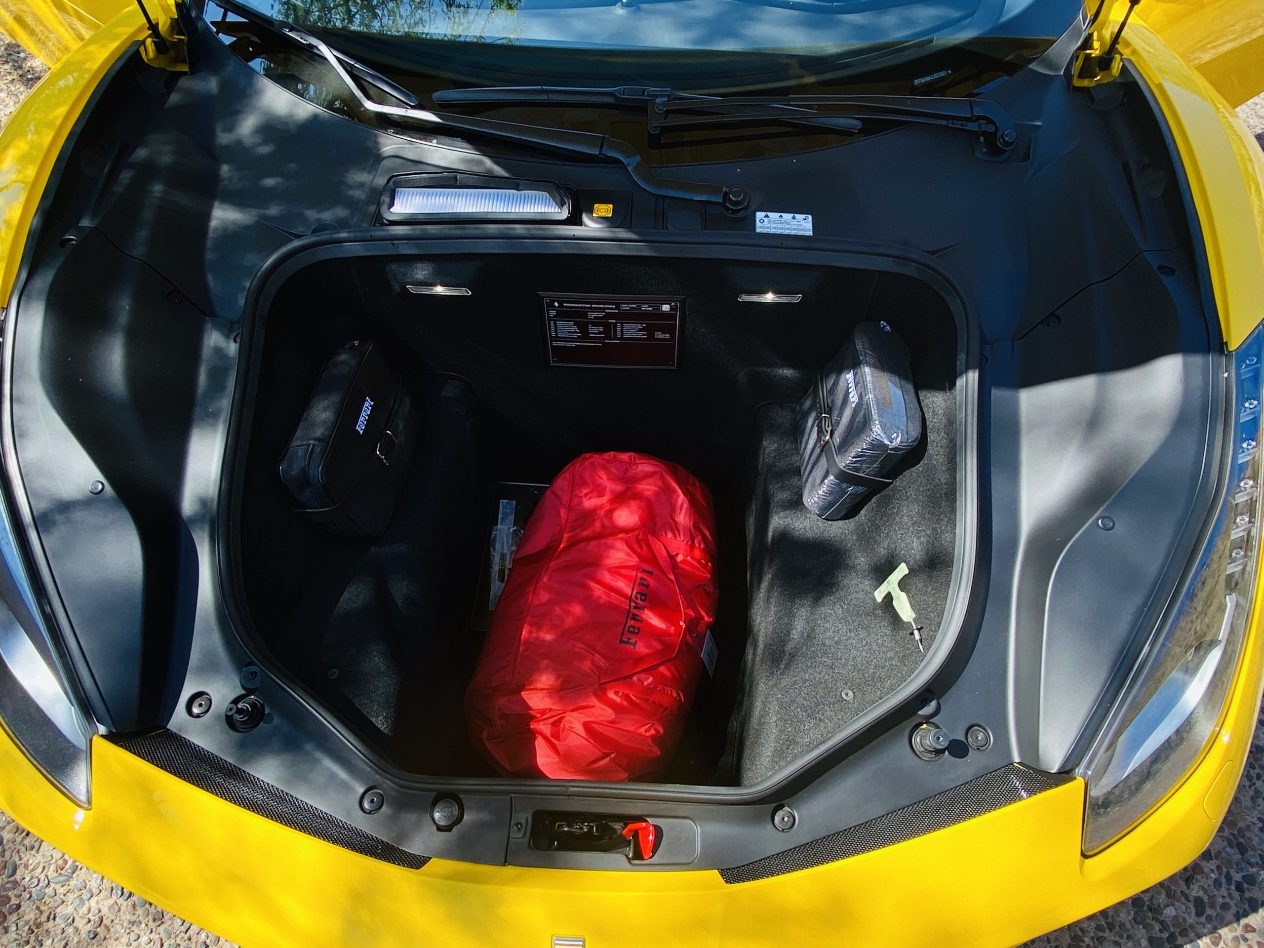 Its Giallo Modena yellow (Paint Code 4305) is stunning when contrasted with the two tone Blu Sterling and an Azzurro Santorini Blu hand stitched leather interior featuring electrically operated seats. We love the striking yellow Cavallino prancing horse embroidered on the headrests and the yellow Scuderia shields on the front fenders. The steering wheel looks straight out of an F1 formula car and is made from Blu carbon fiber and Blu leather, with no detail left unattended. The interior is dripping with the special order leather, making this more luxurious and sporty than most 488’s.