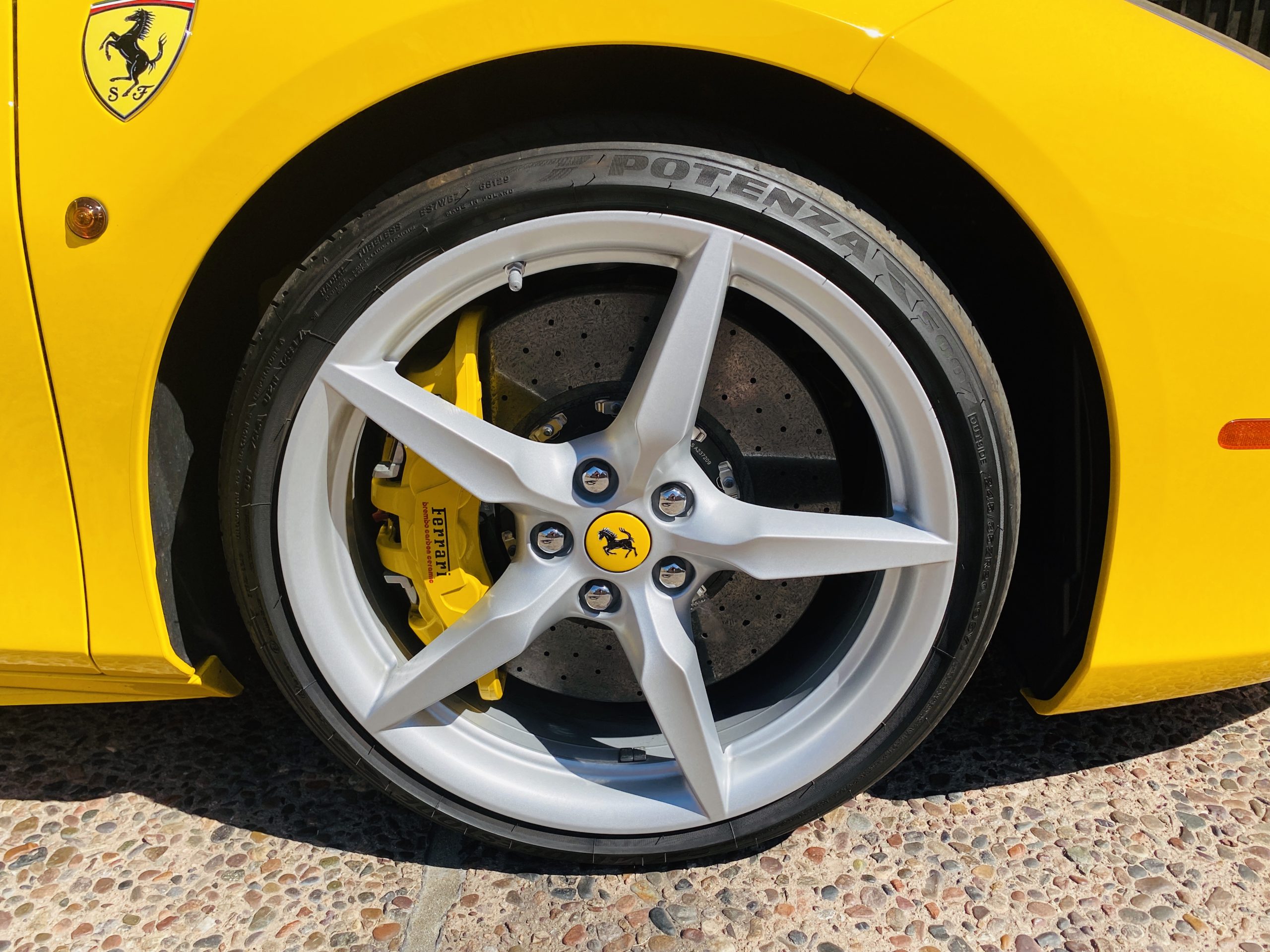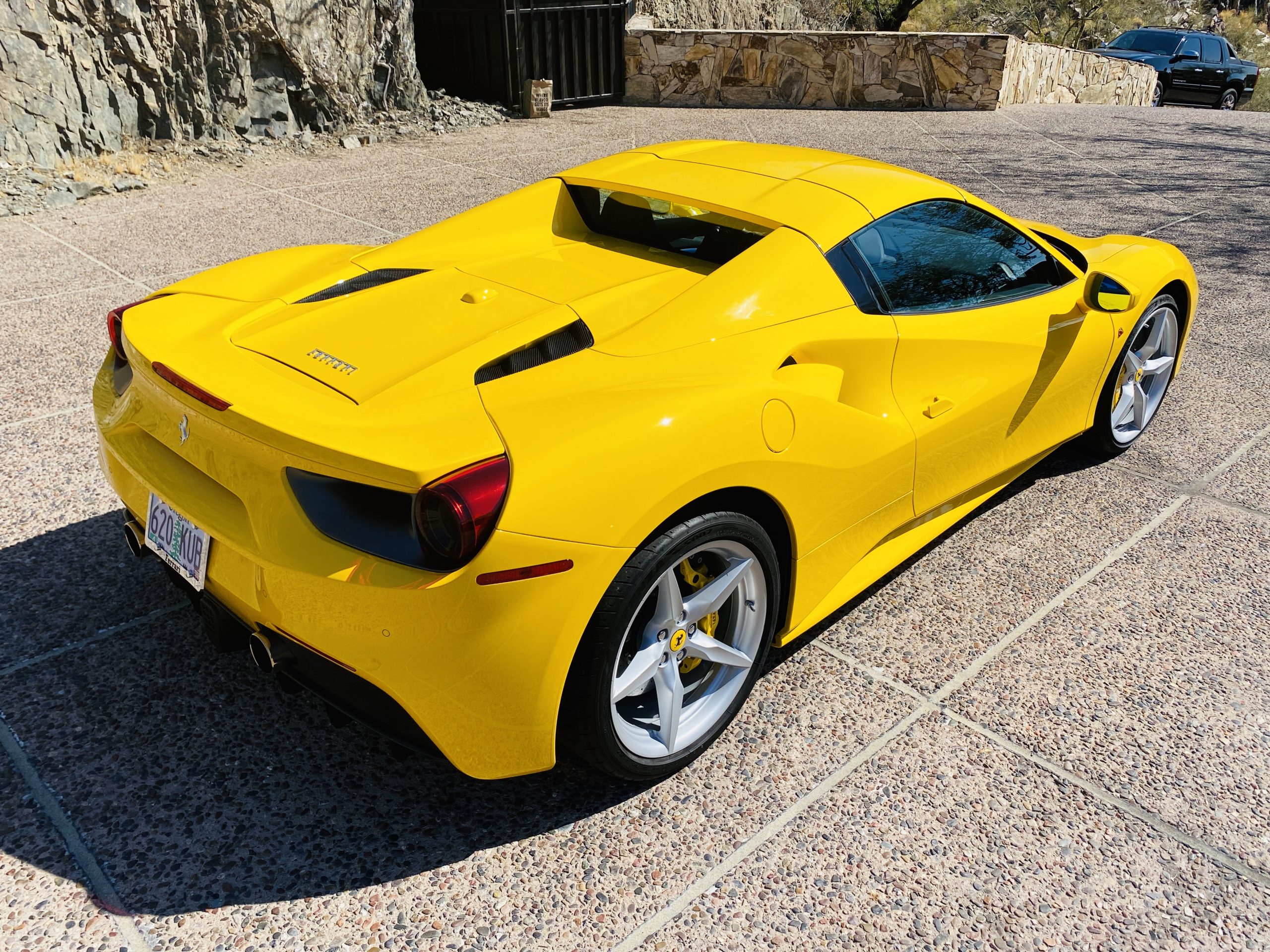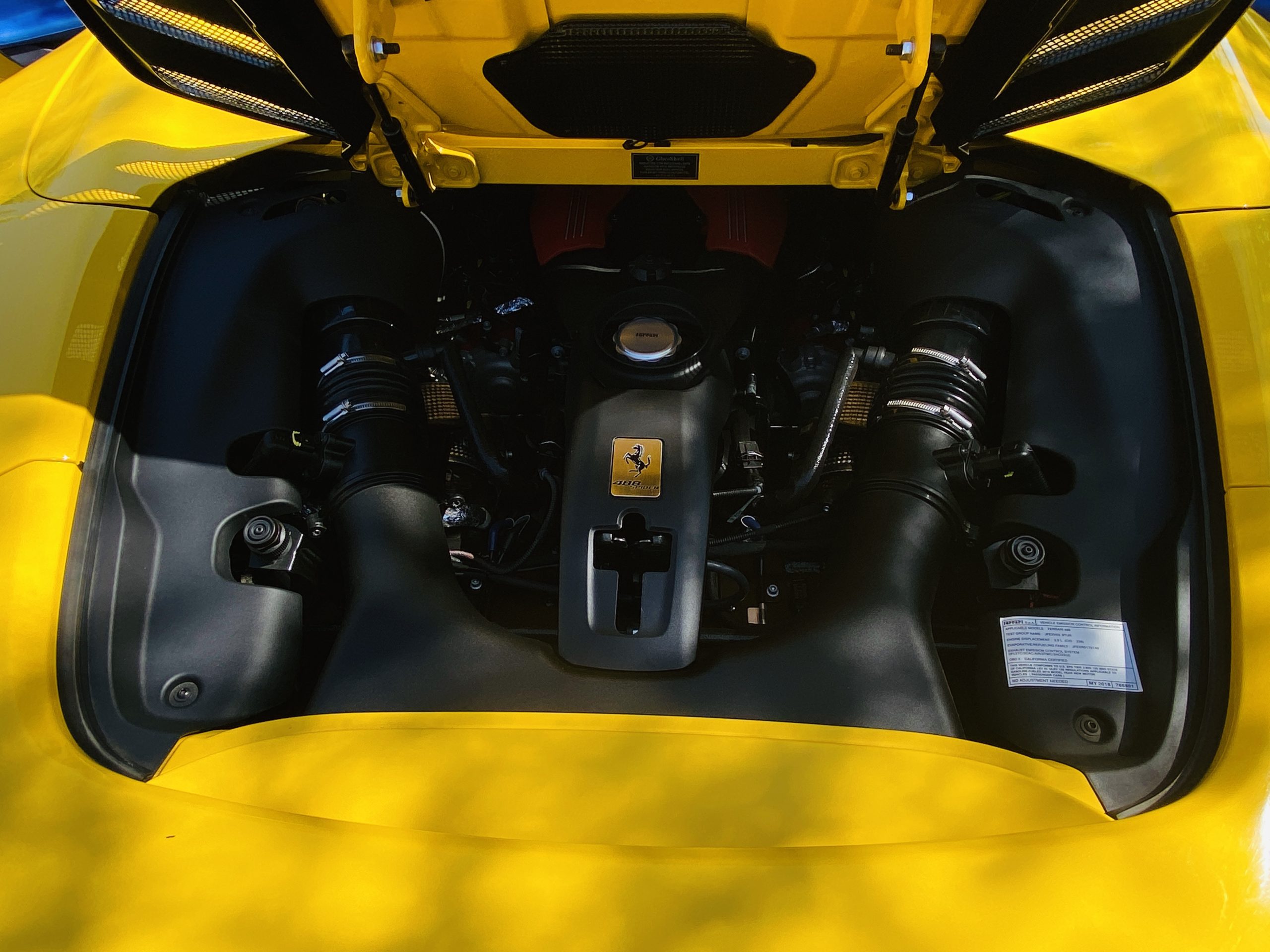 The 3.9 liter twin turbocharged V8 is paired to the seven speed F1 gearbox. This engine produces 661 hp at 8,000 rpm and 561 lb⋅ft of torque as low as 3,000 rpm. Both the horsepower and torque figures are record setting for Ferrari on a per liter basis.