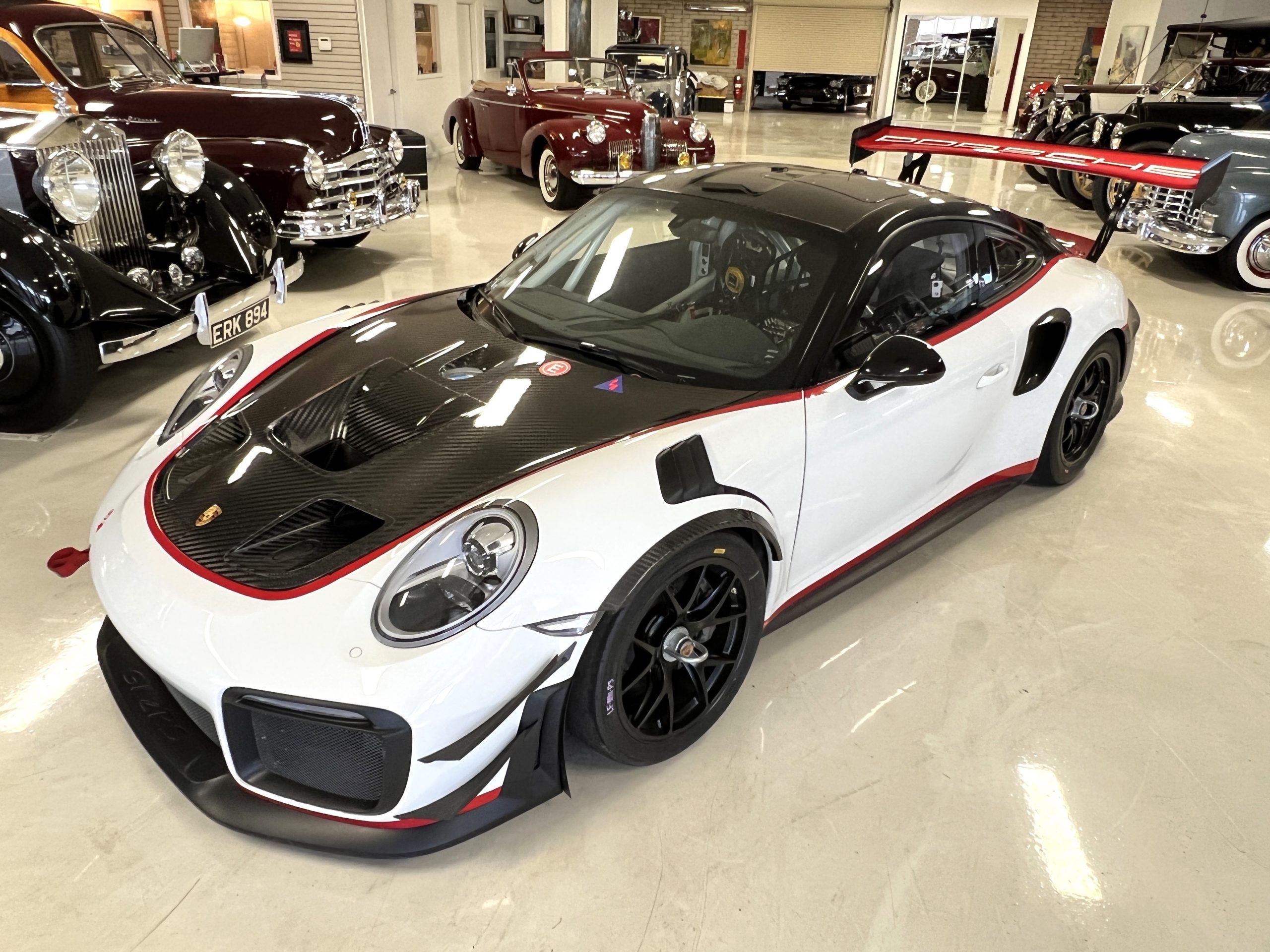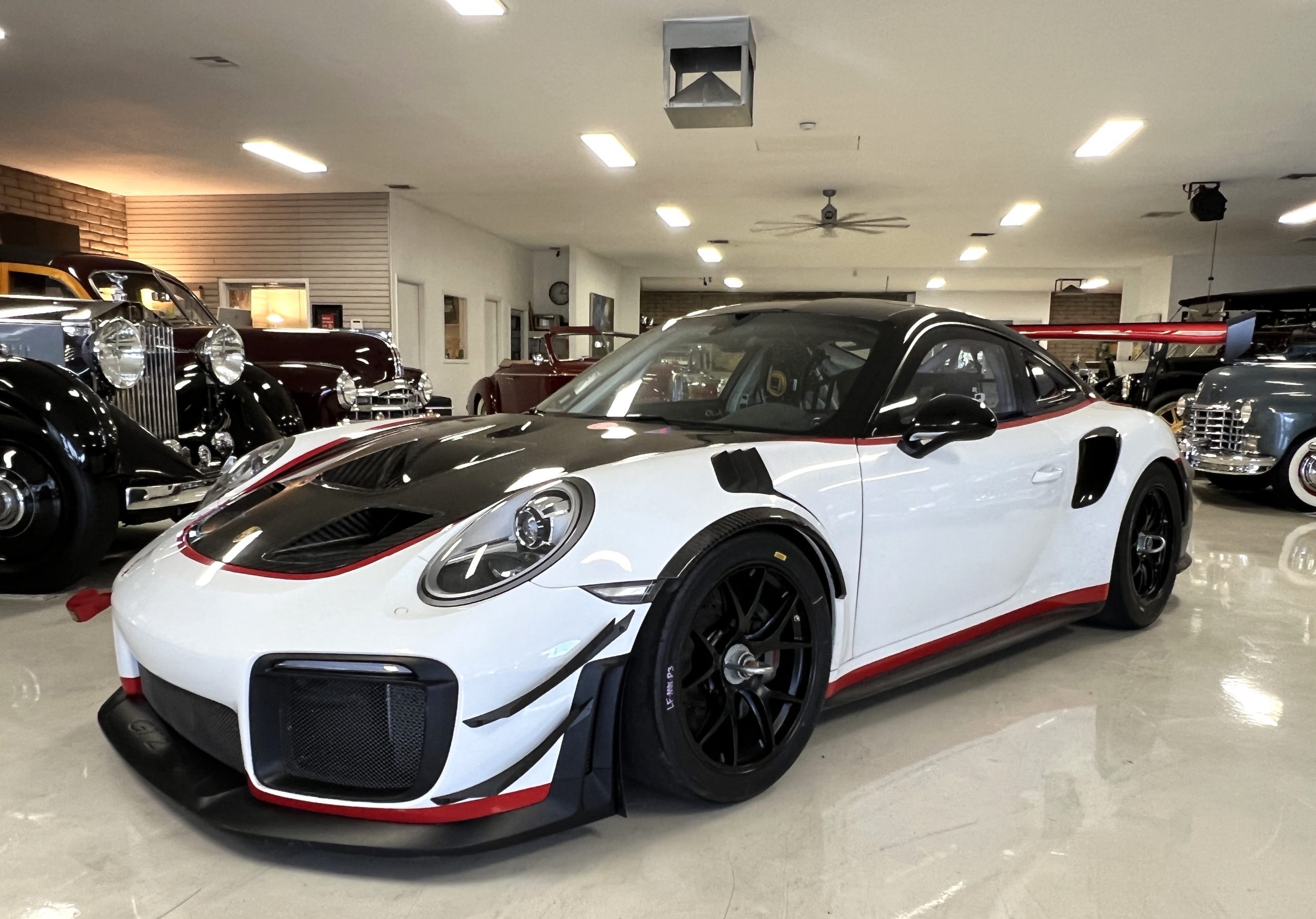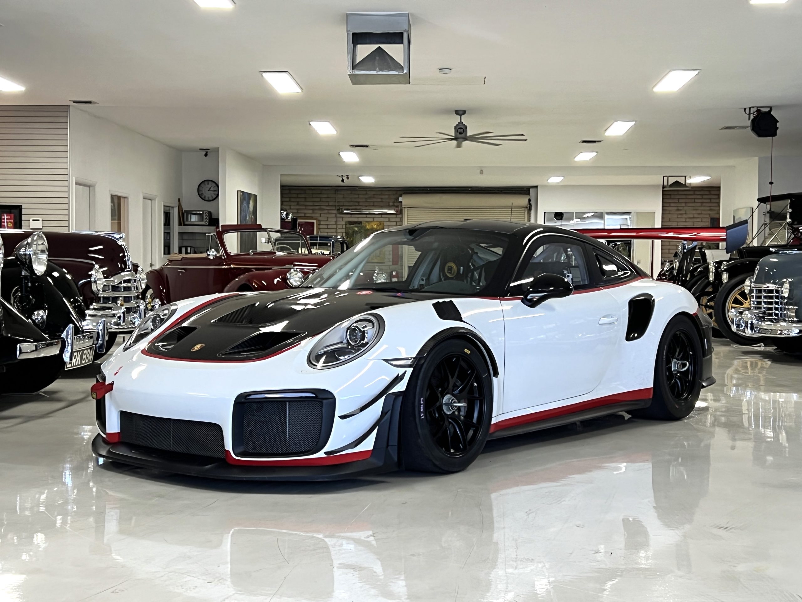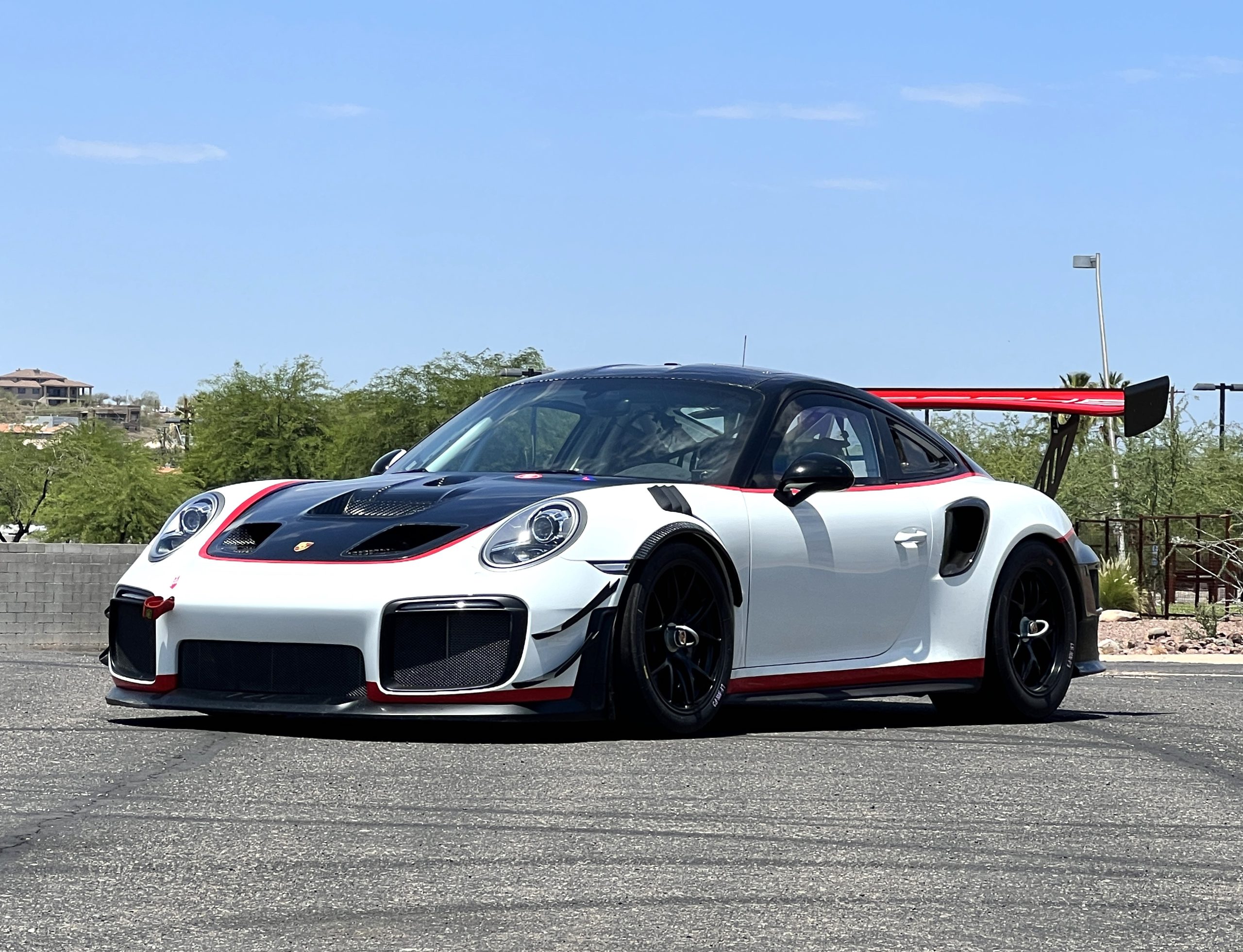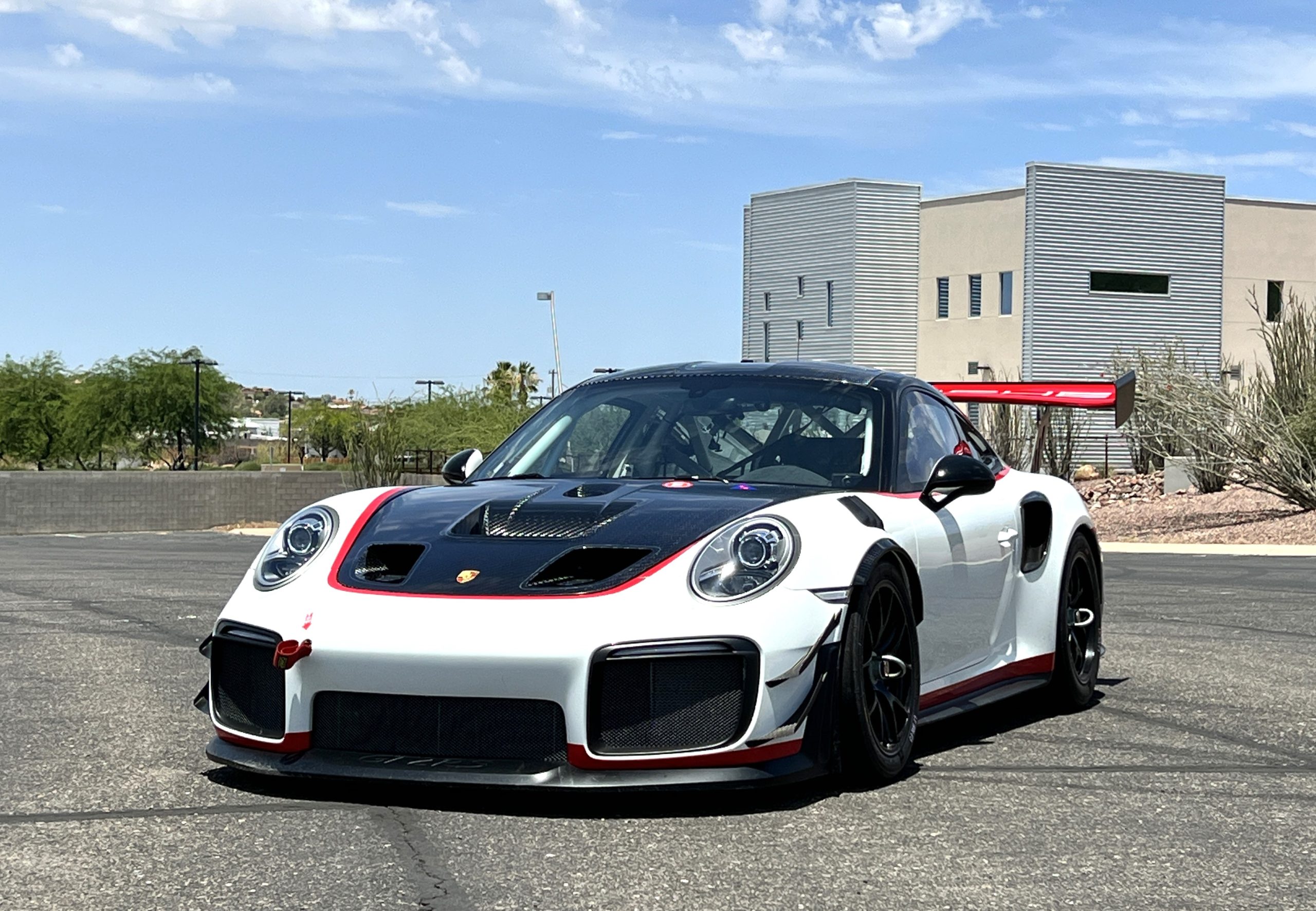 This 2019 Porsche 911 GT2 RS is #99 of 200 track-only Clubsport models built for the model year and was purchased new by the current owner in October 2019. The lightweight body panels are finished in white with red accents over a factory-stripped interior with an integrated safety cage, and power comes from a twin-turbocharged 3.8L flat-six paired with a seven-speed PDK dual-clutch transaxle and a limited-slip differential. Equipment includes a carbon-fiber hood, decklid, rear wing, and roof panel with a removable escape hatch as well as an air-jack system, 18″ forged wheels, a fire-suppression system, a single Recaro seat, a Schroth six-point harness, and air conditioning. Modifications consist of a two-camera VBOX Video HD2 track package, a Teradek live stream system, a Coolshirt system, a Maglock fresh air helmet system, and an intercom. This 991 GT2 RS Clubsport has 4,500 kilometers (~2,800 miles) and is now offered on dealer consignment in Arizona with original purchase paperwork, spare parts, a fitted car cover, and a bill of sale.