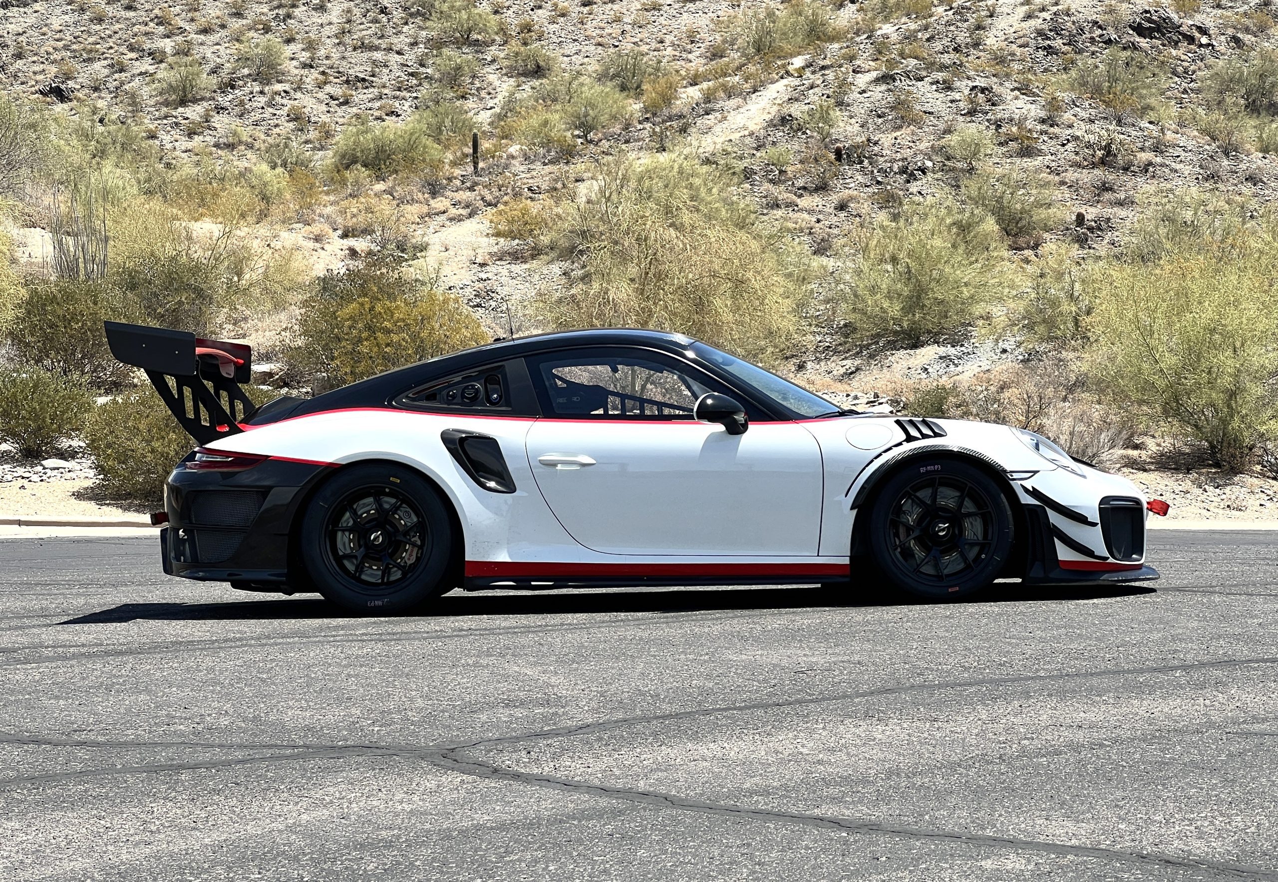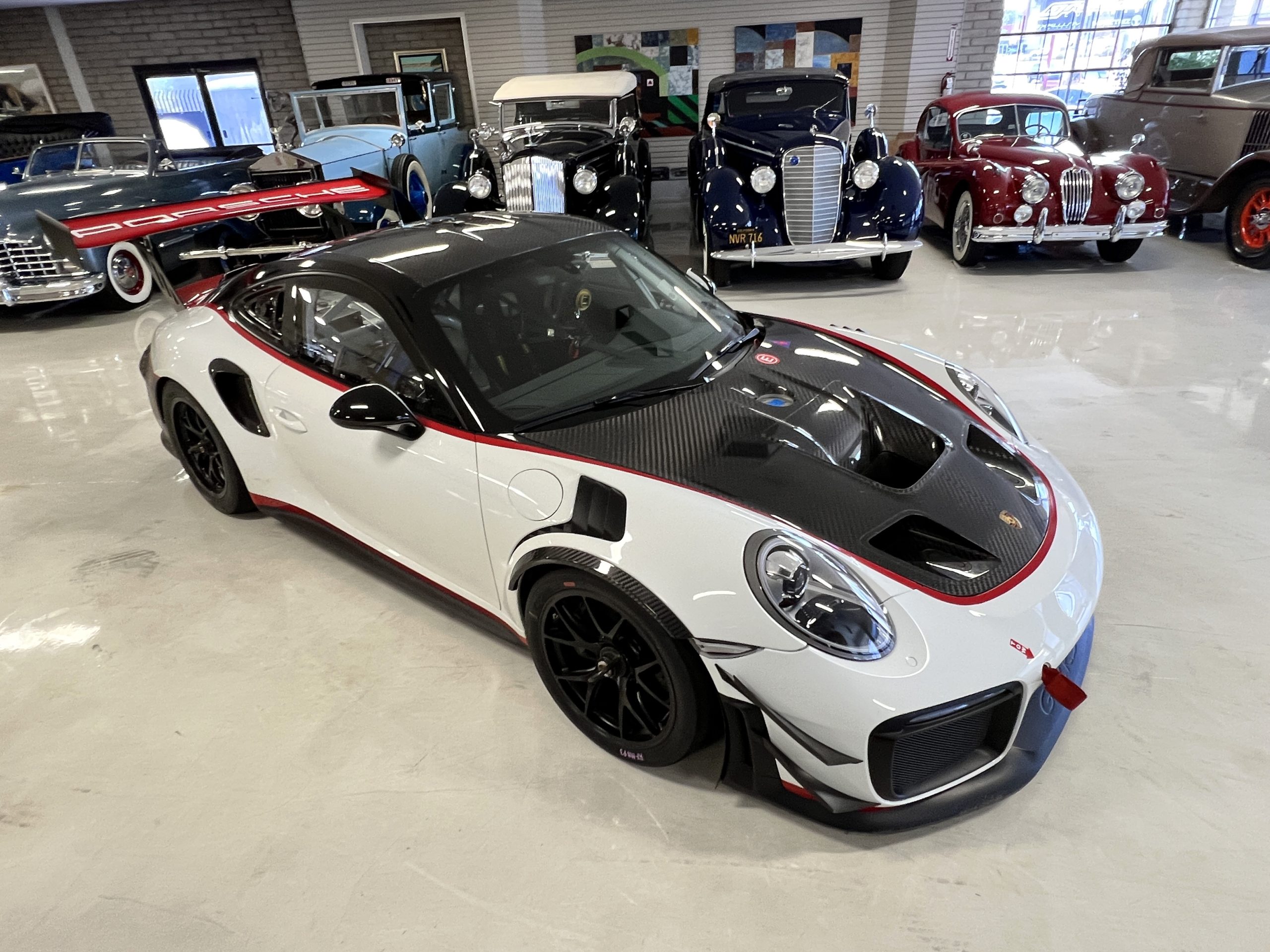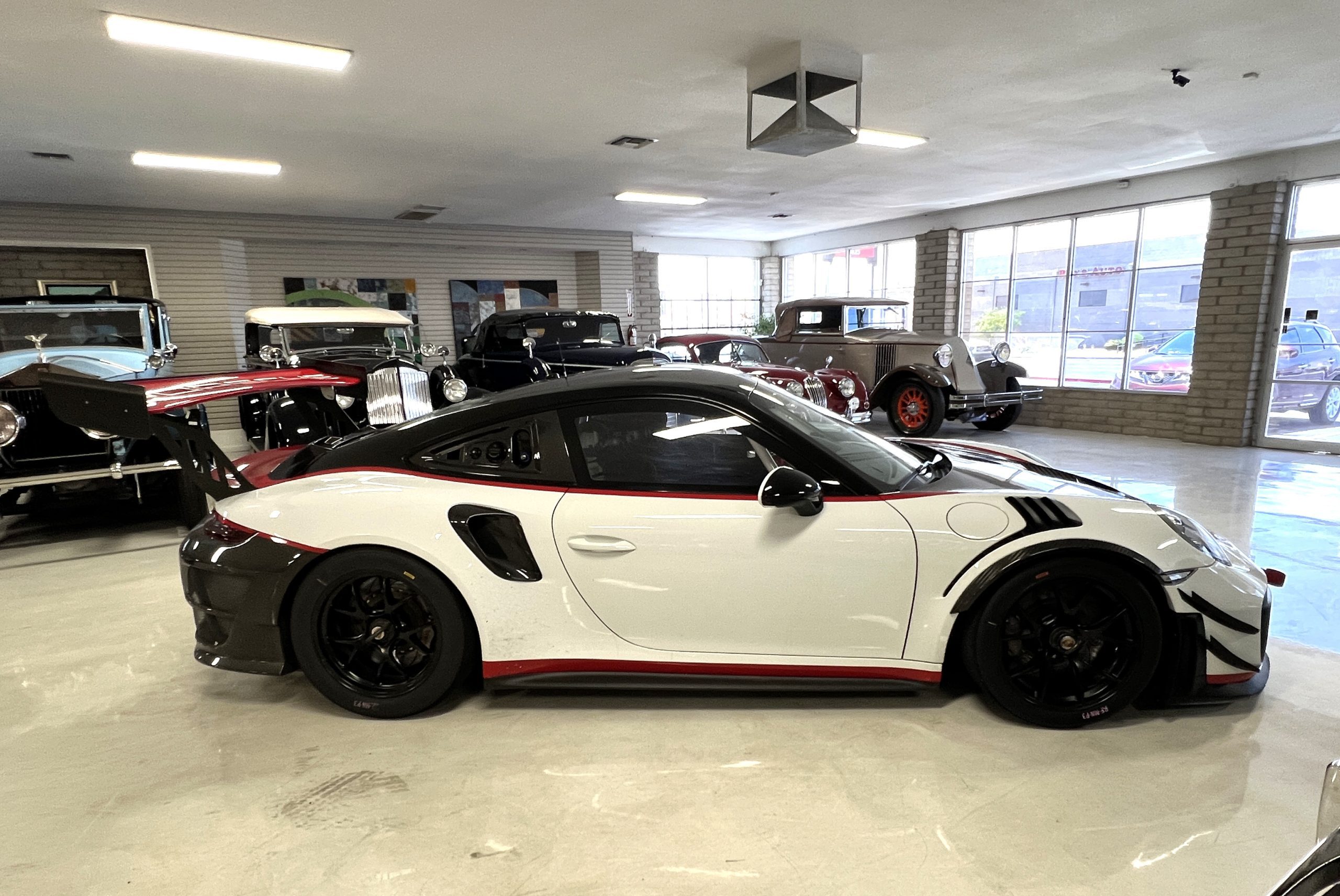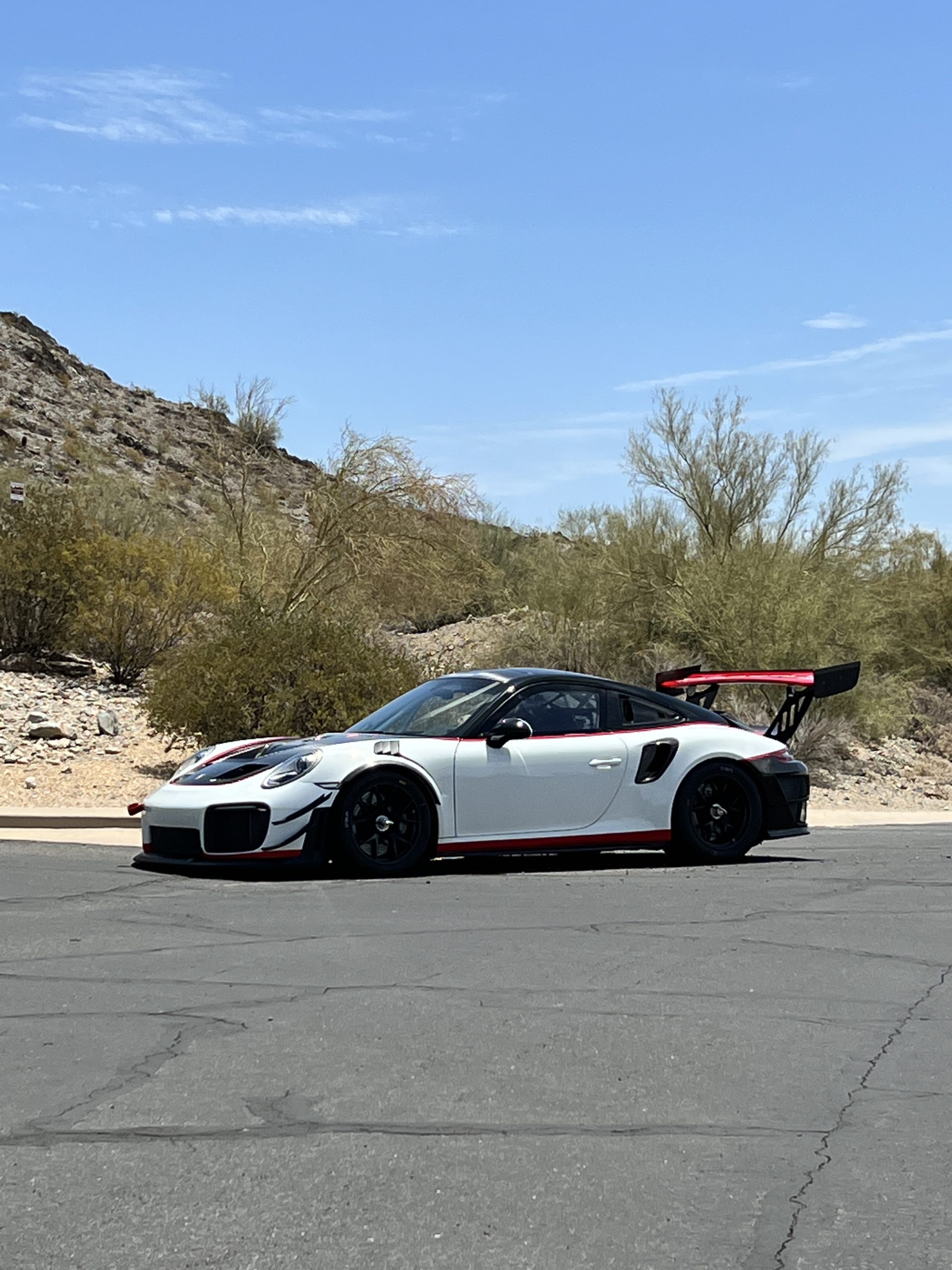 This 2019 Porsche 911 GT2 RS is #99 of 200 track-only Clubsport models built for the model year and was purchased new by the current owner in October 2019. The lightweight body panels are finished in white with red accents over a factory-stripped interior with an integrated safety cage, and power comes from a twin-turbocharged 3.8L flat-six paired with a seven-speed PDK dual-clutch transaxle and a limited-slip differential. Equipment includes a carbon-fiber hood, decklid, rear wing, and roof panel with a removable escape hatch as well as an air-jack system, 18″ forged wheels, a fire-suppression system, a single Recaro seat, a Schroth six-point harness, and air conditioning. Modifications consist of a two-camera VBOX Video HD2 track package, a Teradek live stream system, a Coolshirt system, a Maglock fresh air helmet system, and an intercom. This 991 GT2 RS Clubsport has 4,500 kilometers (~2,800 miles) and is now offered on dealer consignment in Arizona with original purchase paperwork, spare parts, a fitted car cover, and a bill of sale.