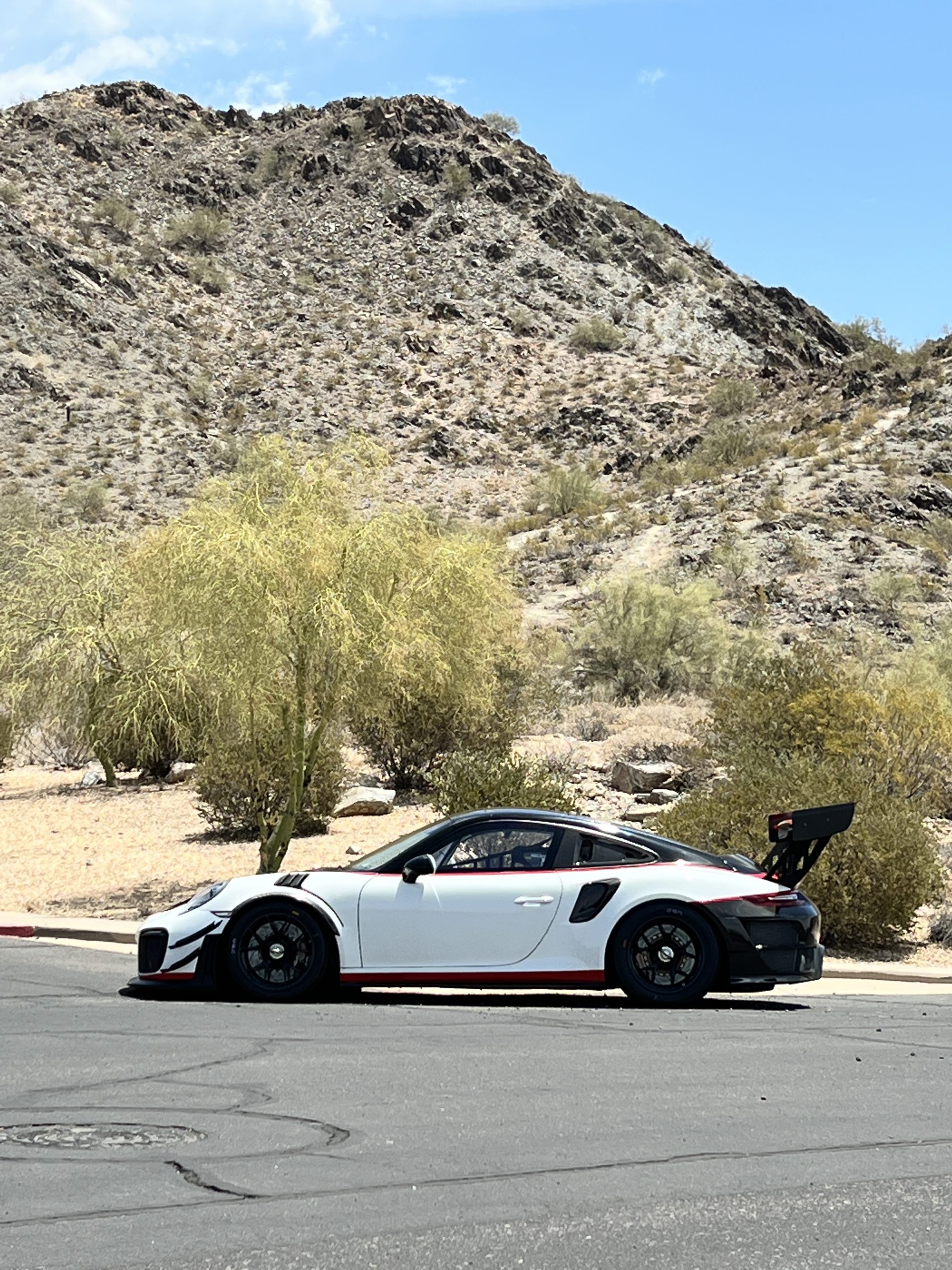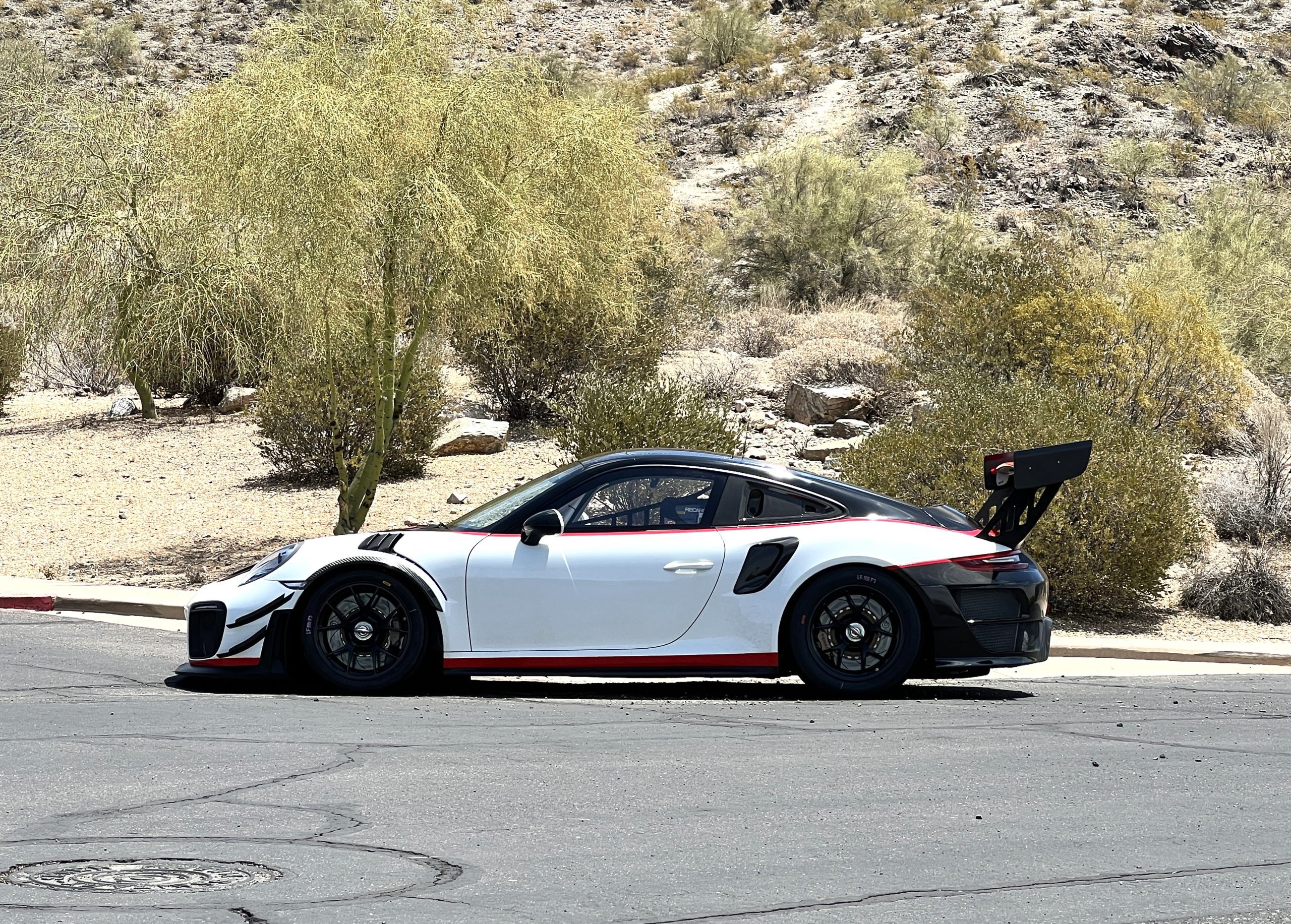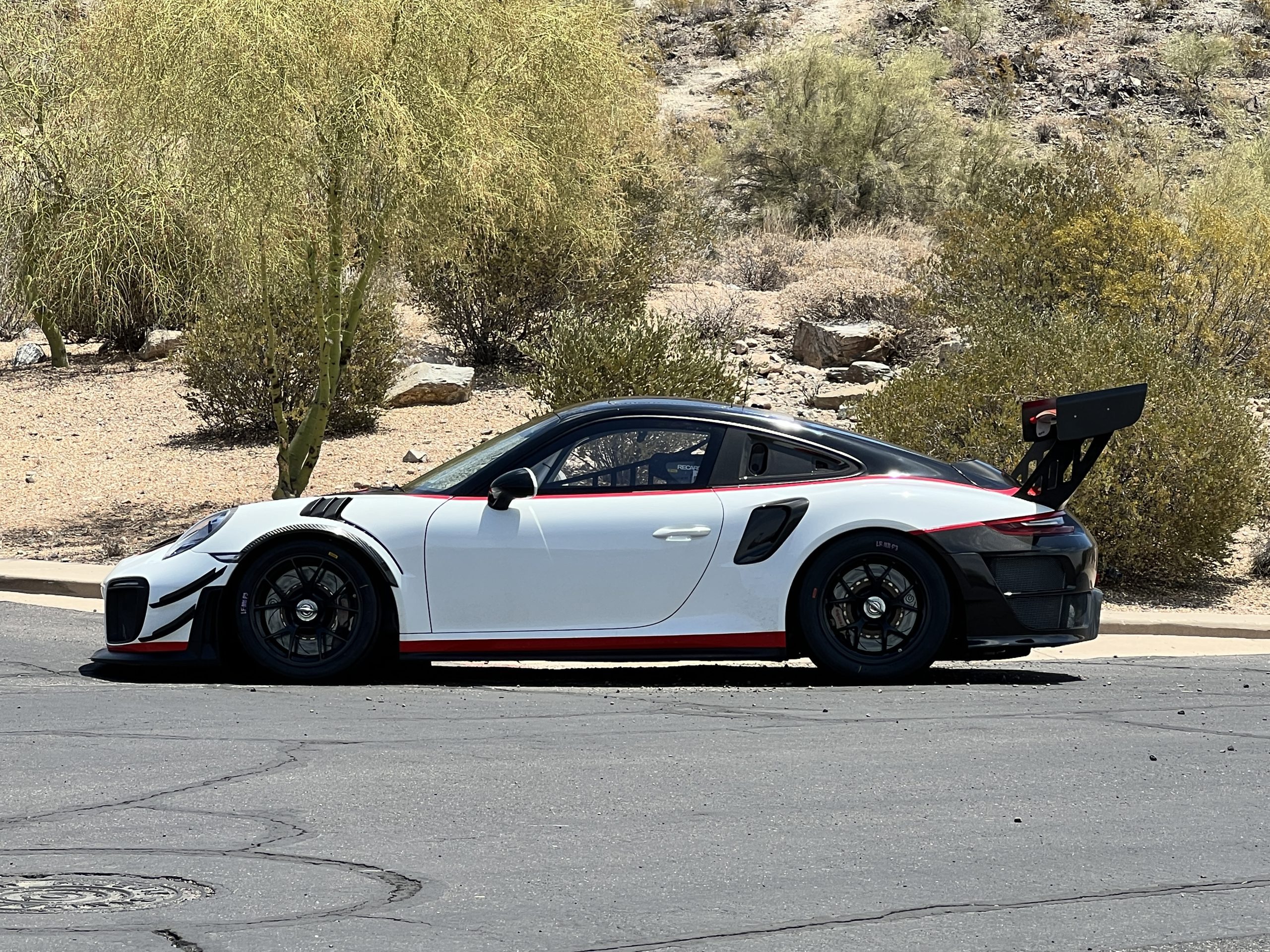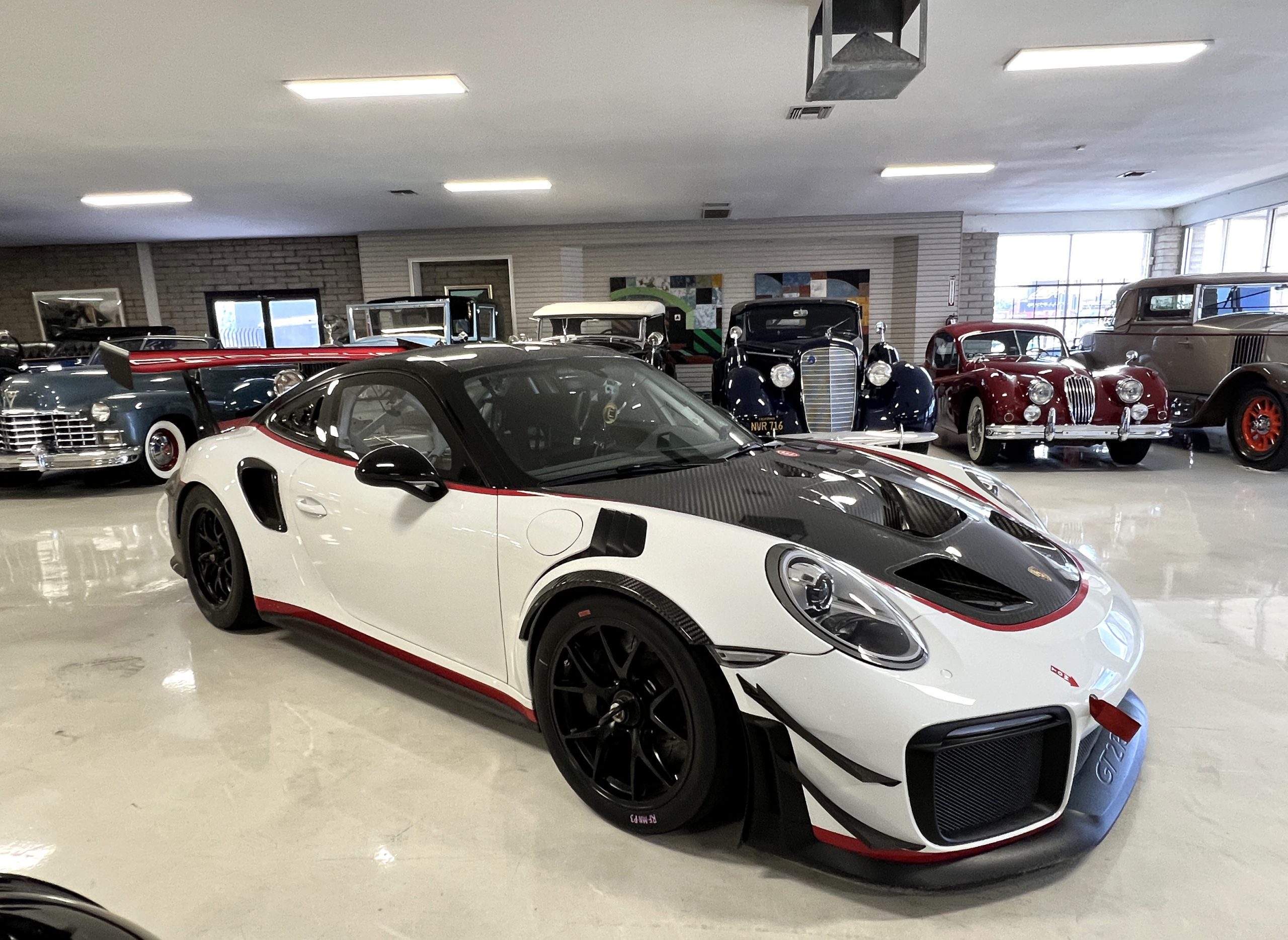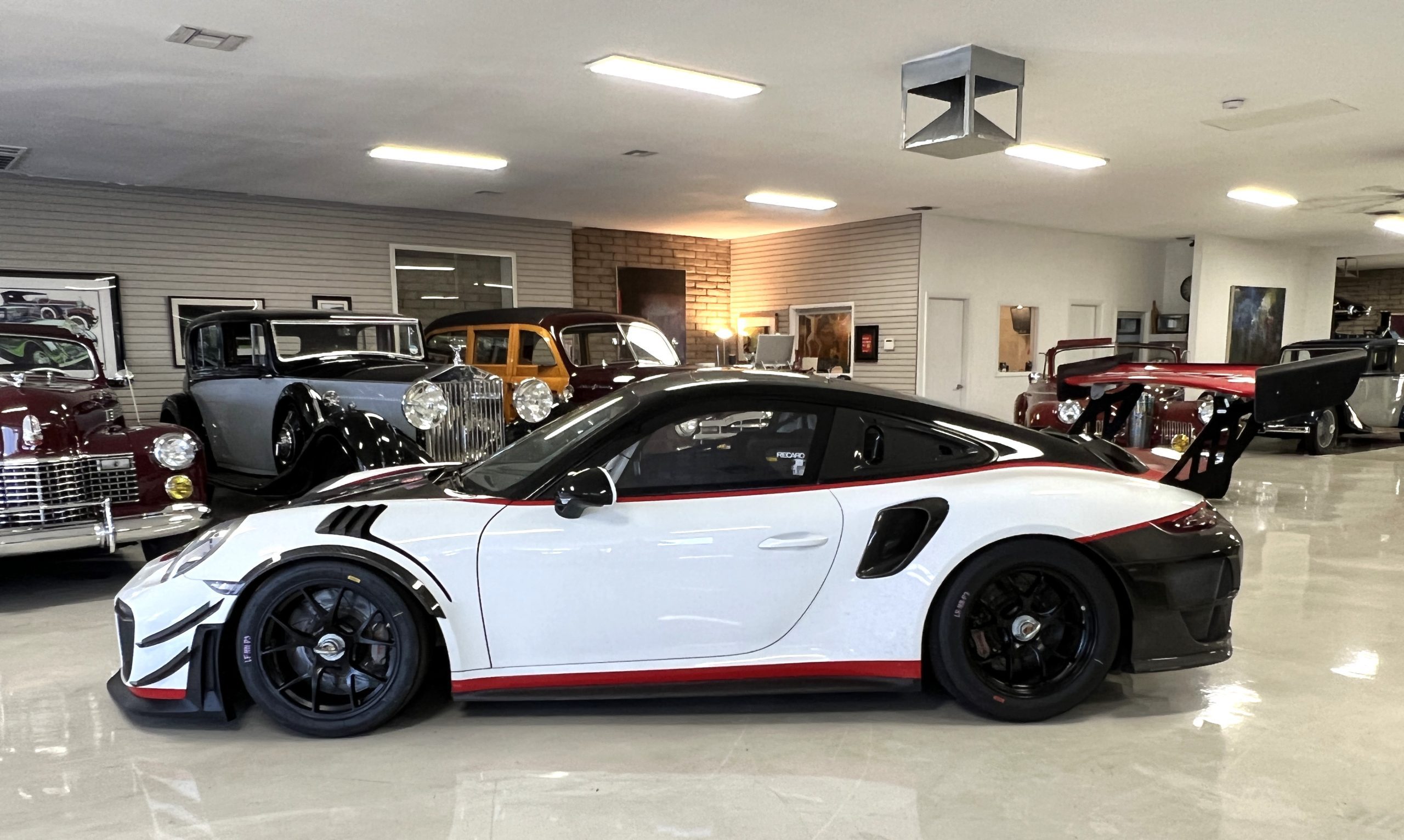 This 2019 Porsche 911 GT2 RS is #99 of 200 track-only Clubsport models built for the model year and was purchased new by the current owner in October 2019. The lightweight body panels are finished in white with red accents over a factory-stripped interior with an integrated safety cage, and power comes from a twin-turbocharged 3.8L flat-six paired with a seven-speed PDK dual-clutch transaxle and a limited-slip differential. Equipment includes a carbon-fiber hood, decklid, rear wing, and roof panel with a removable escape hatch as well as an air-jack system, 18″ forged wheels, a fire-suppression system, a single Recaro seat, a Schroth six-point harness, and air conditioning. Modifications consist of a two-camera VBOX Video HD2 track package, a Teradek live stream system, a Coolshirt system, a Maglock fresh air helmet system, and an intercom. This 991 GT2 RS Clubsport has 4,500 kilometers (~2,800 miles) and is now offered on dealer consignment in Arizona with original purchase paperwork, spare parts, a fitted car cover, and a bill of sale.
