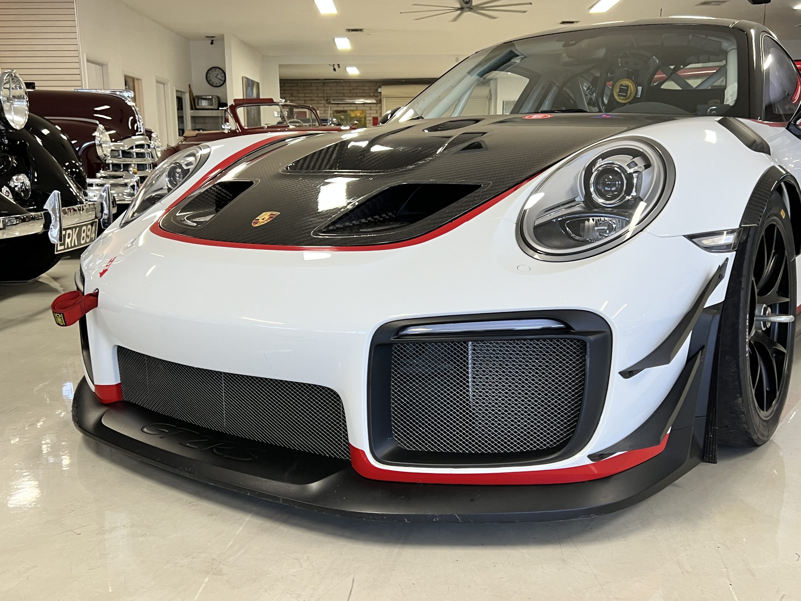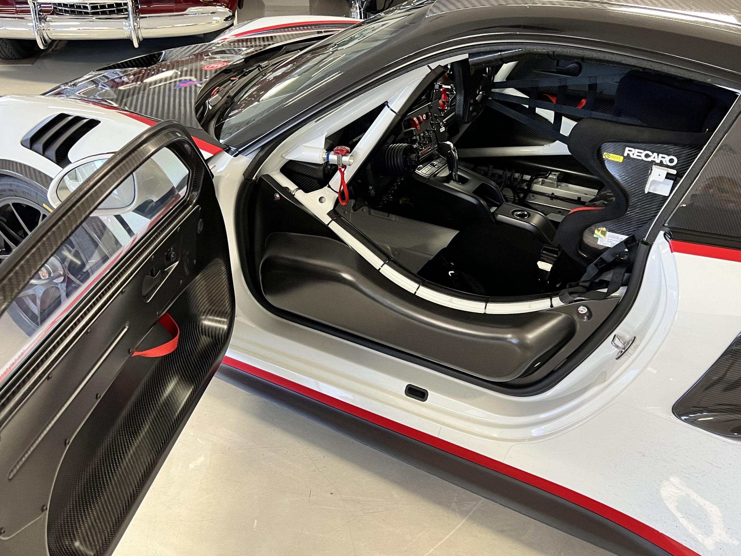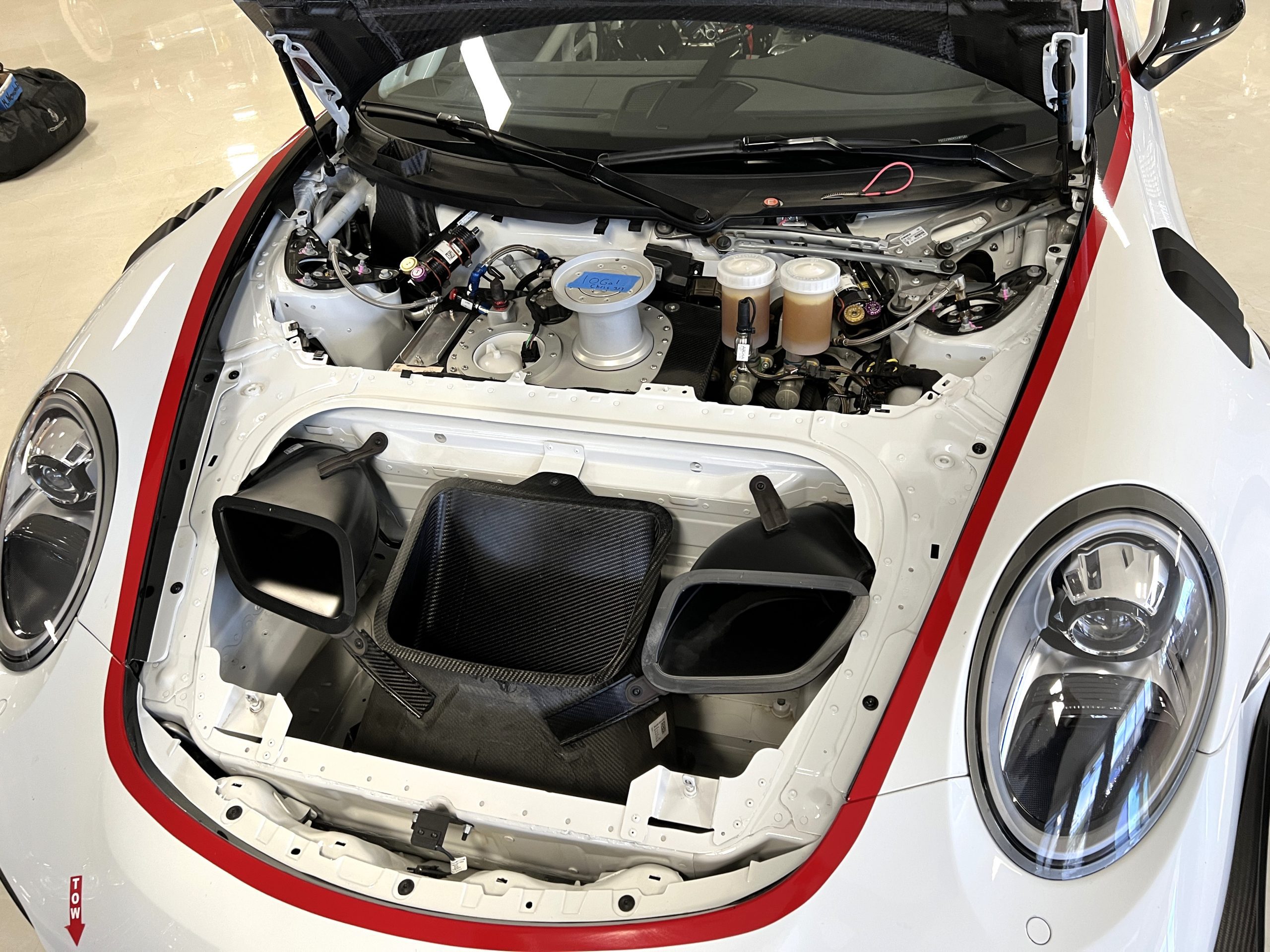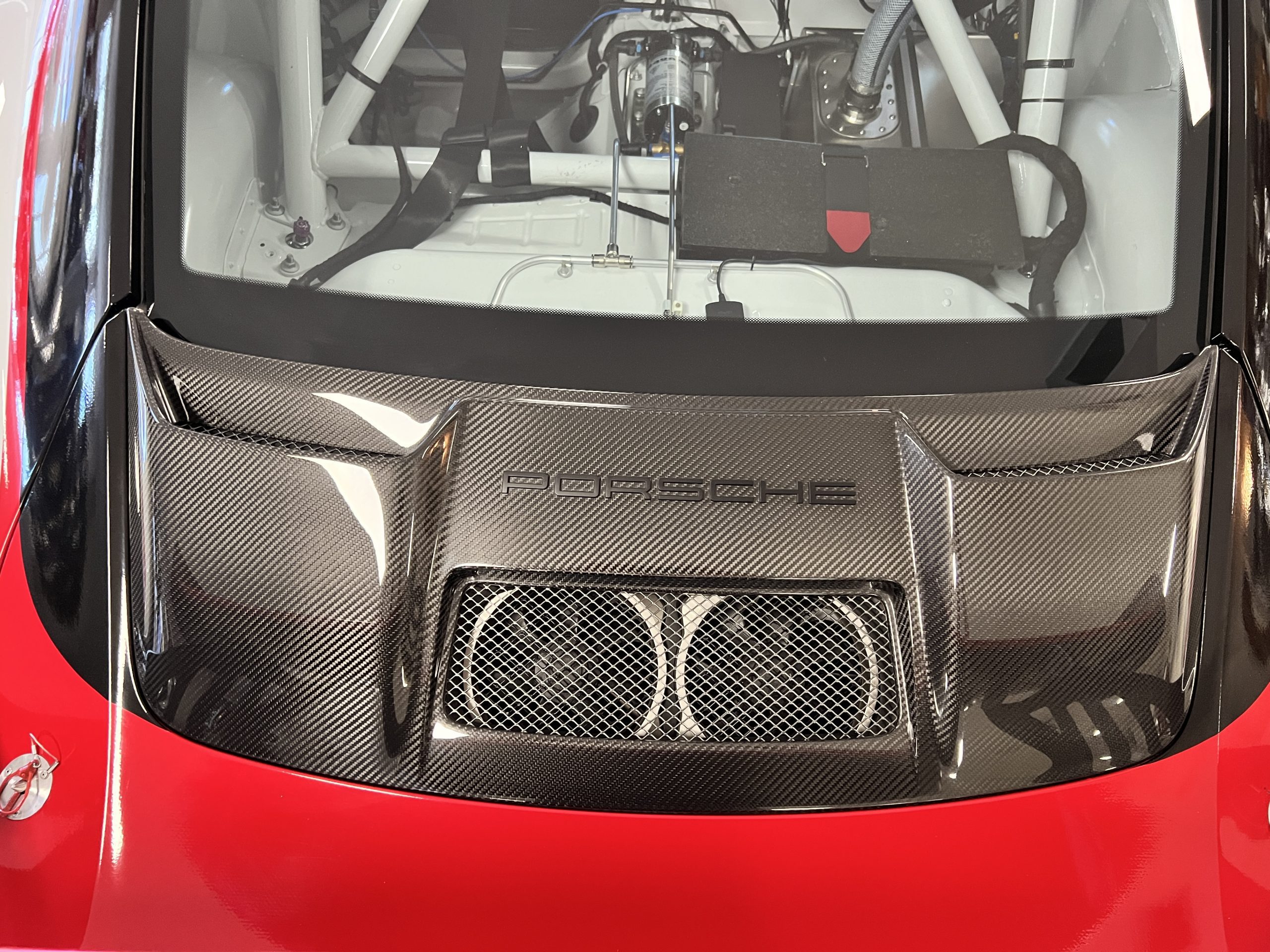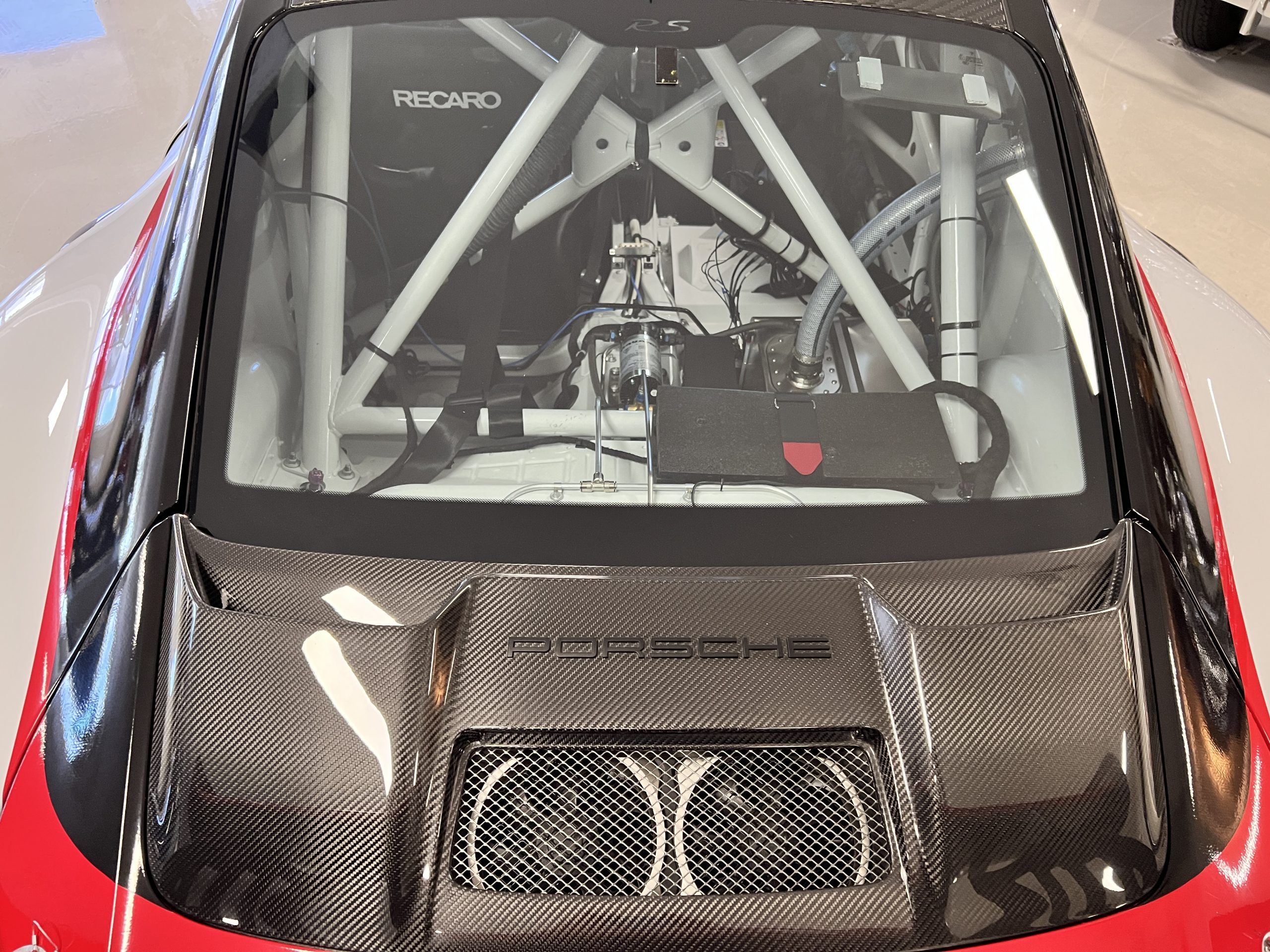 All 991 GT2 RS Clubsport models were factory finished in white (9CA) over an aluminum-steel composite frame with a carbon-fiber front hood, front fenders, front fender extenders, doors, rear decklid, a motorsport wing, front dive planes, a roof panel with a removable escape hatch, air intakes, and rear bumper cover. This example features an exposed carbon-fiber roof as well as red accents. Additional equipment includes a hood-mounted filler cap for the 30-gallon fuel cell, a front cowl-mounted electrical cutoff switch, a passenger-side panel port for the five-gallon turbo intercooler distilled water tank, and front and rear OMP tow straps.