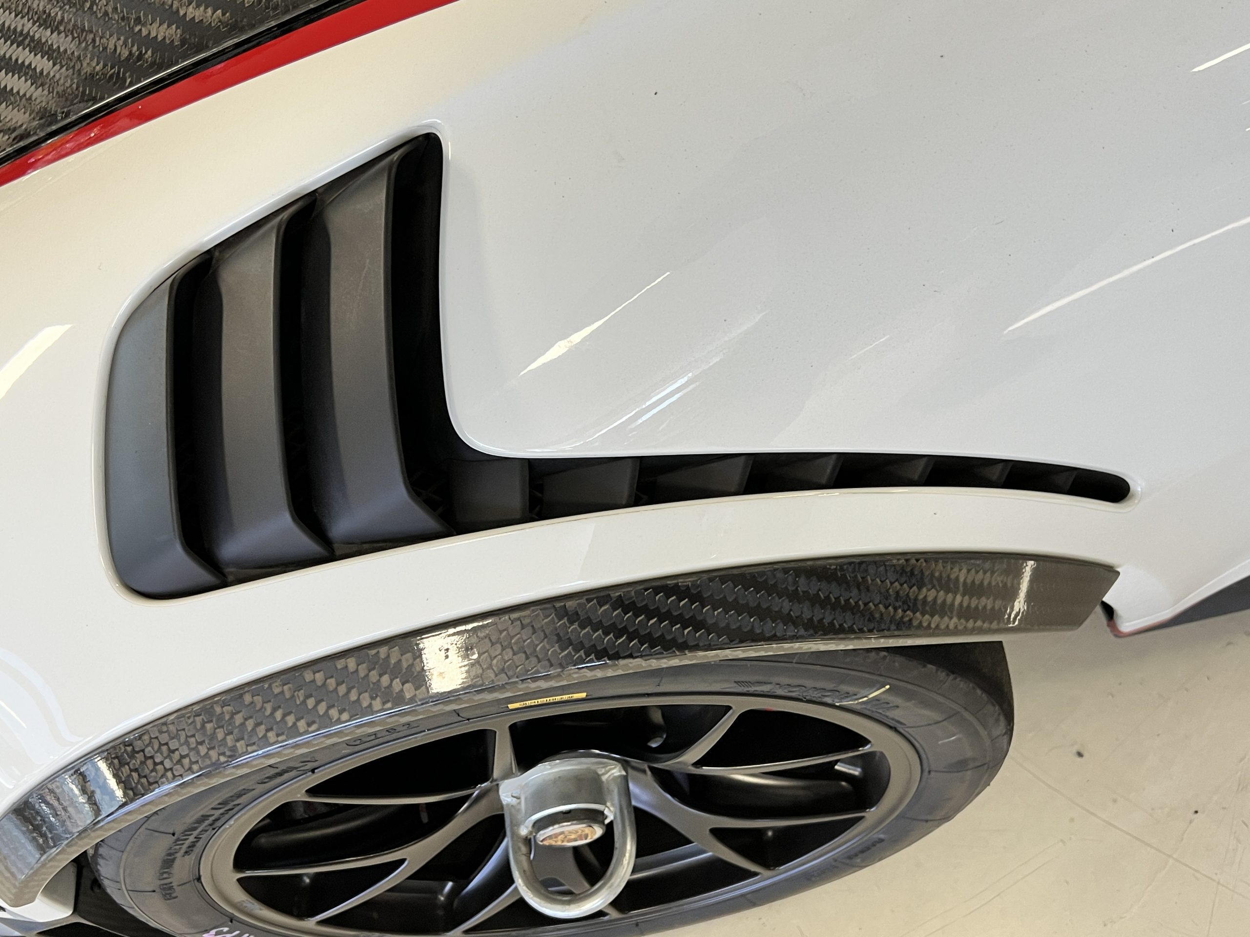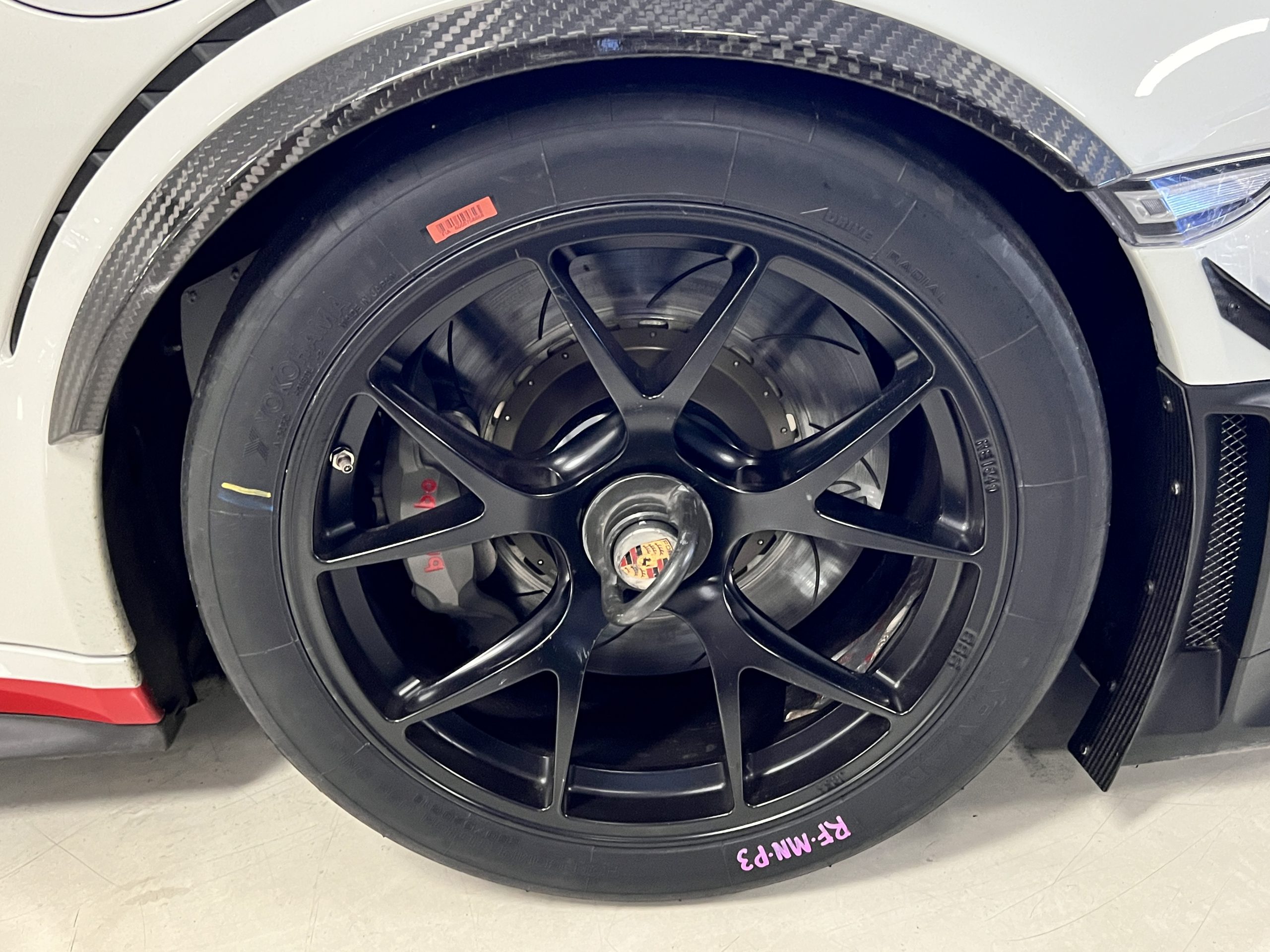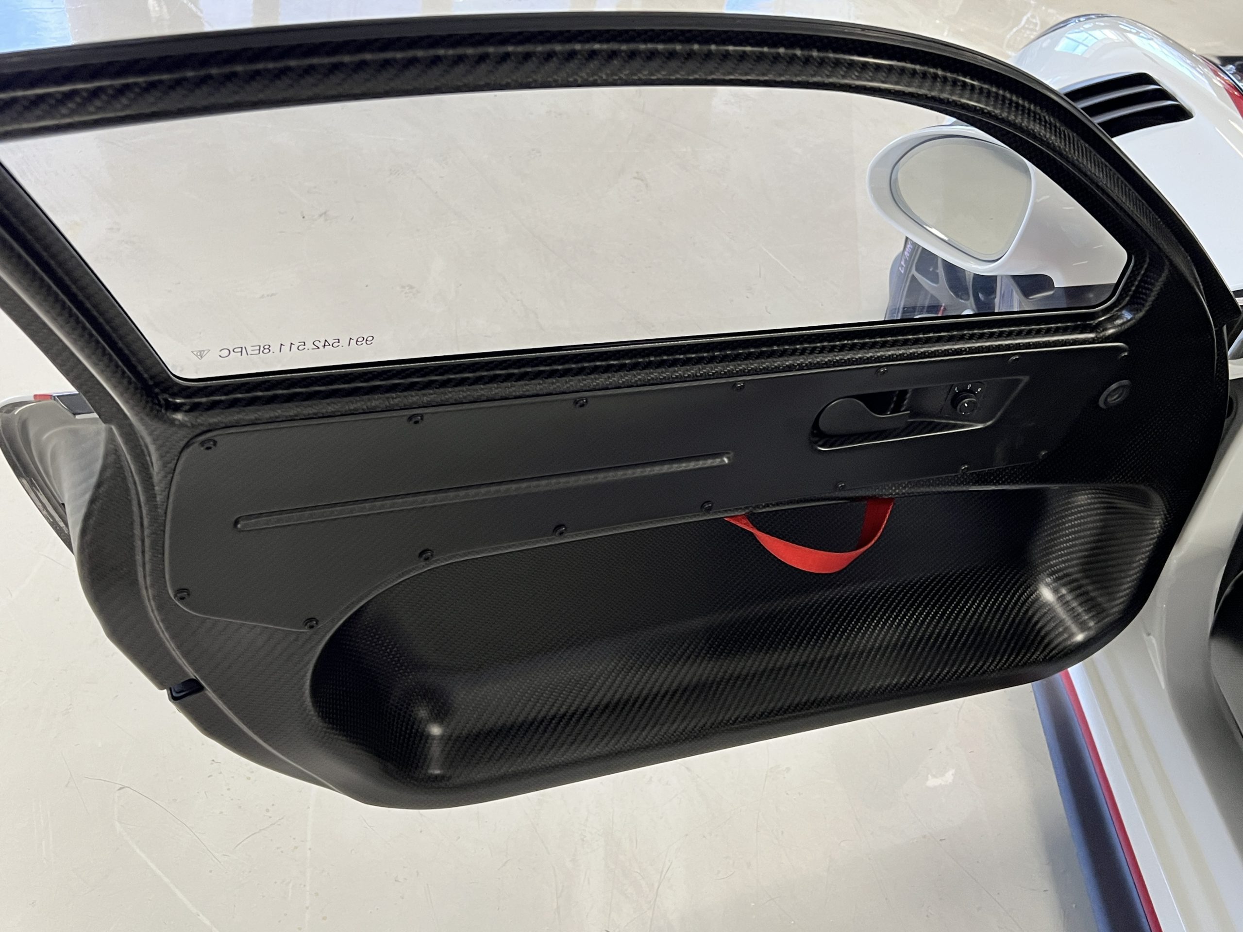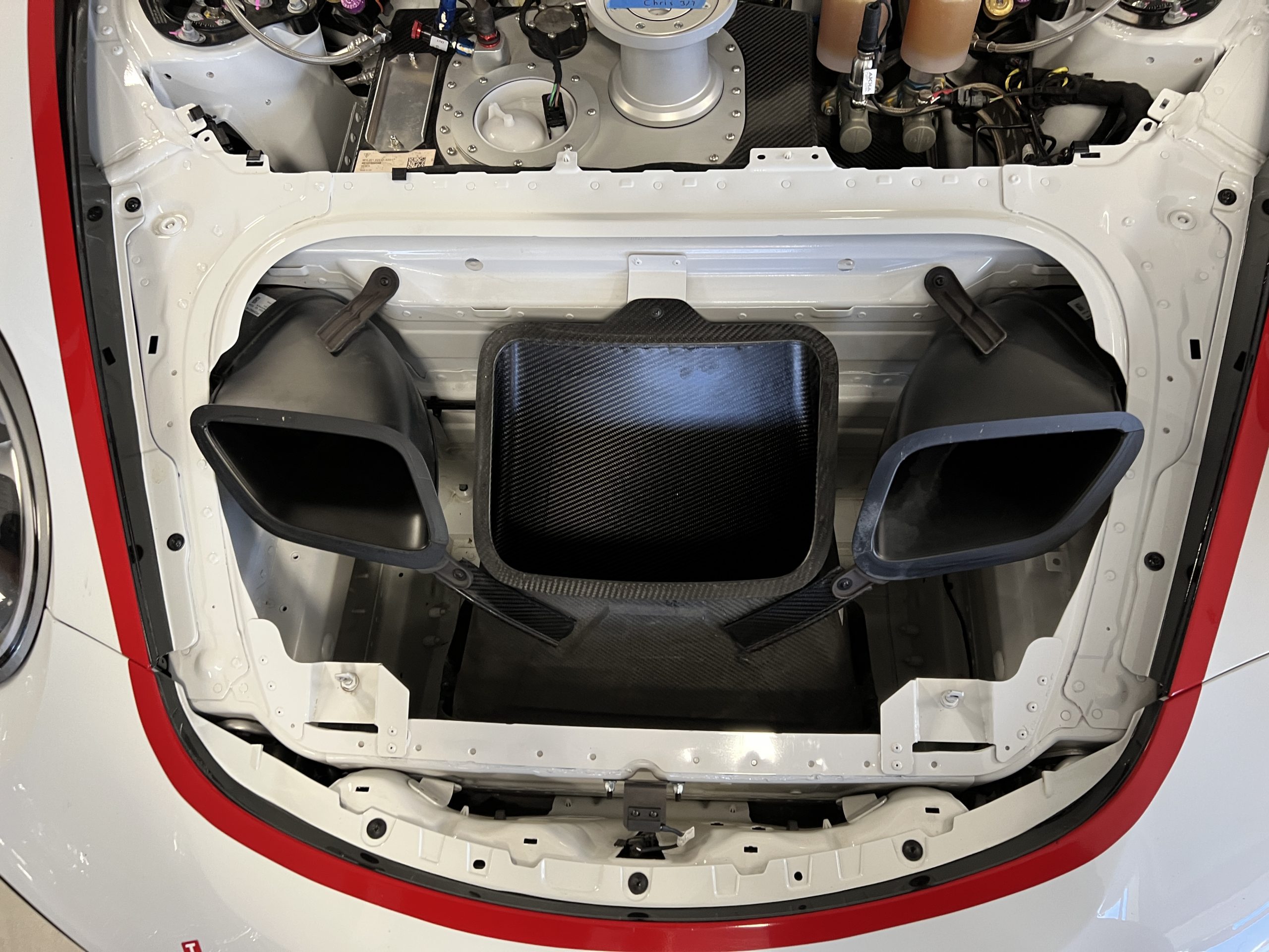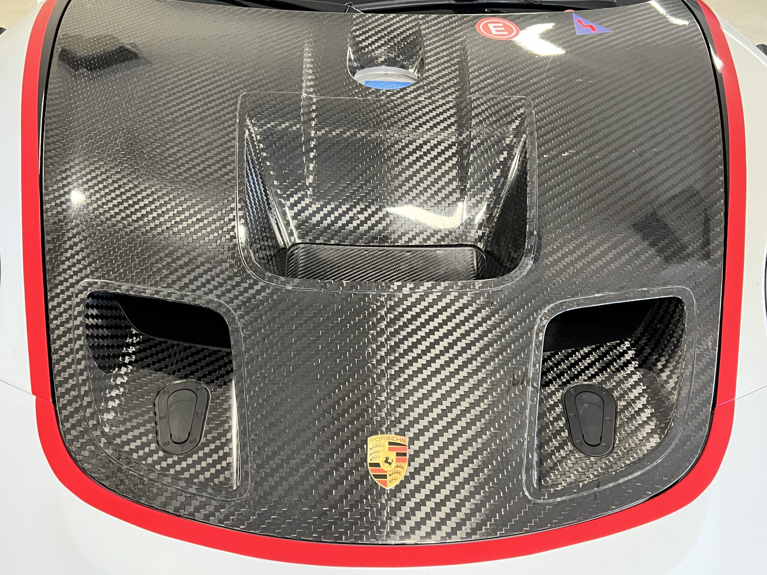 All 991 GT2 RS Clubsport models were factory finished in white (9CA) over an aluminum-steel composite frame with a carbon-fiber front hood, front fenders, front fender extenders, doors, rear decklid, a motorsport wing, front dive planes, a roof panel with a removable escape hatch, air intakes, and rear bumper cover. This example features an exposed carbon-fiber roof as well as red accents. Additional equipment includes a hood-mounted filler cap for the 30-gallon fuel cell, a front cowl-mounted electrical cutoff switch, a passenger-side panel port for the five-gallon turbo intercooler distilled water tank, and front and rear OMP tow straps.