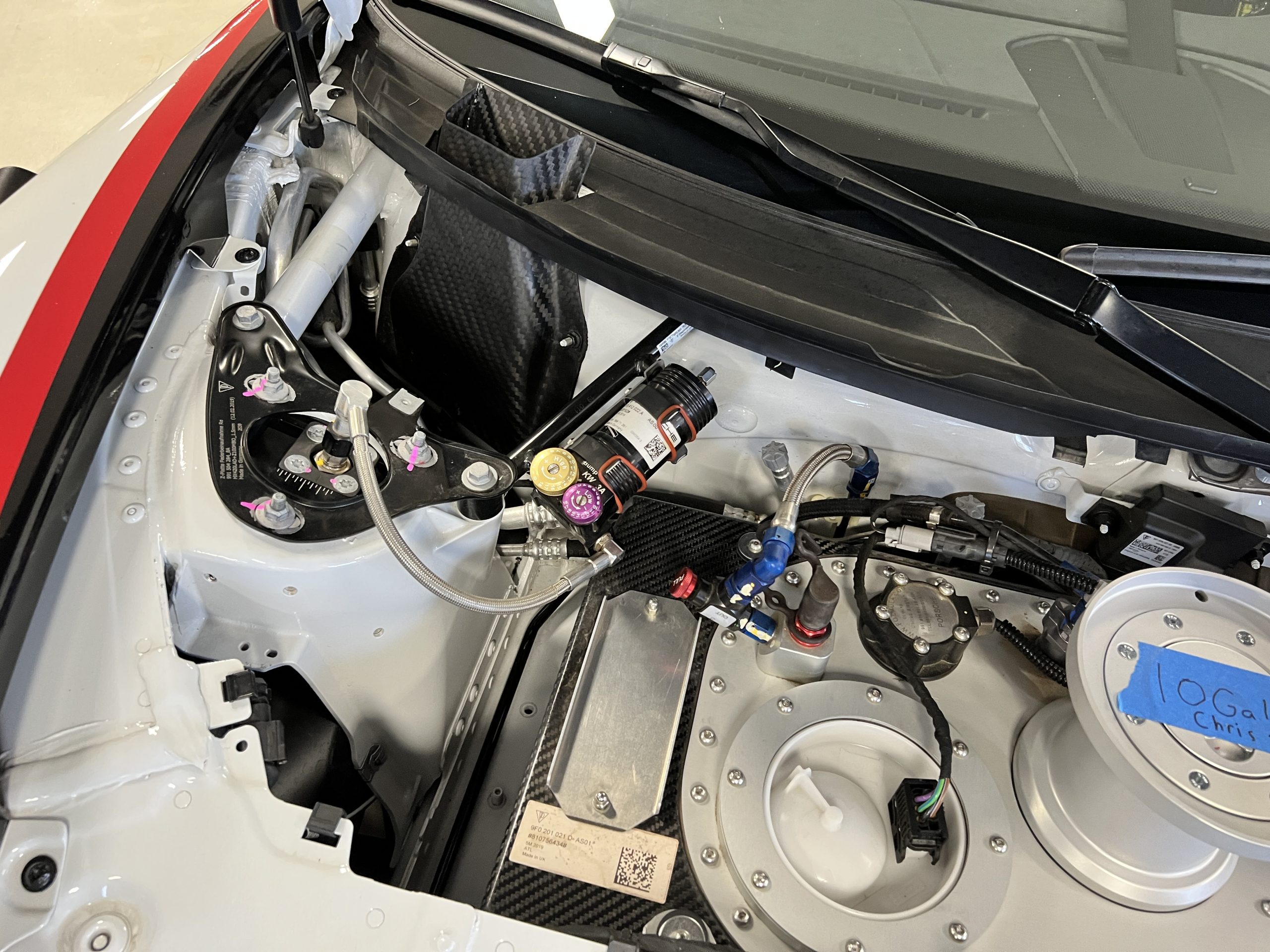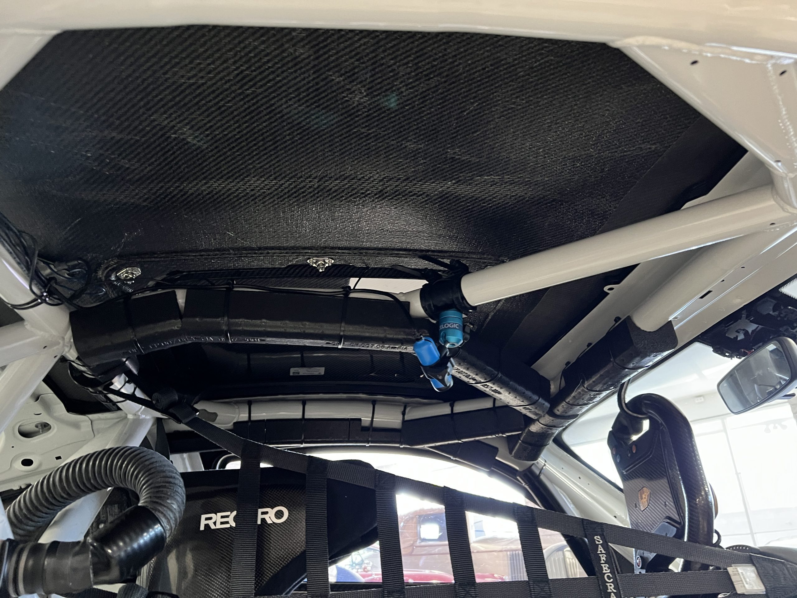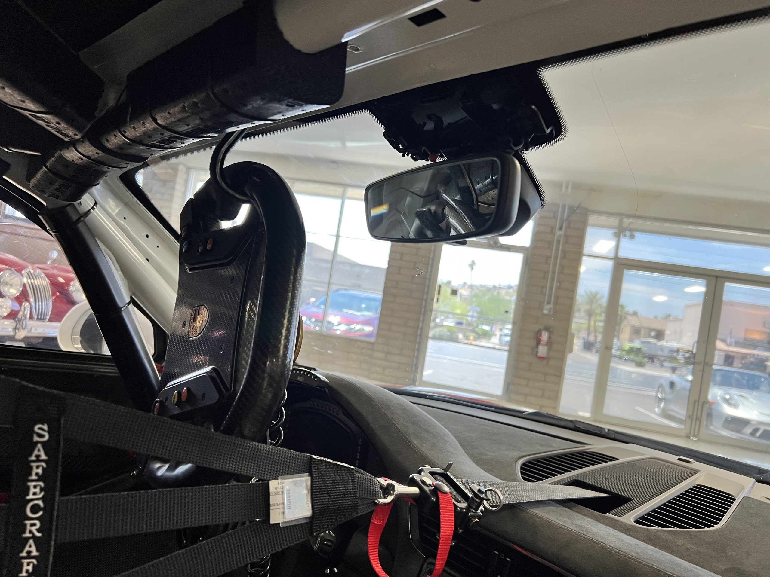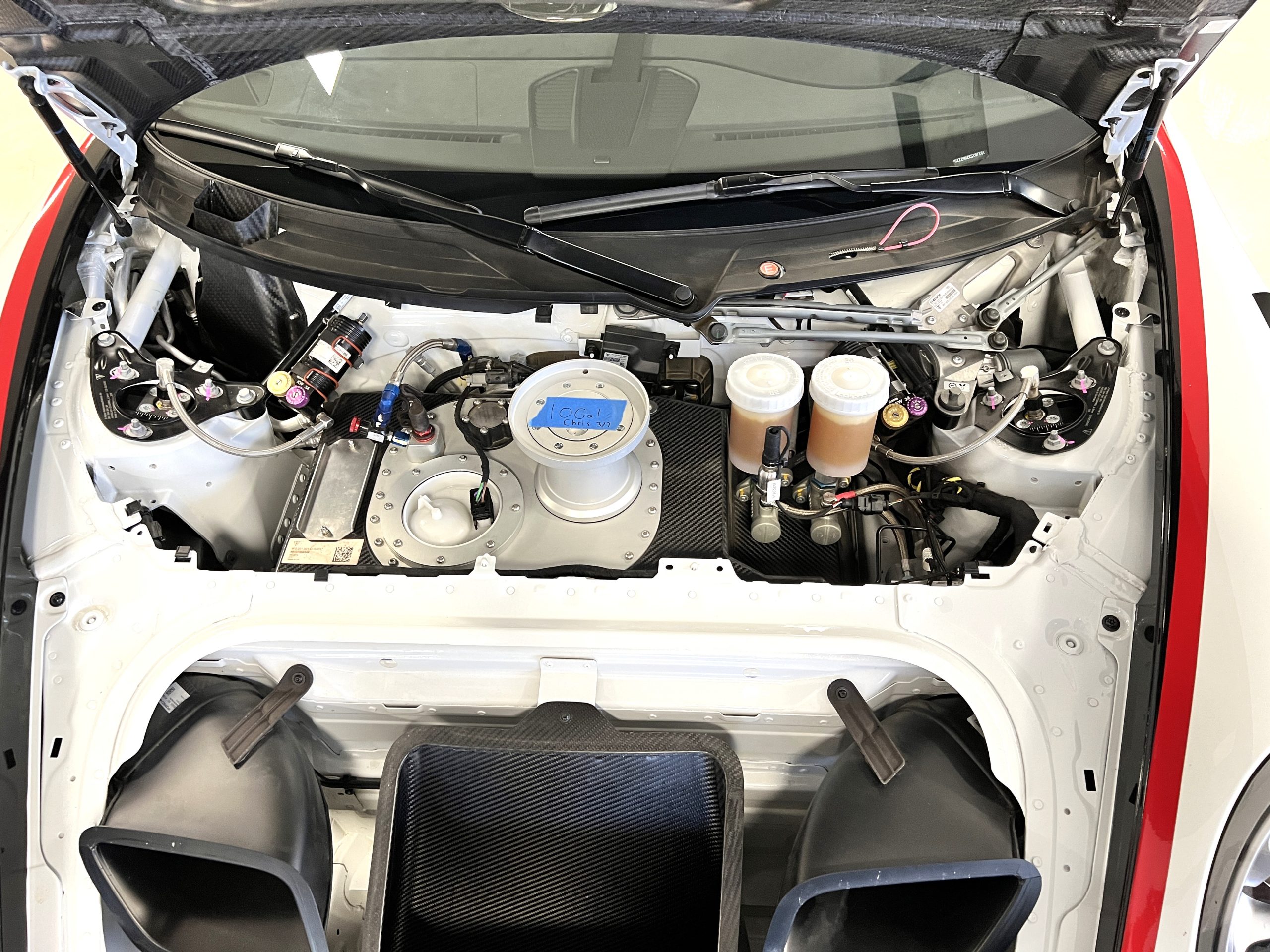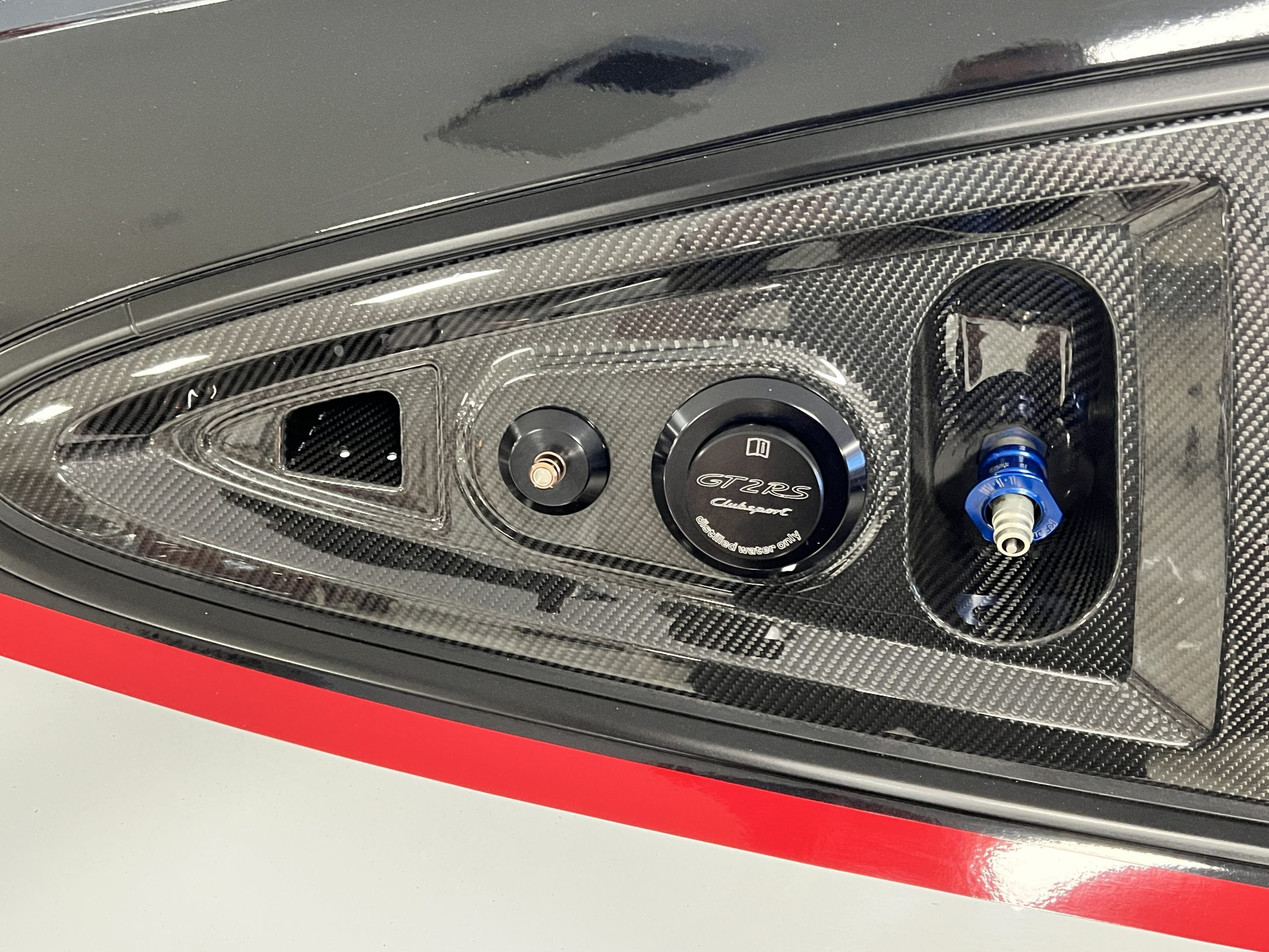 All 991 GT2 RS Clubsport models were factory finished in white (9CA) over an aluminum-steel composite frame with a carbon-fiber front hood, front fenders, front fender extenders, doors, rear decklid, a motorsport wing, front dive planes, a roof panel with a removable escape hatch, air intakes, and rear bumper cover. This example features an exposed carbon-fiber roof as well as red accents. Additional equipment includes a hood-mounted filler cap for the 30-gallon fuel cell, a front cowl-mounted electrical cutoff switch, a passenger-side panel port for the five-gallon turbo intercooler distilled water tank, and front and rear OMP tow straps.
