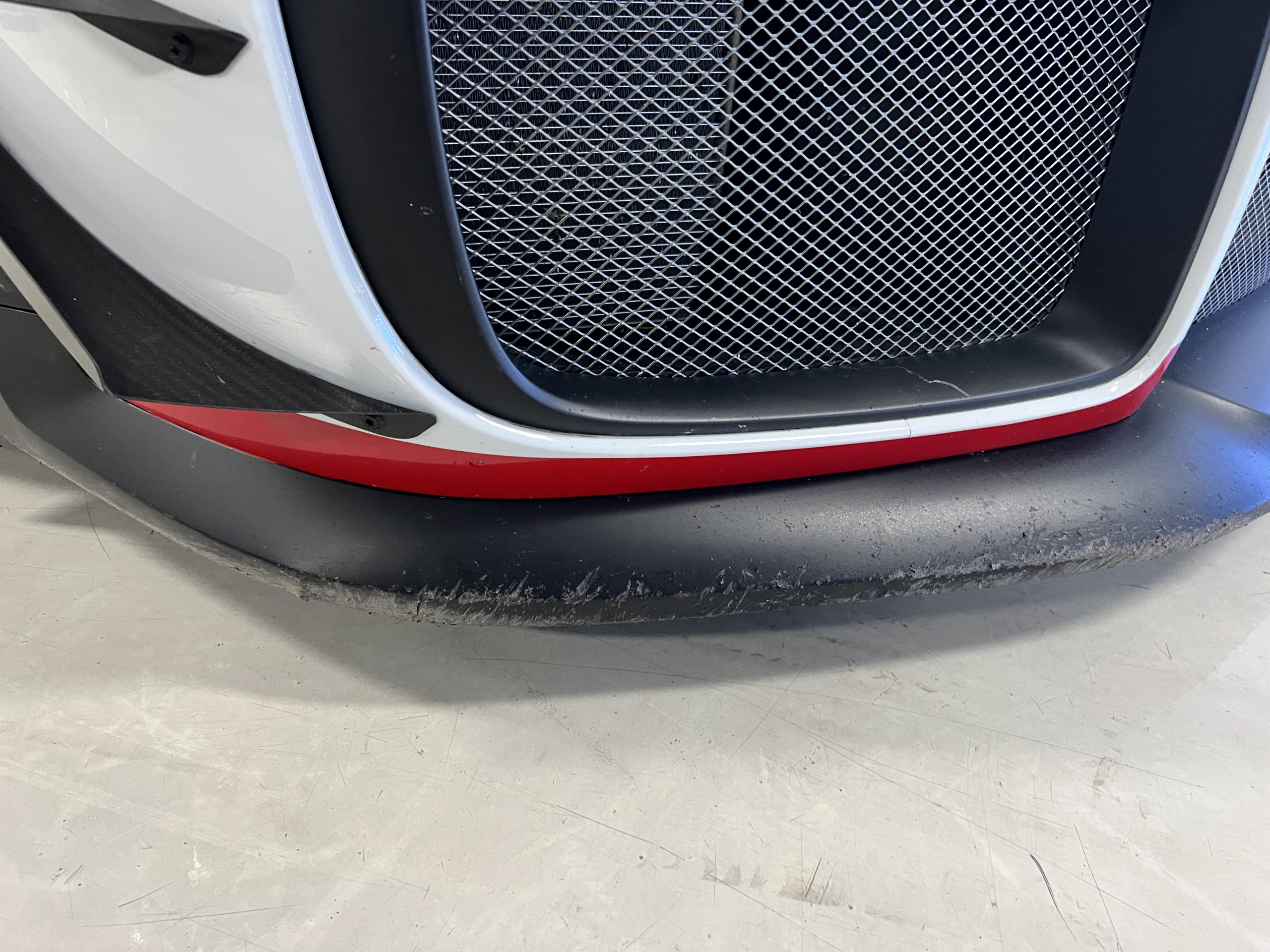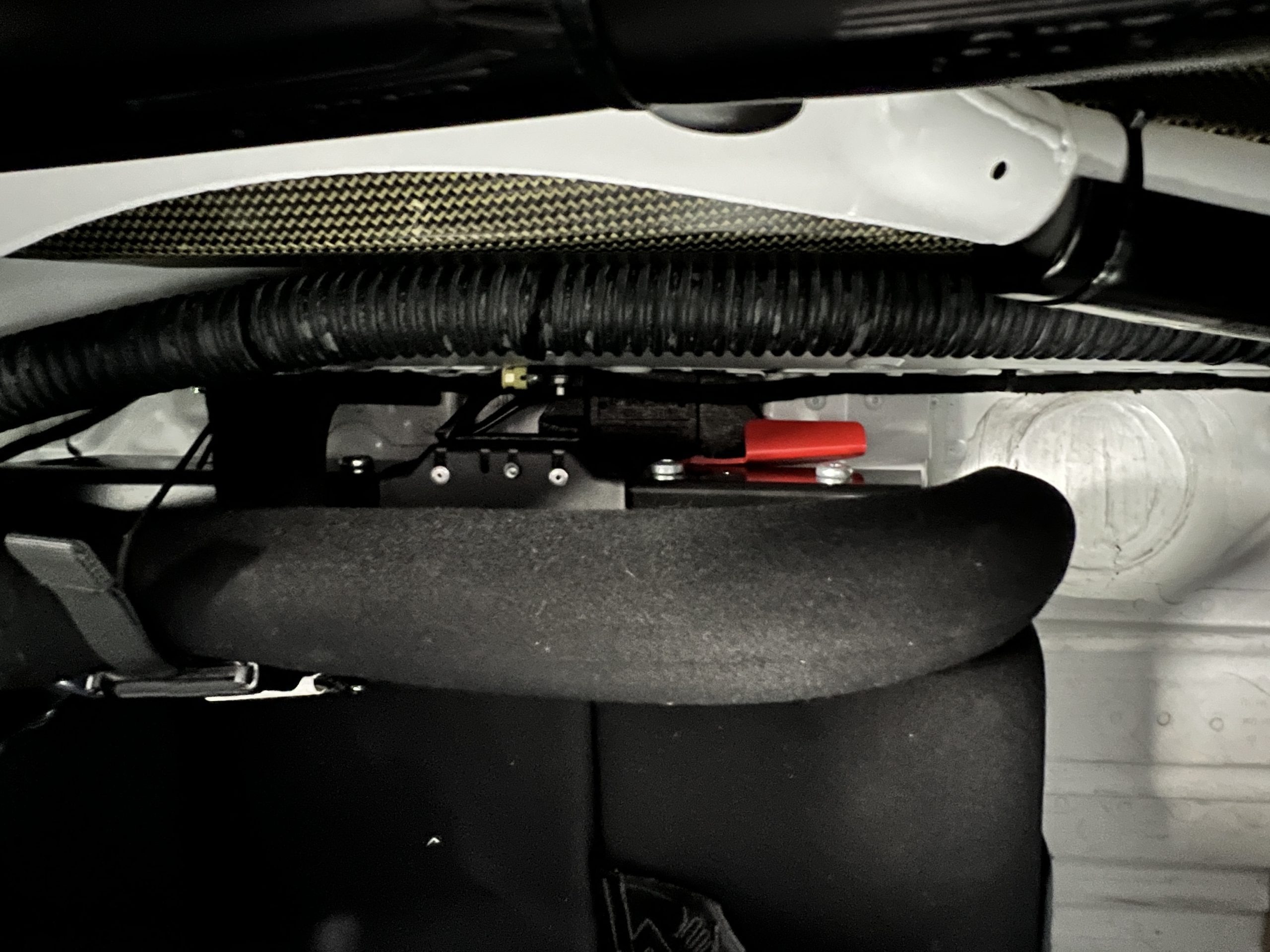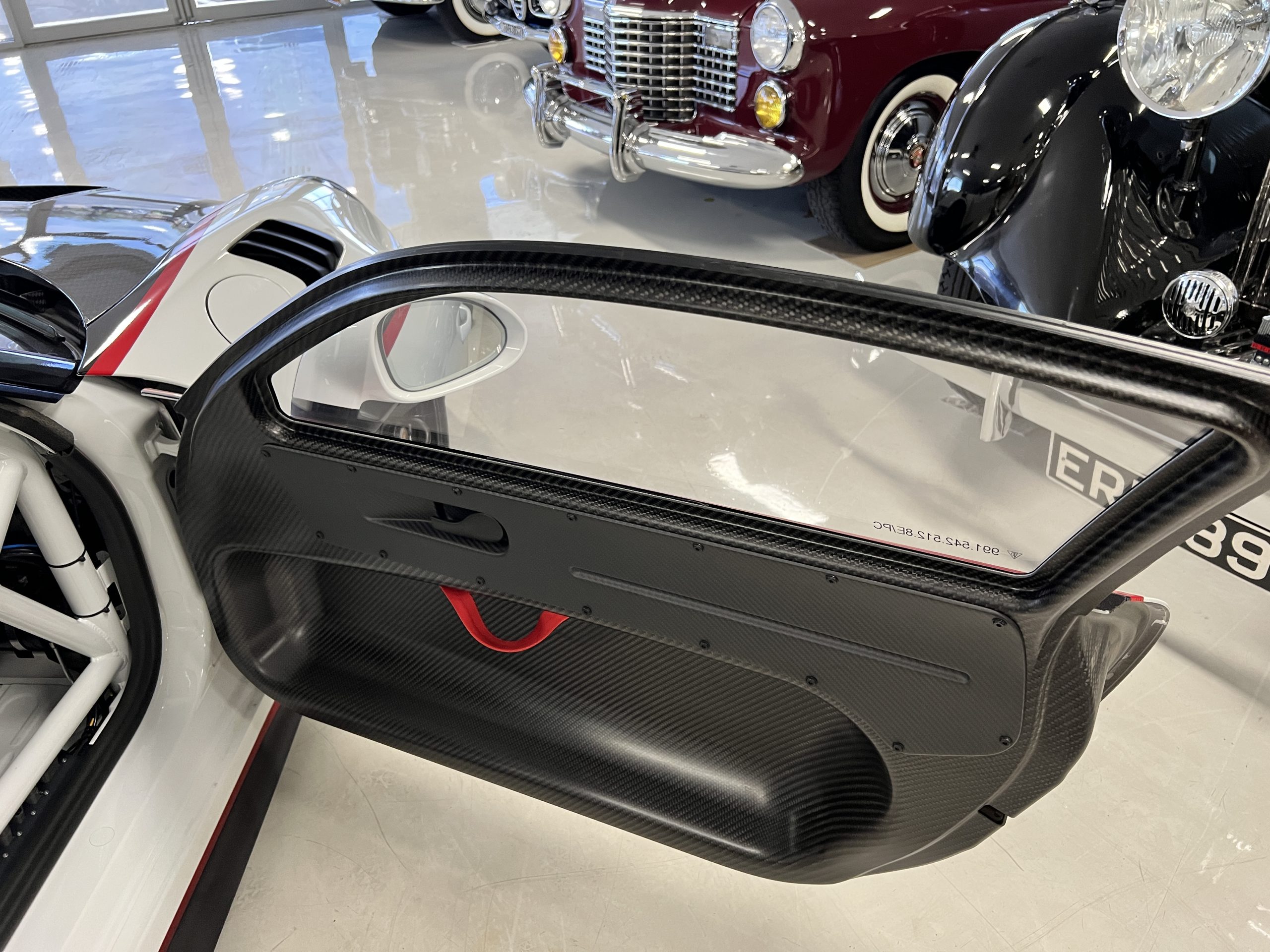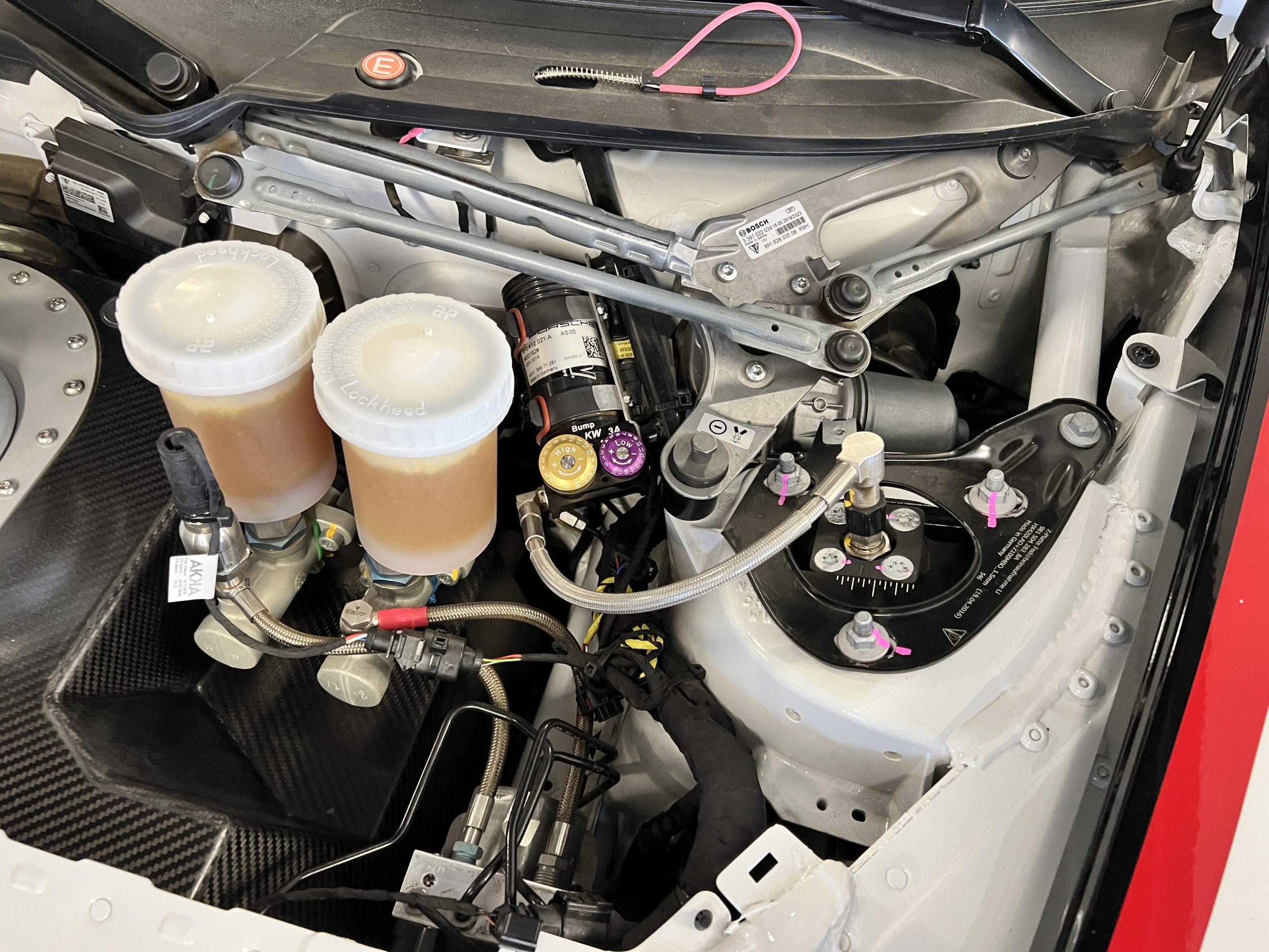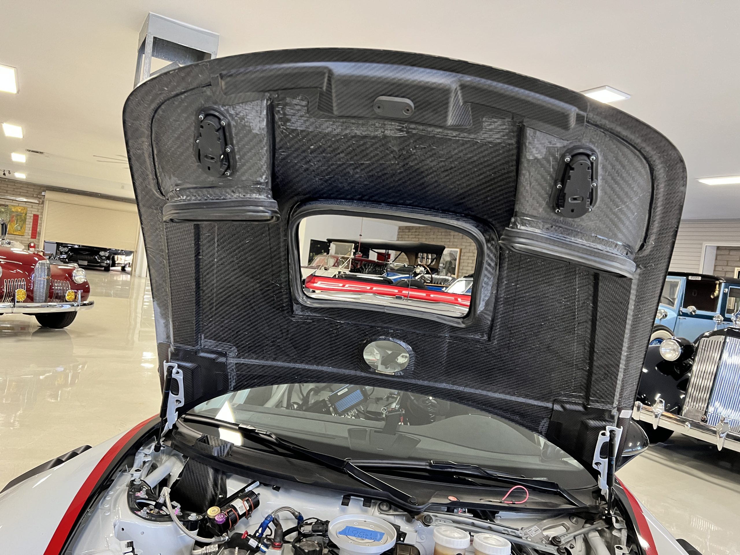 All 991 GT2 RS Clubsport models were factory finished in white (9CA) over an aluminum-steel composite frame with a carbon-fiber front hood, front fenders, front fender extenders, doors, rear decklid, a motorsport wing, front dive planes, a roof panel with a removable escape hatch, air intakes, and rear bumper cover. This example features an exposed carbon-fiber roof as well as red accents. Additional equipment includes a hood-mounted filler cap for the 30-gallon fuel cell, a front cowl-mounted electrical cutoff switch, a passenger-side panel port for the five-gallon turbo intercooler distilled water tank, and front and rear OMP tow straps.