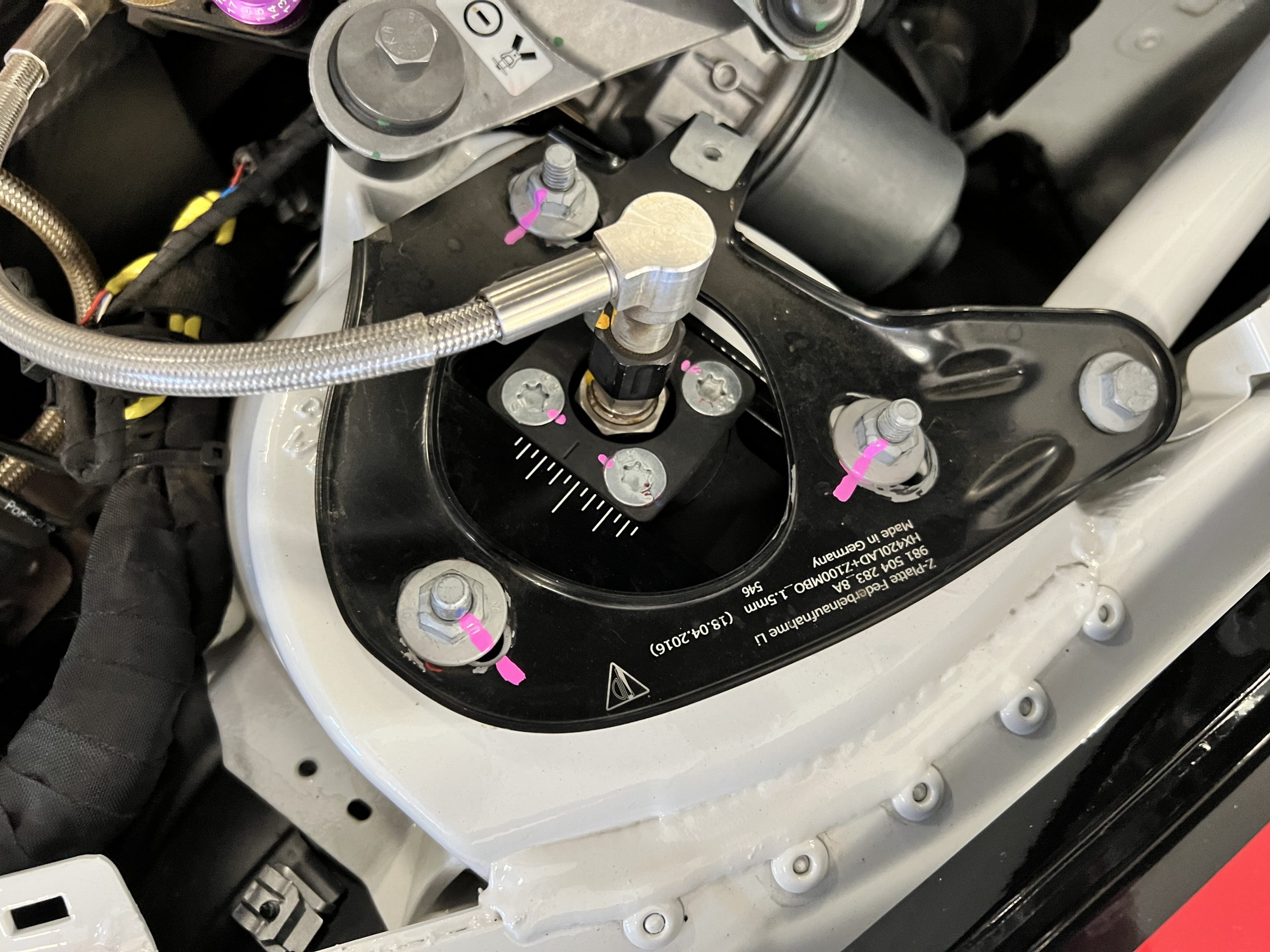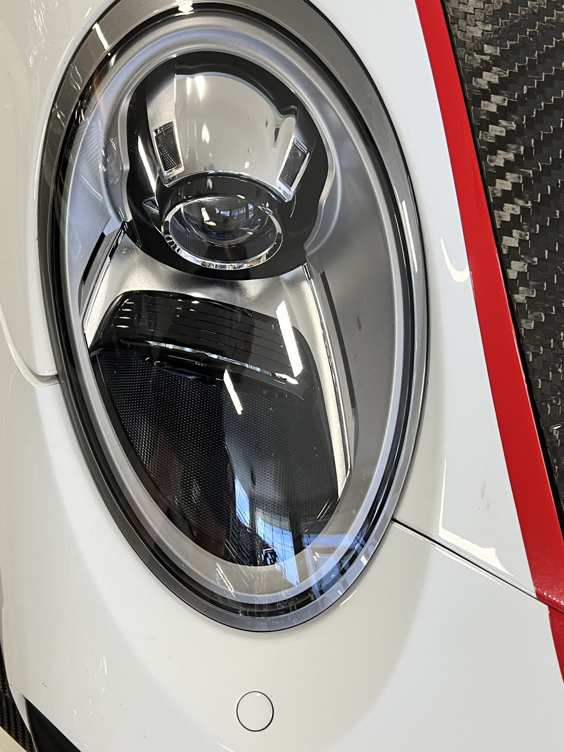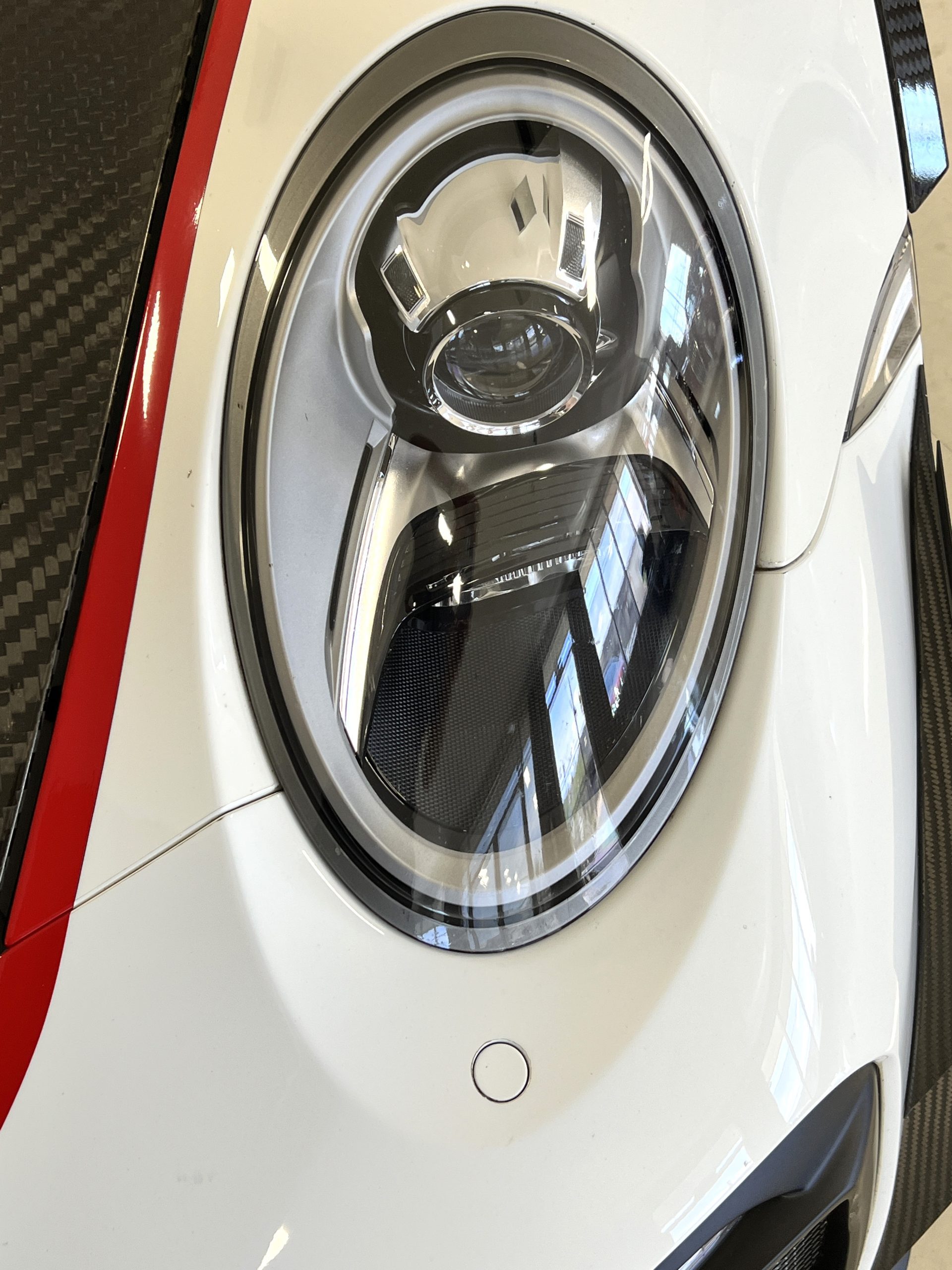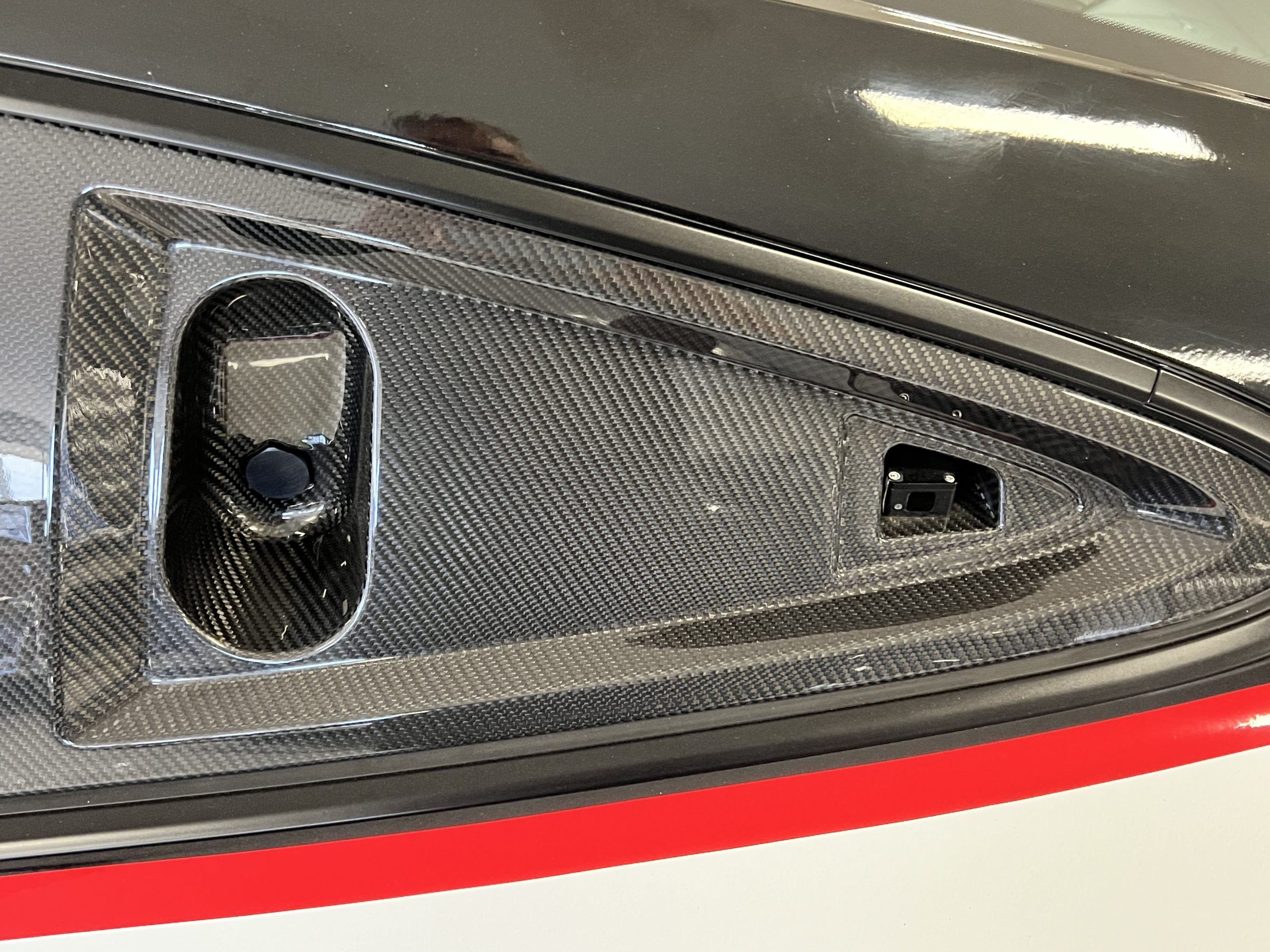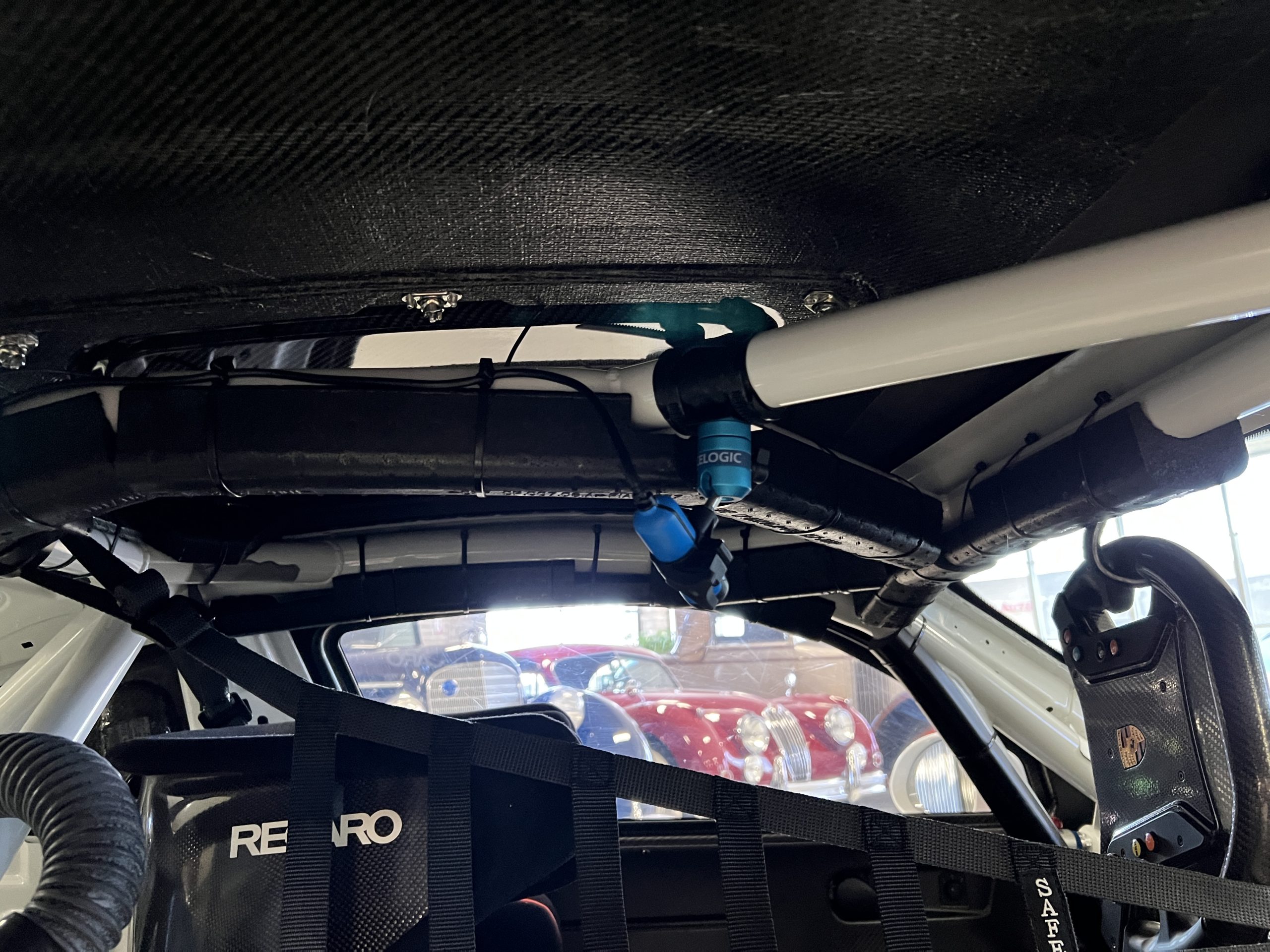 All 991 GT2 RS Clubsport models were factory finished in white (9CA) over an aluminum-steel composite frame with a carbon-fiber front hood, front fenders, front fender extenders, doors, rear decklid, a motorsport wing, front dive planes, a roof panel with a removable escape hatch, air intakes, and rear bumper cover. This example features an exposed carbon-fiber roof as well as red accents. Additional equipment includes a hood-mounted filler cap for the 30-gallon fuel cell, a front cowl-mounted electrical cutoff switch, a passenger-side panel port for the five-gallon turbo intercooler distilled water tank, and front and rear OMP tow straps.