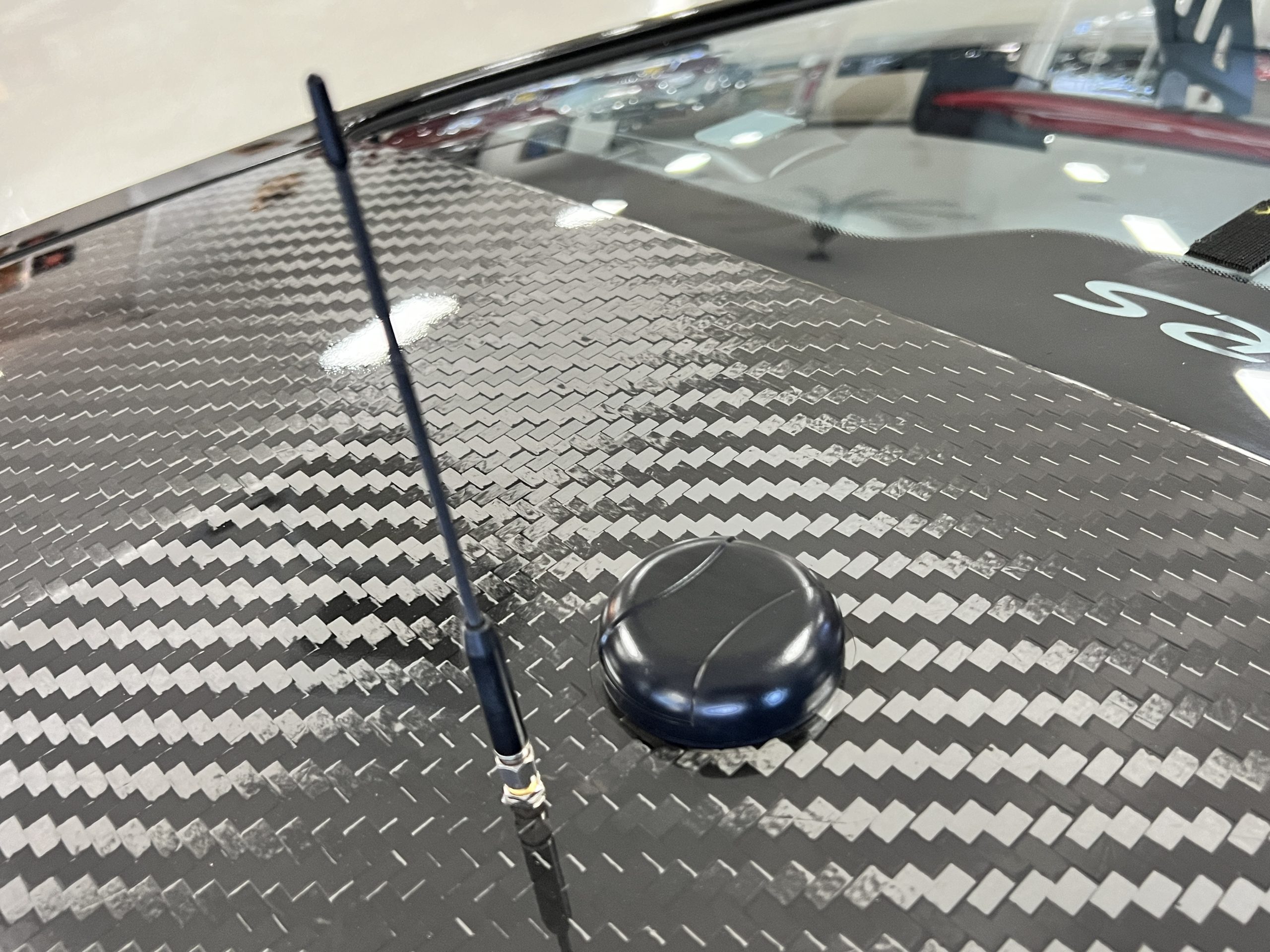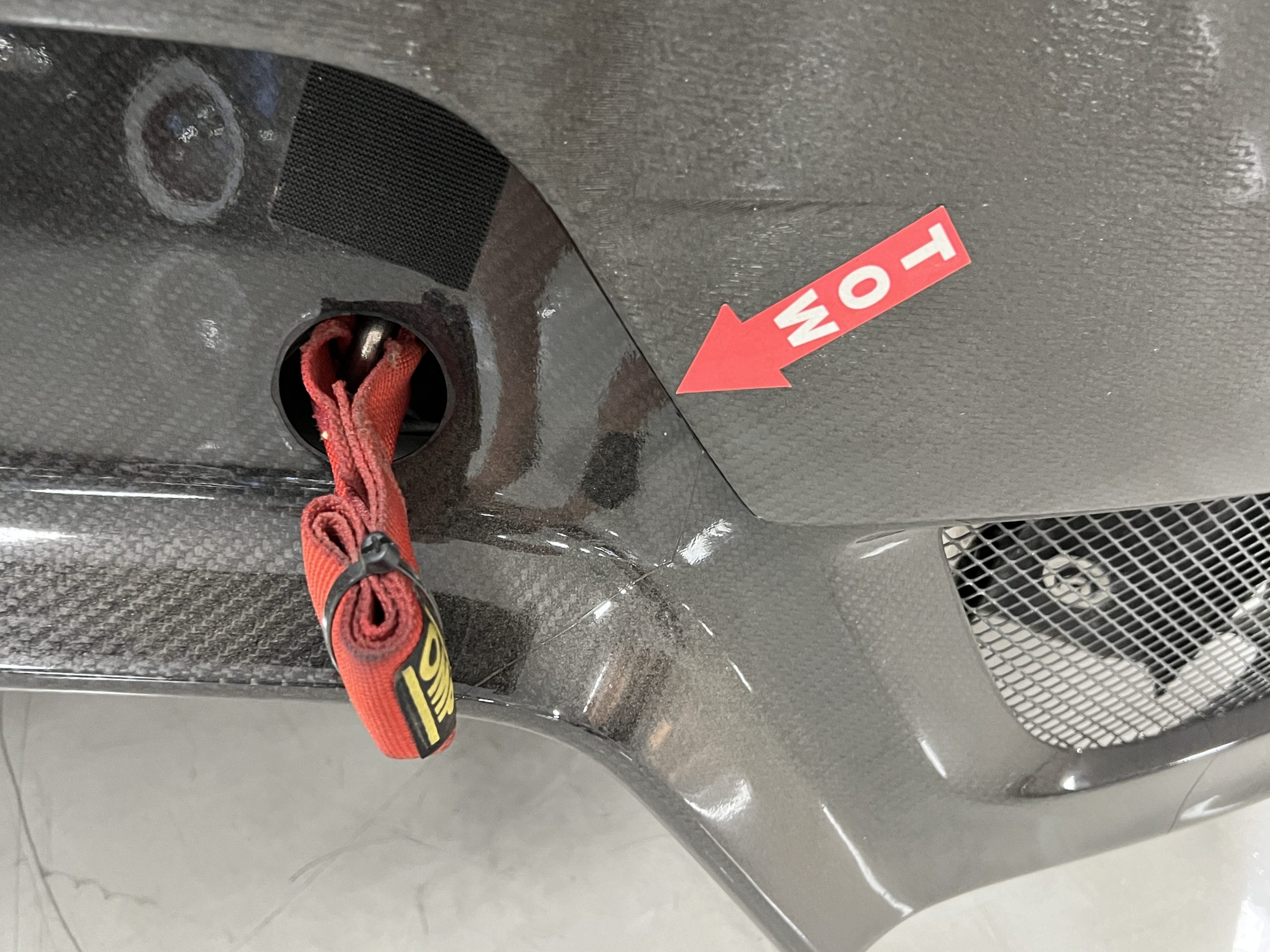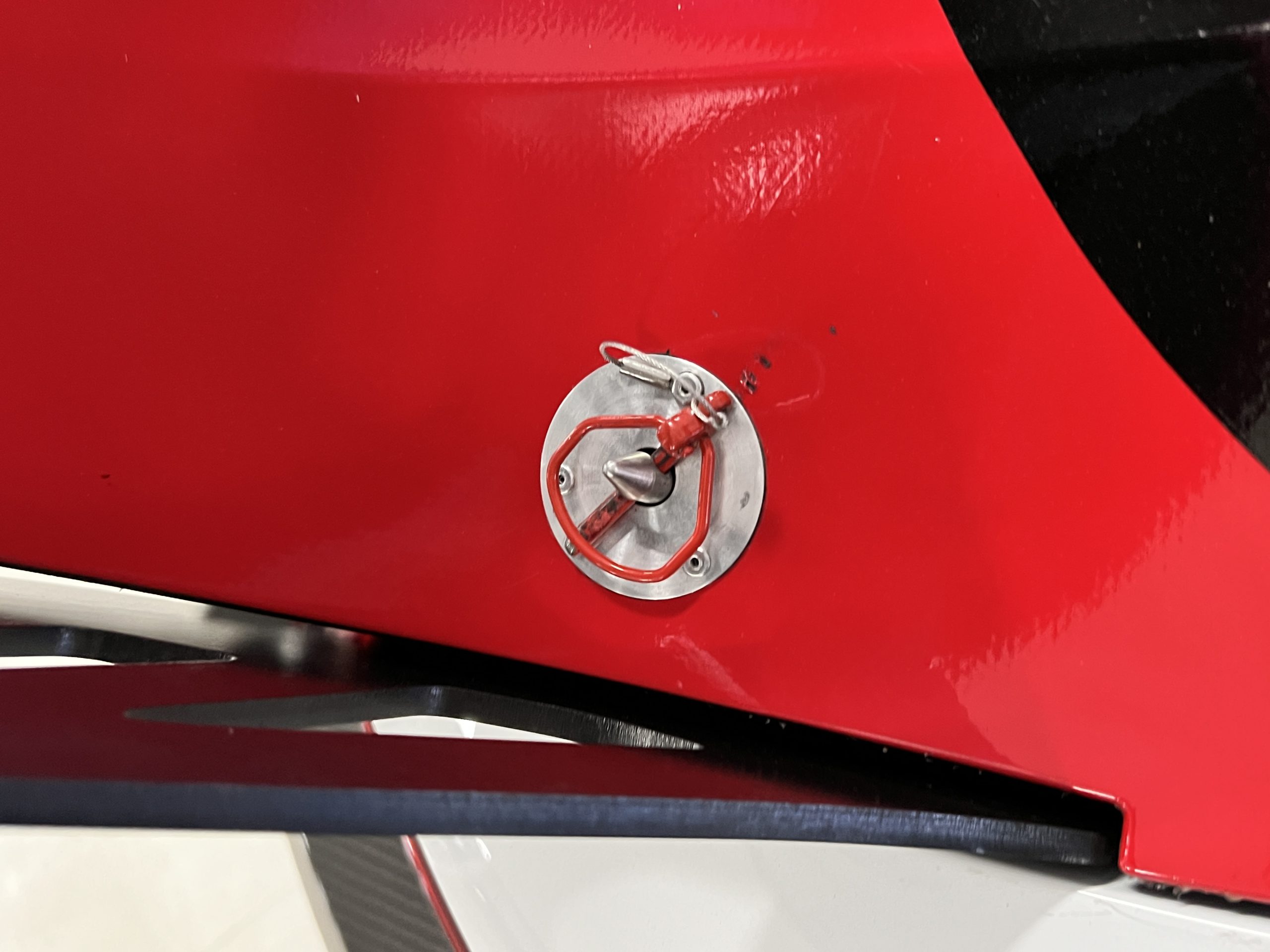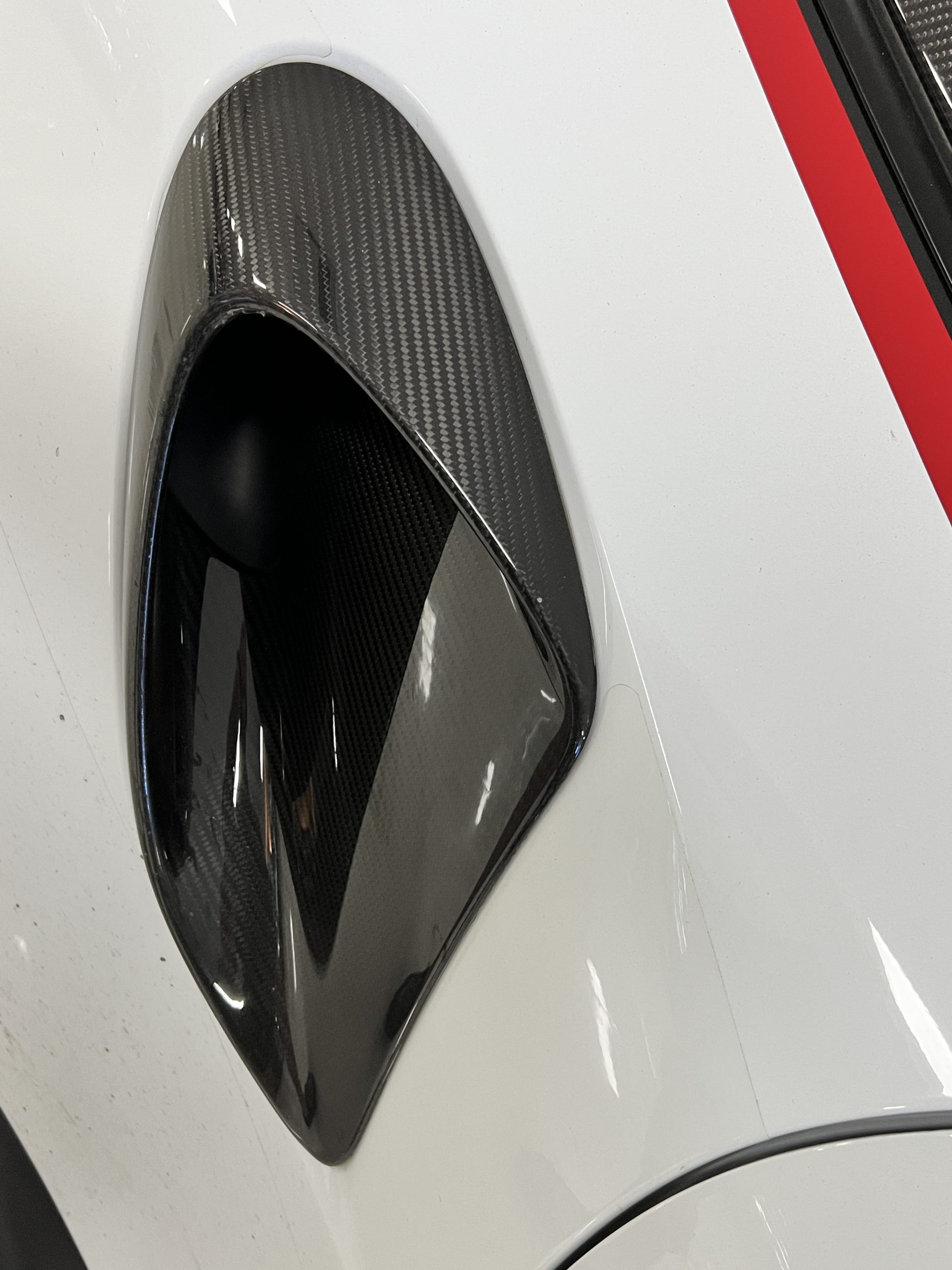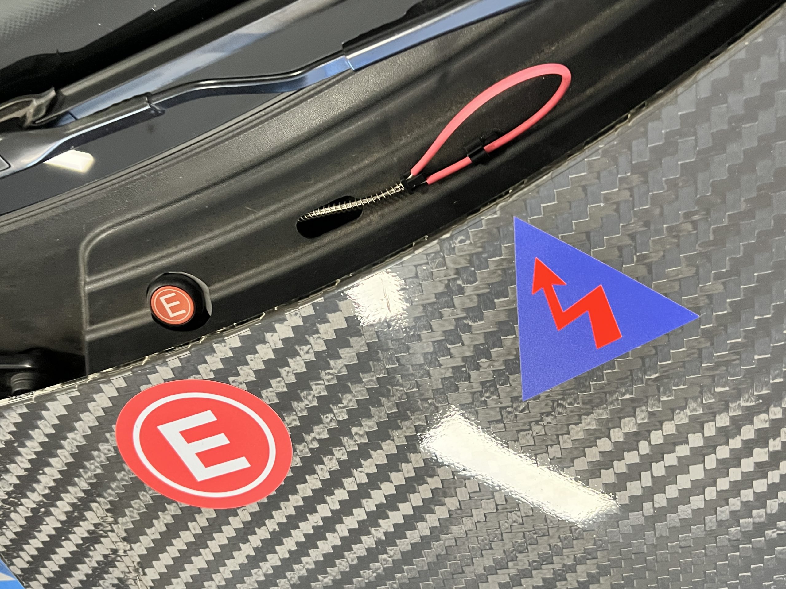All 991 GT2 RS Clubsport models were factory finished in white (9CA) over an aluminum-steel composite frame with a carbon-fiber front hood, front fenders, front fender extenders, doors, rear decklid, a motorsport wing, front dive planes, a roof panel with a removable escape hatch, air intakes, and rear bumper cover. This example features an exposed carbon-fiber roof as well as red accents. Additional equipment includes a hood-mounted filler cap for the 30-gallon fuel cell, a front cowl-mounted electrical cutoff switch, a passenger-side panel port for the five-gallon turbo intercooler distilled water tank, and front and rear OMP tow straps.