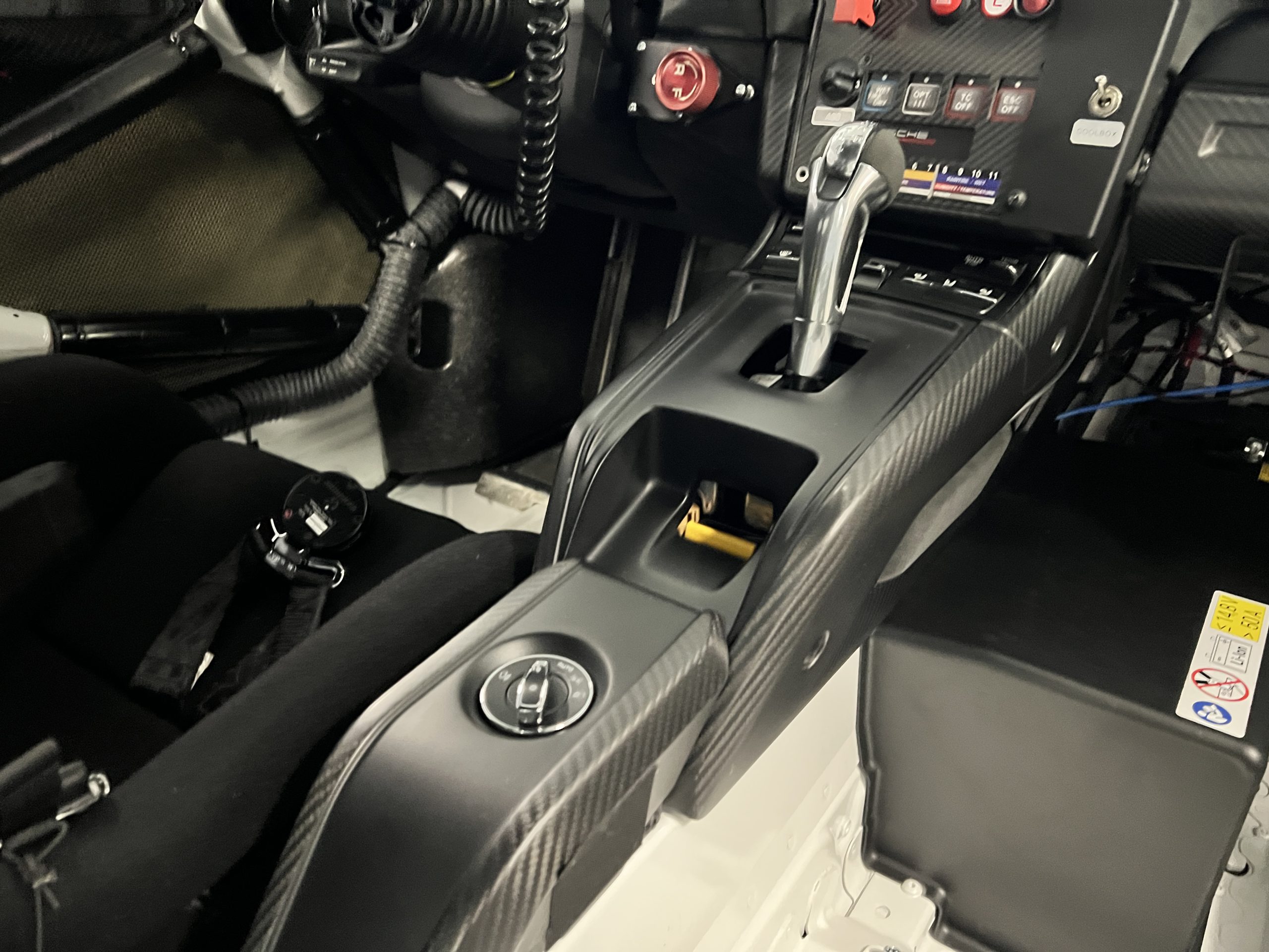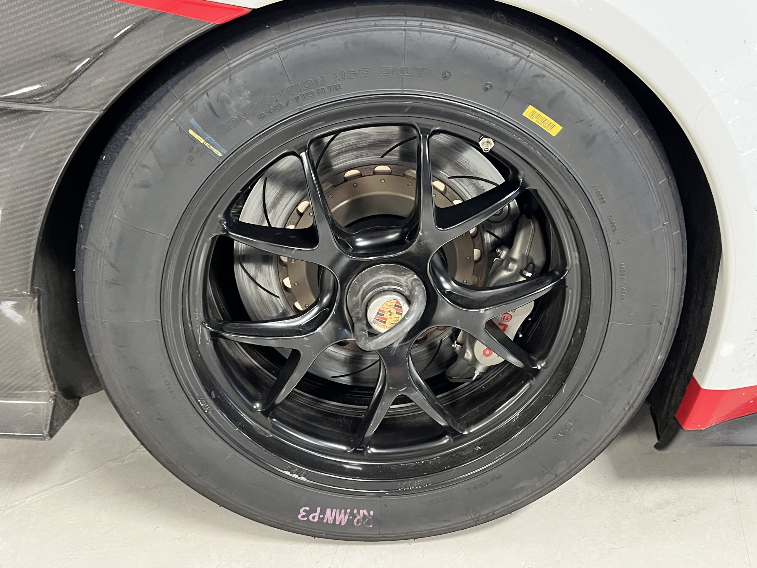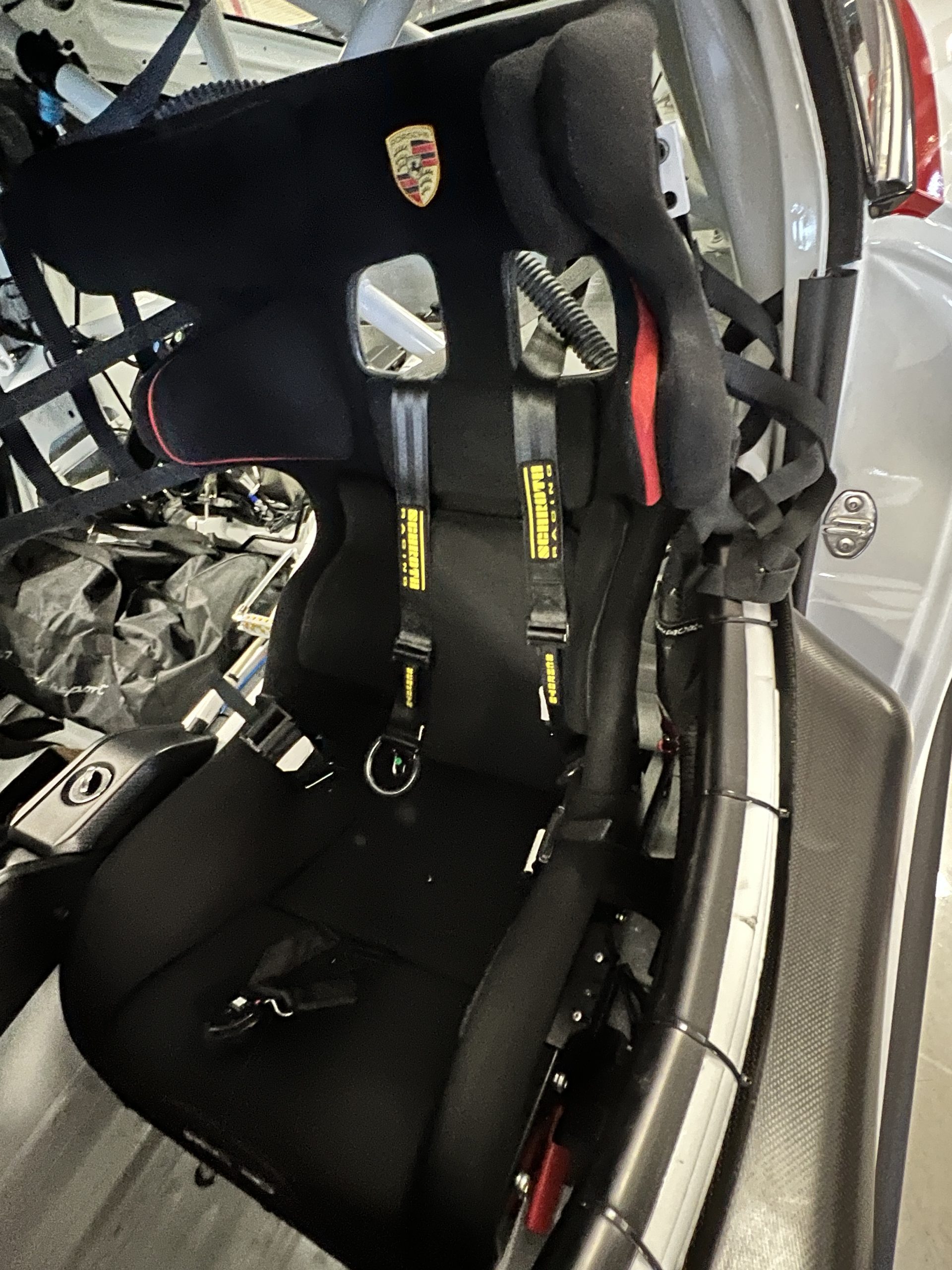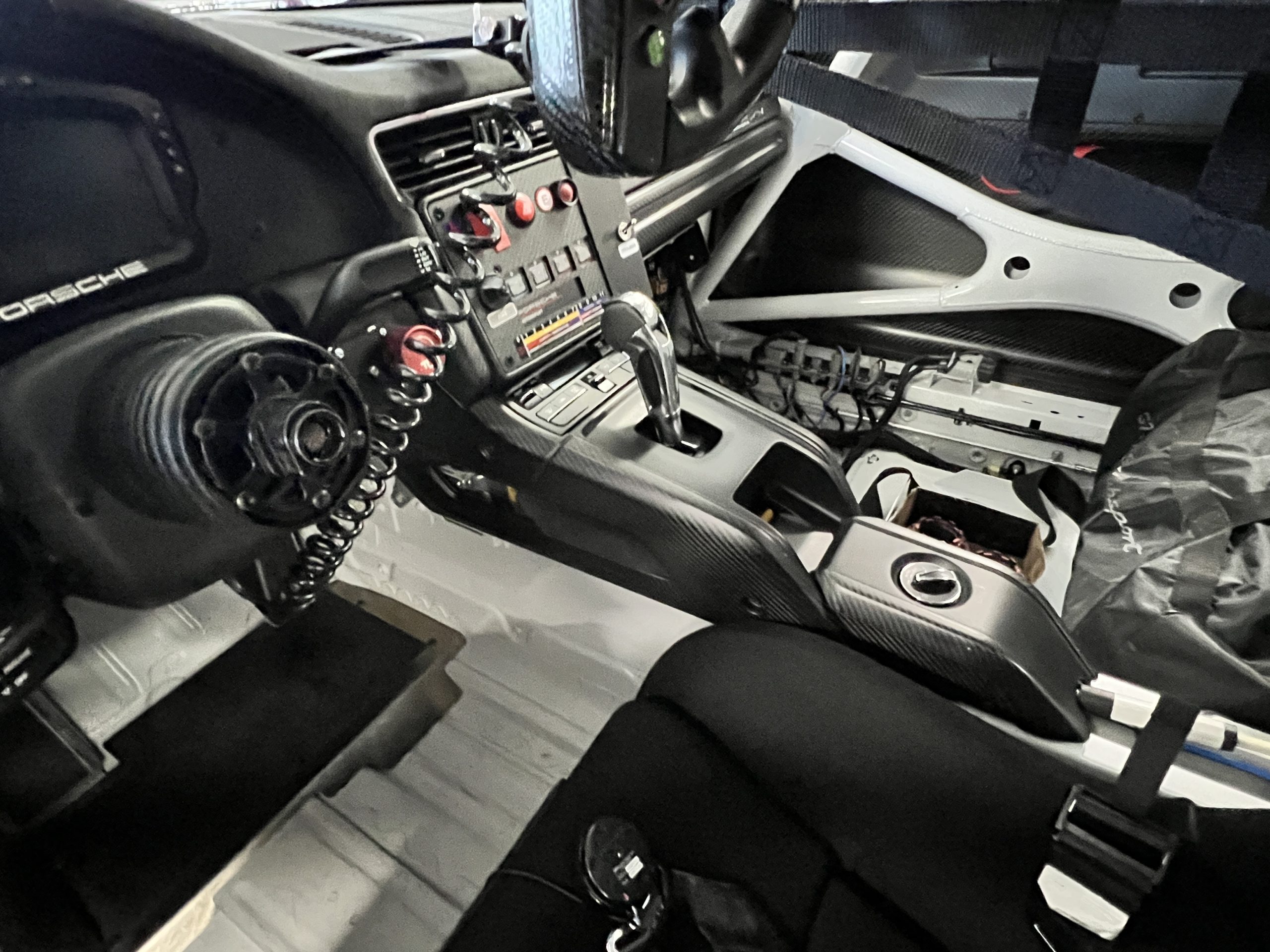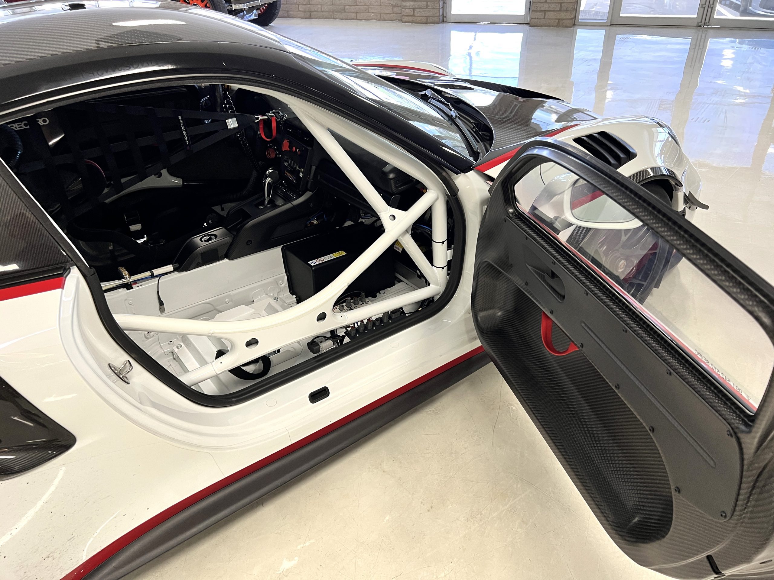 A single Recaro P1300 GT racing seat is mounted within the stripped cockpit and features fore and aft adjustment as well as a Schroth six-point harness. The car is equipped with a factory-integrated roll cage, a fire-suppression system, air conditioning, a carbon-fiber switch panel, an electrical cutoff switch, an integrated lap trigger, and the Porsche Track Precision race app. A lithium-ion battery is positioned in the passenger footwell along with the ECU. Modifications include a two-camera VBOX Video HD2 track package, a Teradek live stream system, a Coolshirt system, a Maglock fresh air helmet system, and an intercom radio.