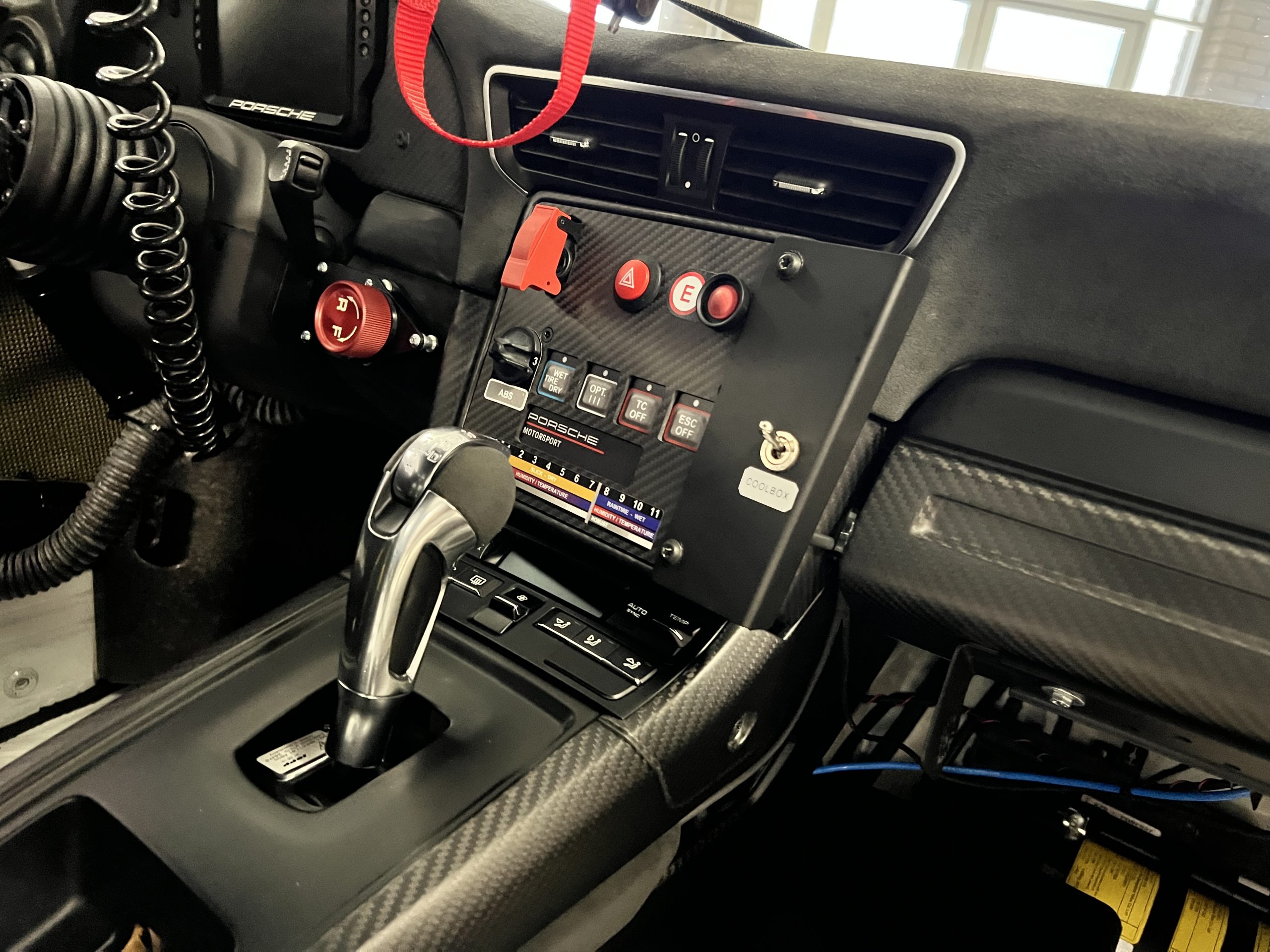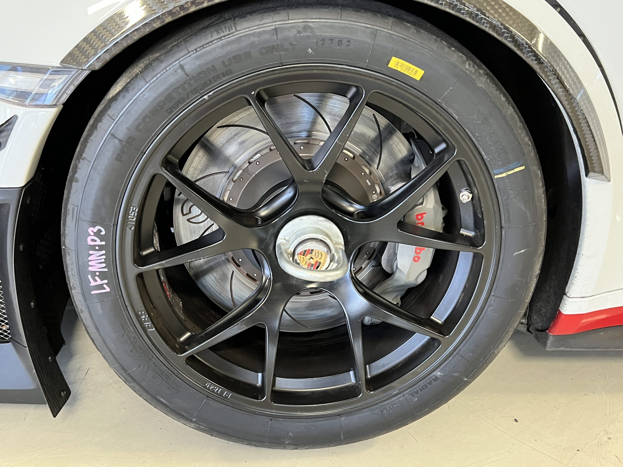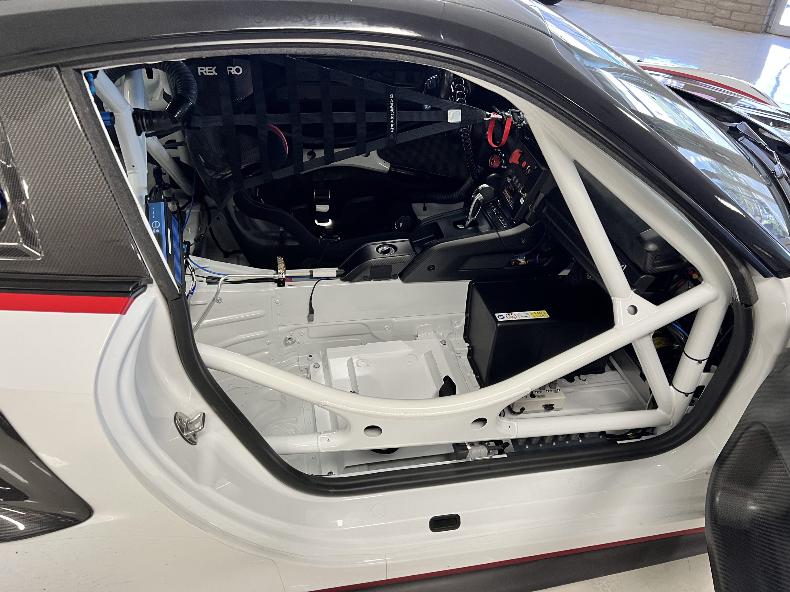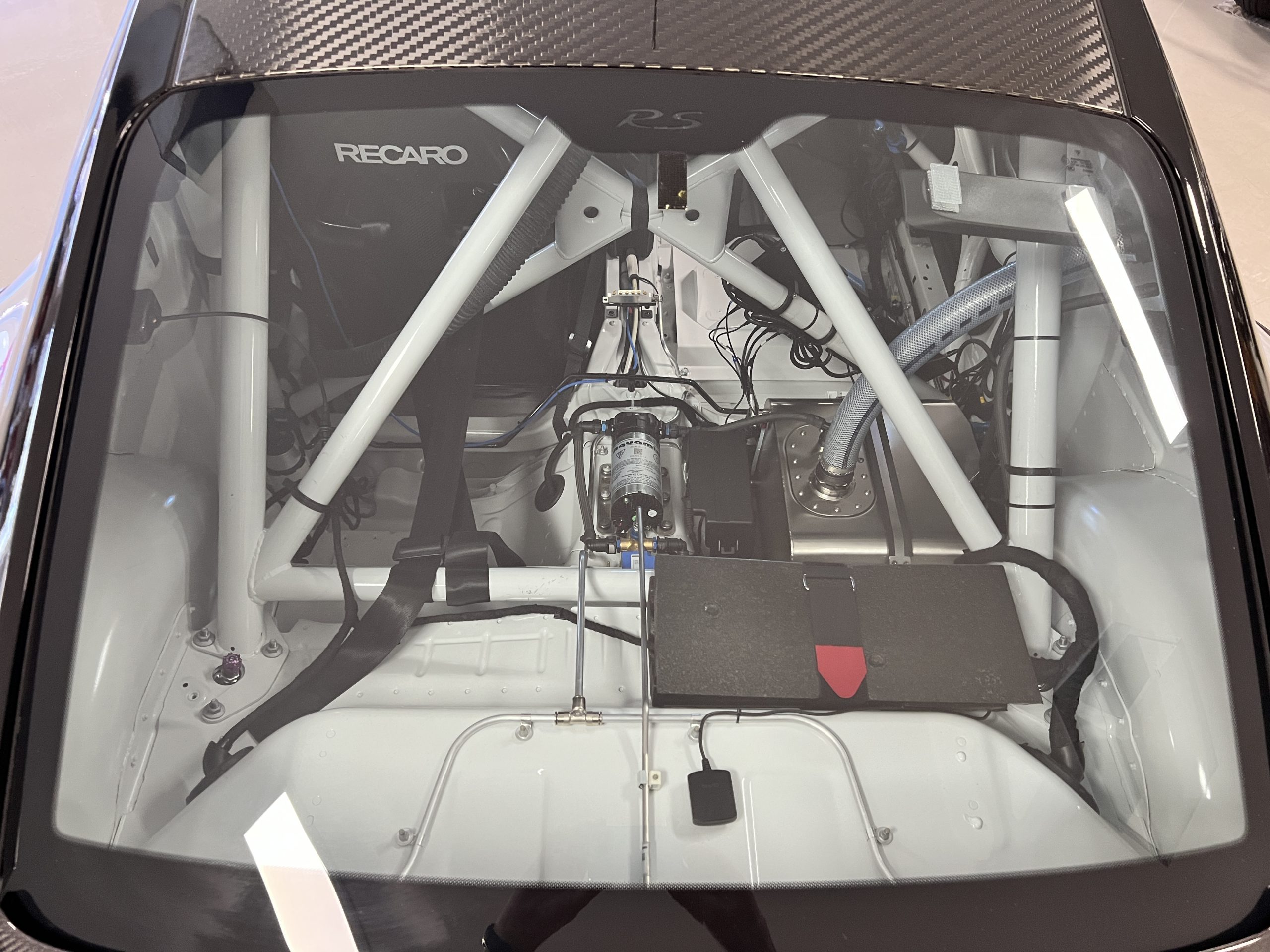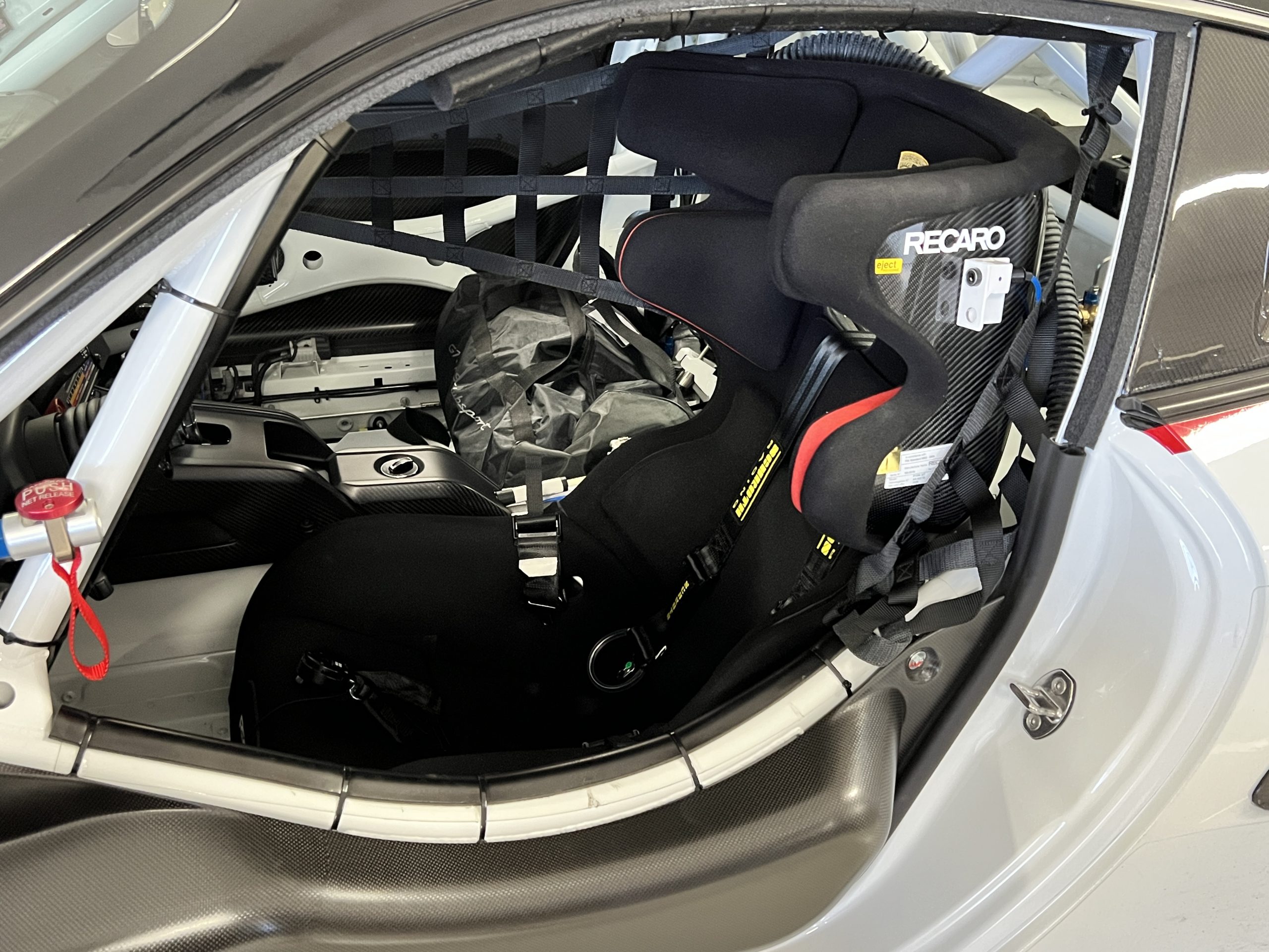 A single Recaro P1300 GT racing seat is mounted within the stripped cockpit and features fore and aft adjustment as well as a Schroth six-point harness. The car is equipped with a factory-integrated roll cage, a fire-suppression system, air conditioning, a carbon-fiber switch panel, an electrical cutoff switch, an integrated lap trigger, and the Porsche Track Precision race app. A lithium-ion battery is positioned in the passenger footwell along with the ECU. Modifications include a two-camera VBOX Video HD2 track package, a Teradek live stream system, a Coolshirt system, a Maglock fresh air helmet system, and an intercom radio.