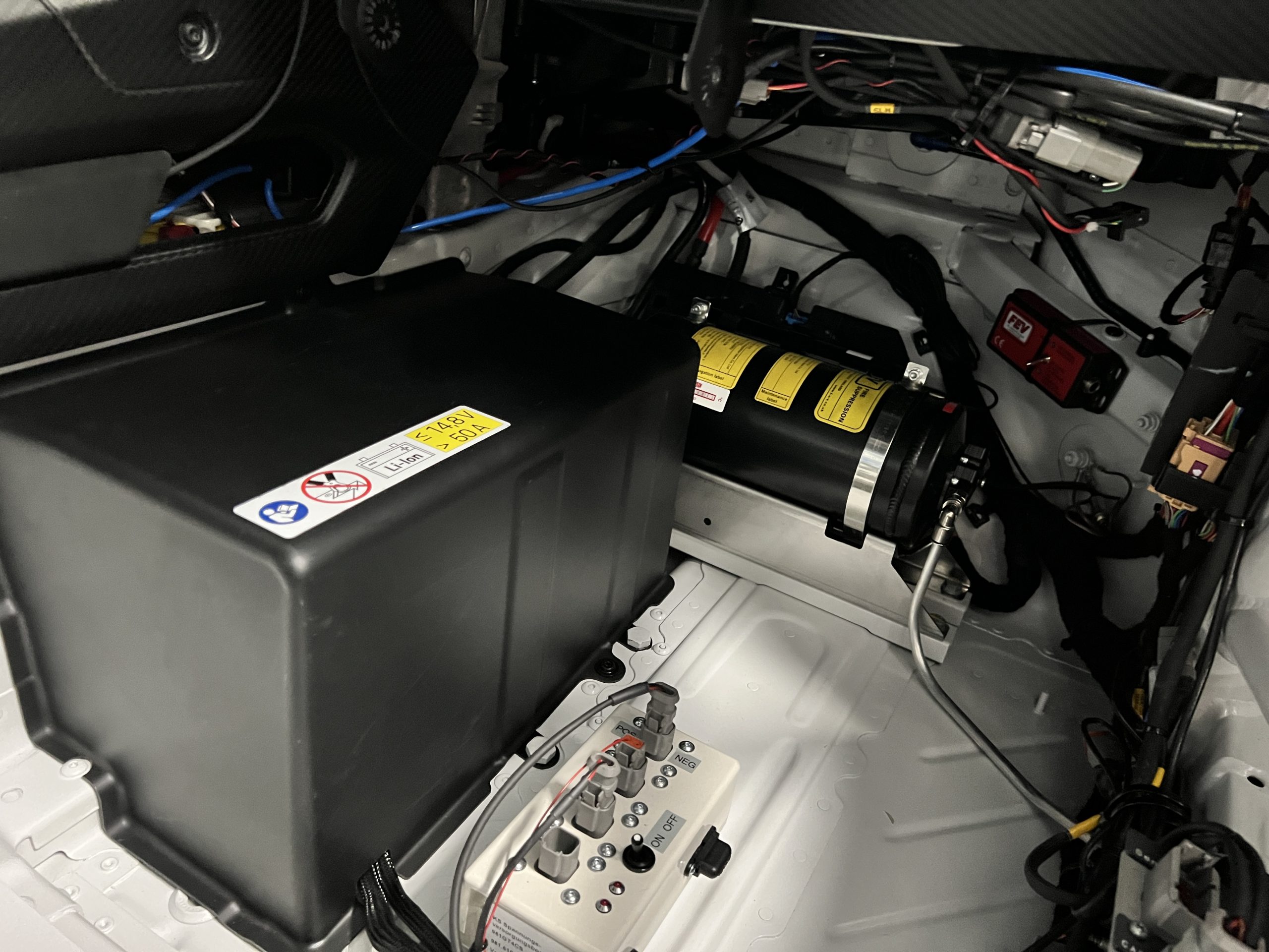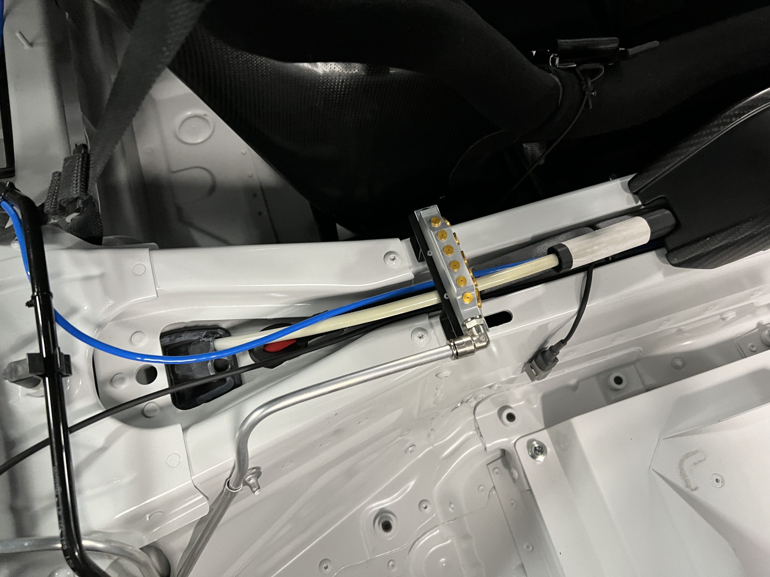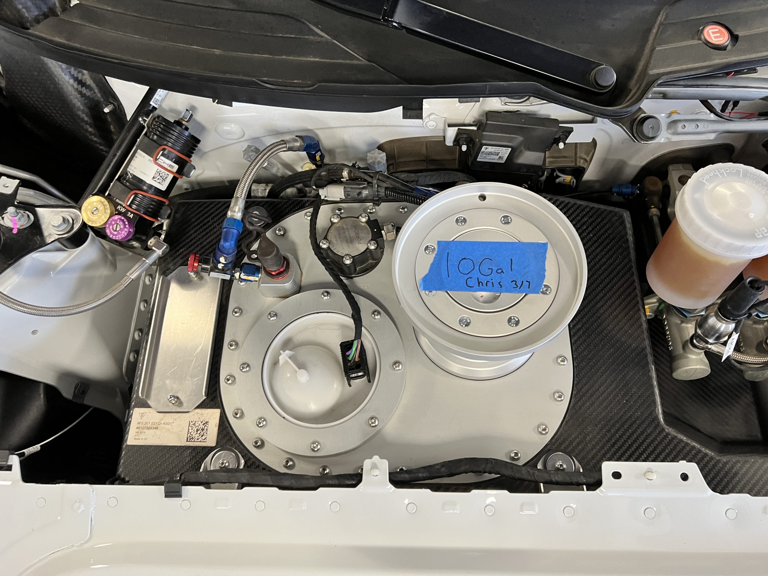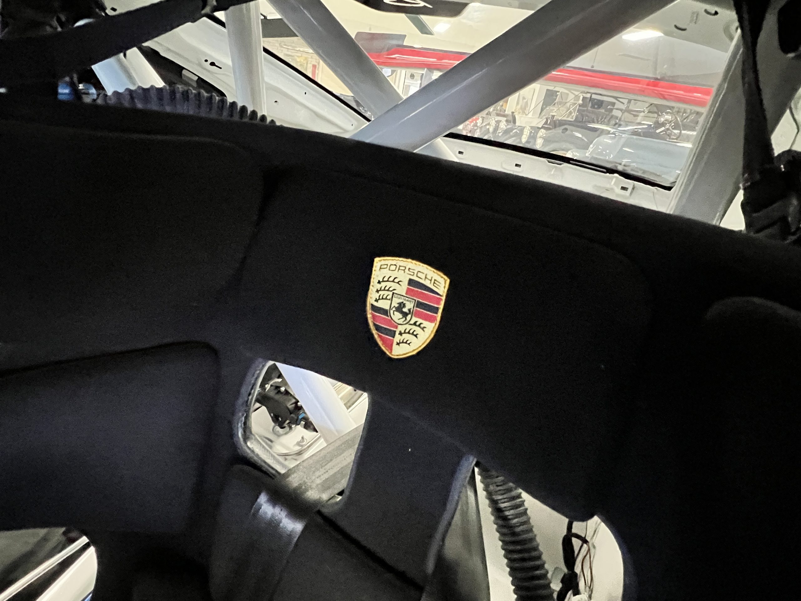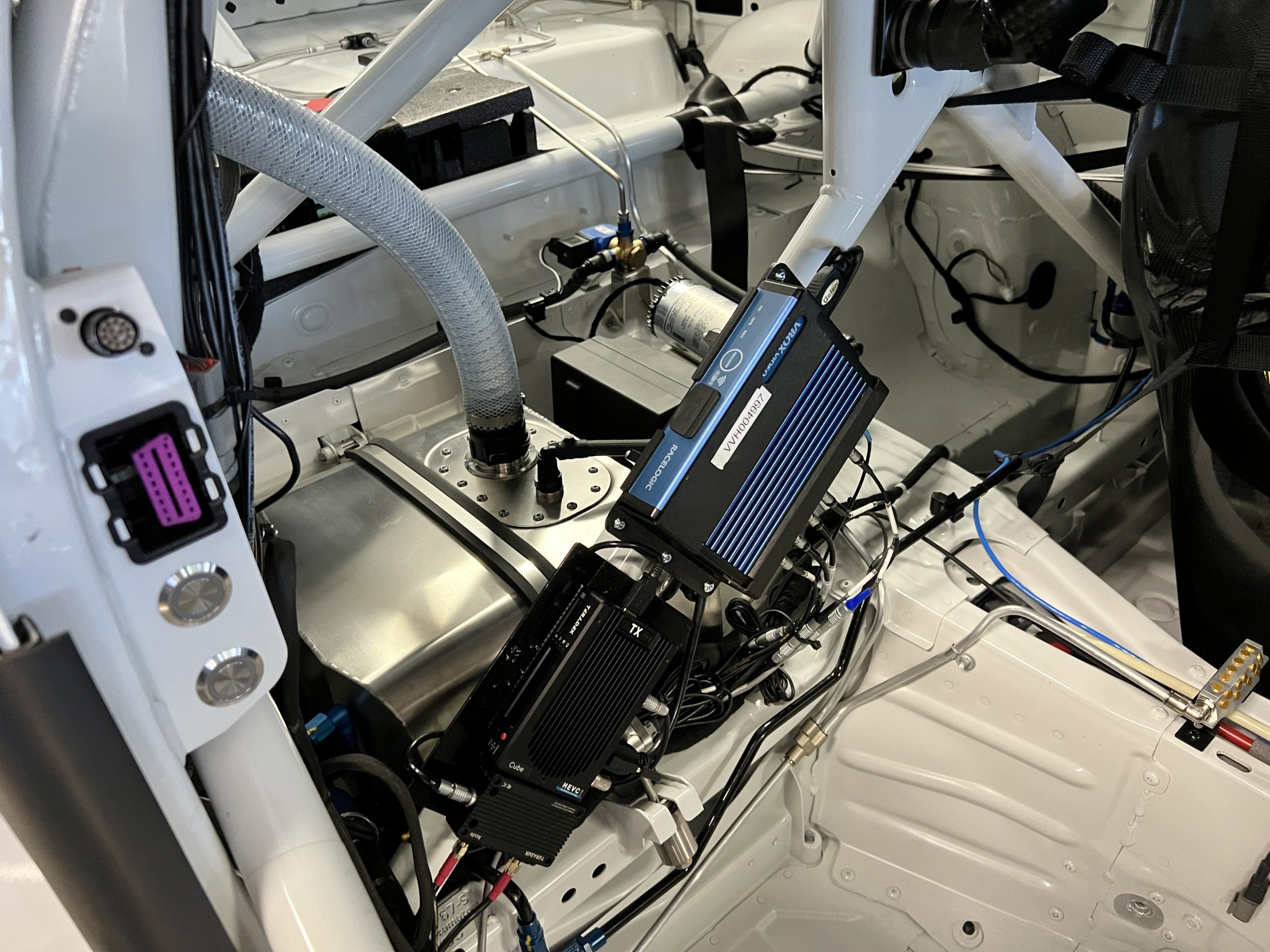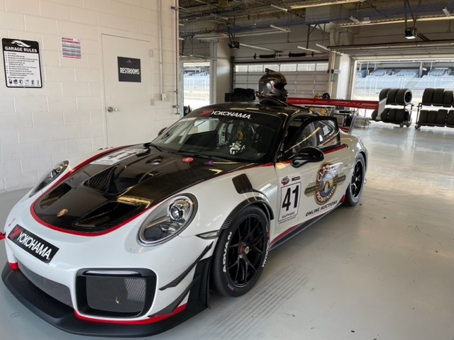 A single Recaro P1300 GT racing seat is mounted within the stripped cockpit and features fore and aft adjustment as well as a Schroth six-point harness. The car is equipped with a factory-integrated roll cage, a fire-suppression system, air conditioning, a carbon-fiber switch panel, an electrical cutoff switch, an integrated lap trigger, and the Porsche Track Precision race app. A lithium-ion battery is positioned in the passenger footwell along with the ECU. Modifications include a two-camera VBOX Video HD2 track package, a Teradek live stream system, a Coolshirt system, a Maglock fresh air helmet system, and an intercom radio.