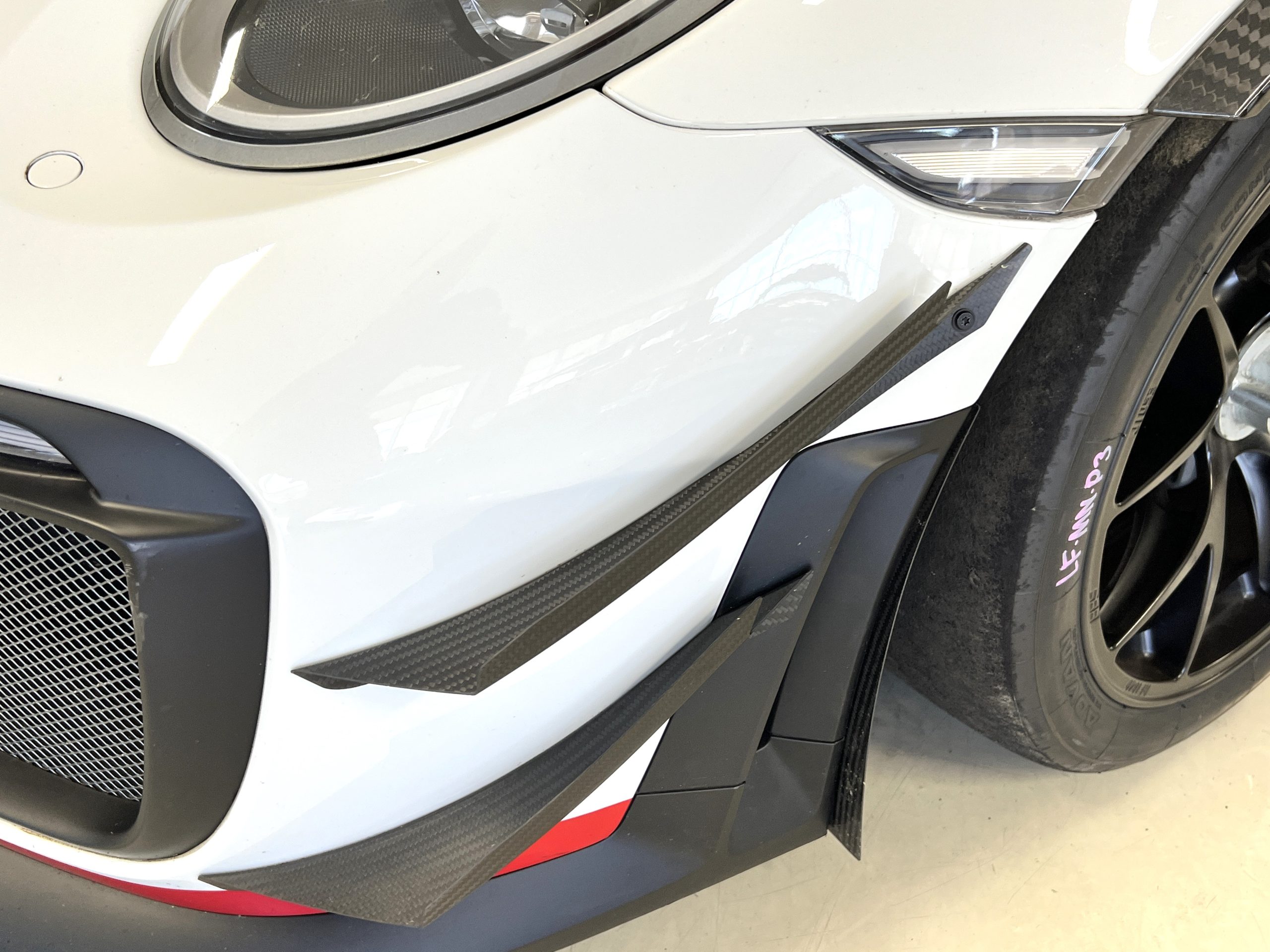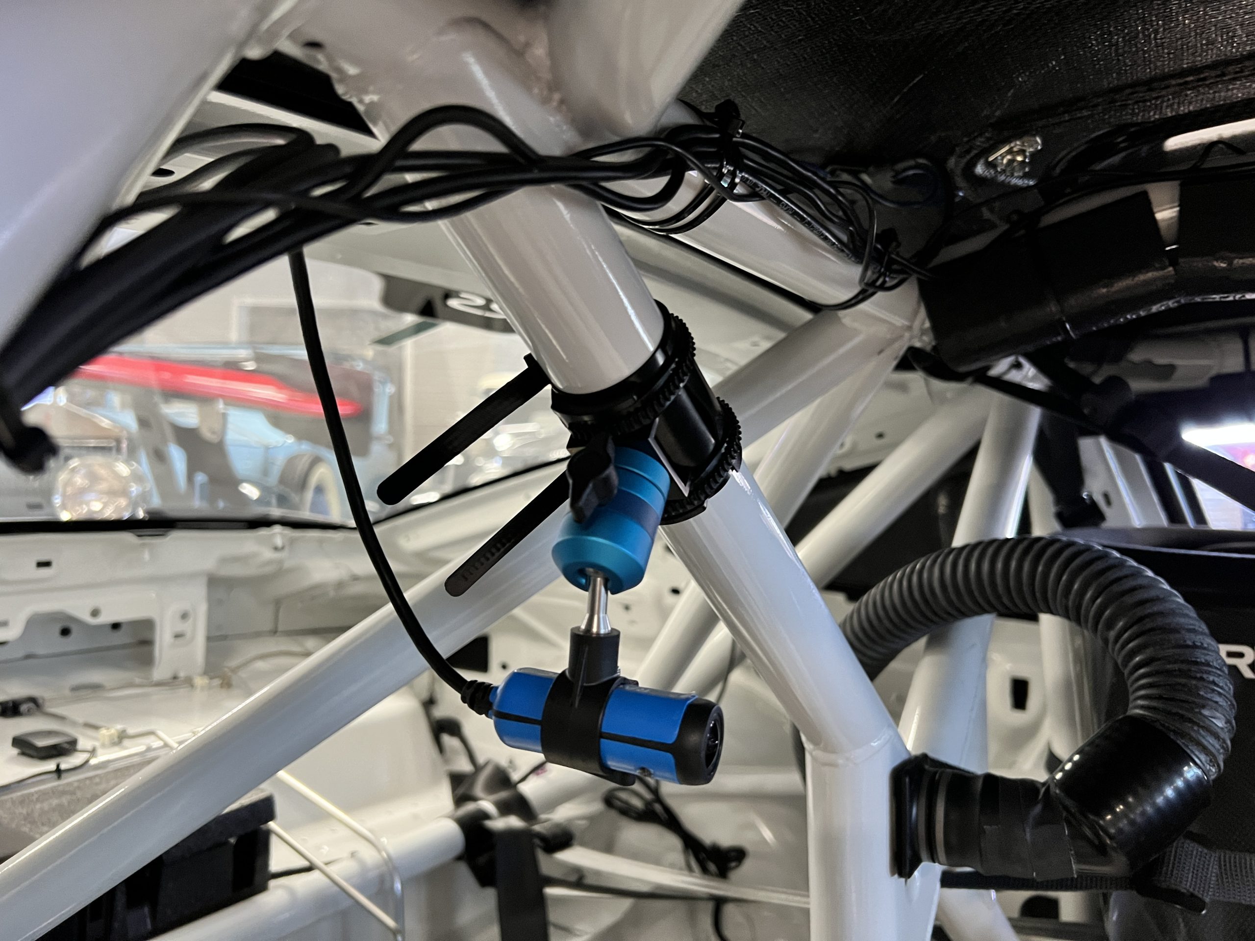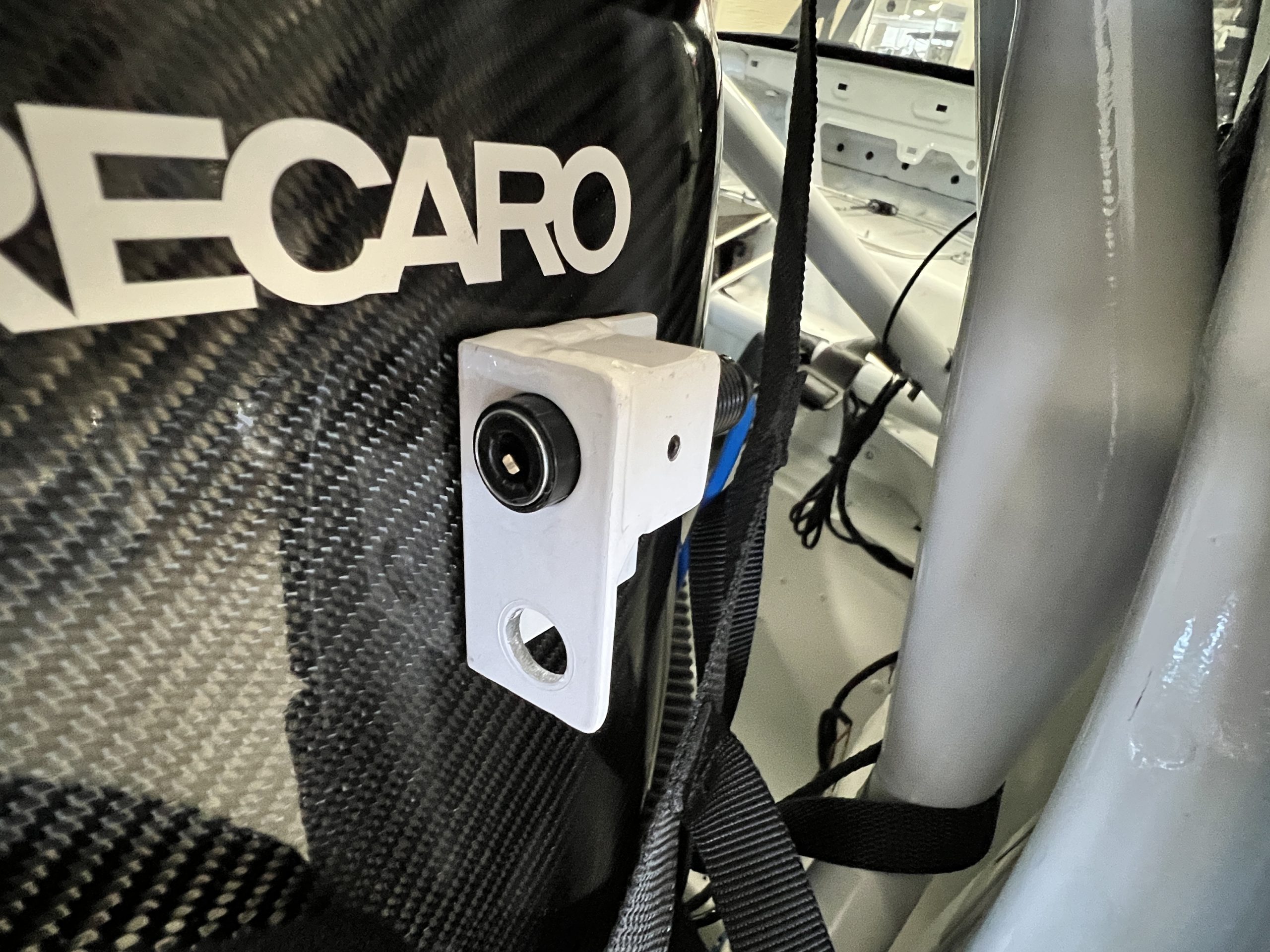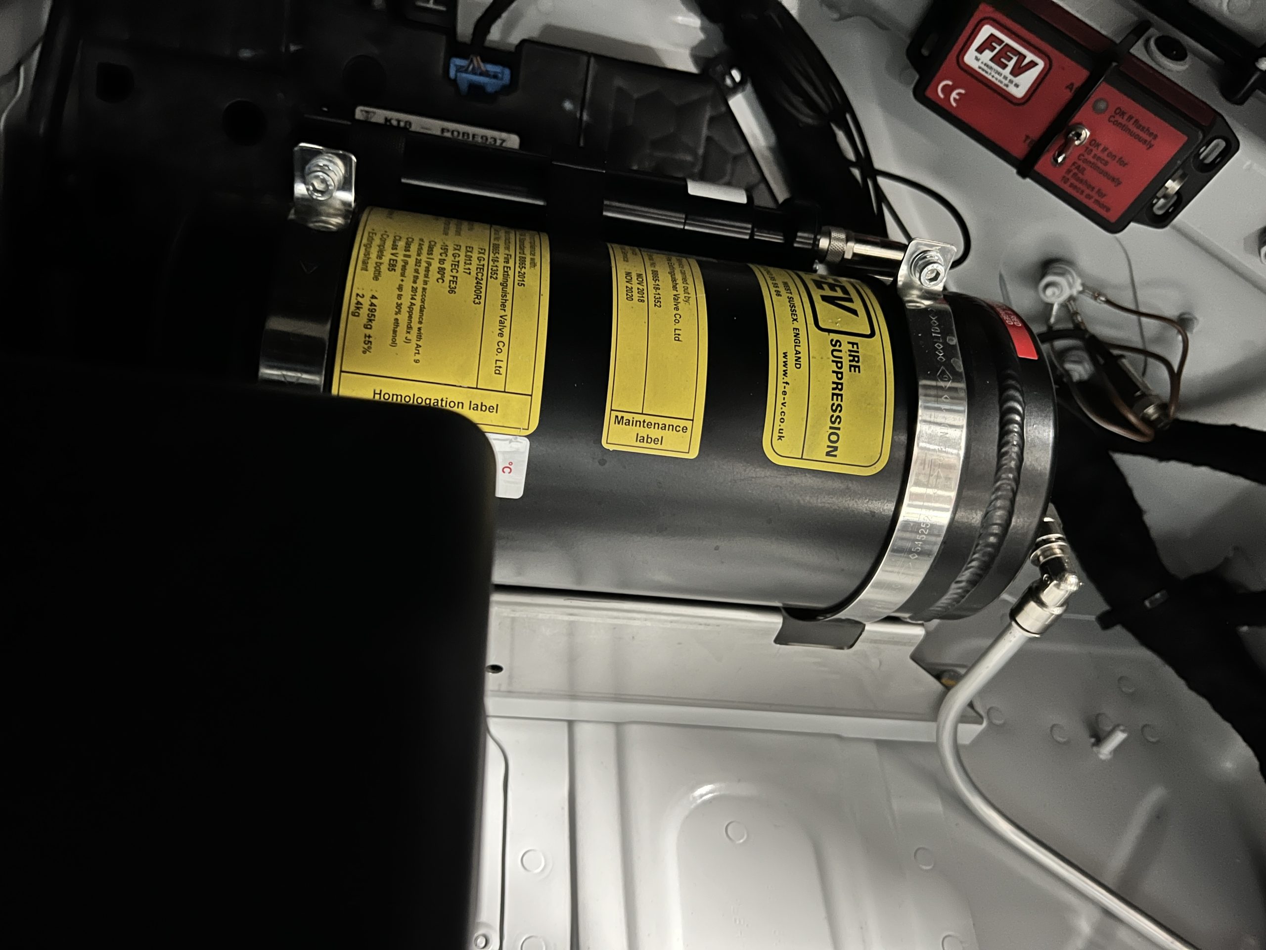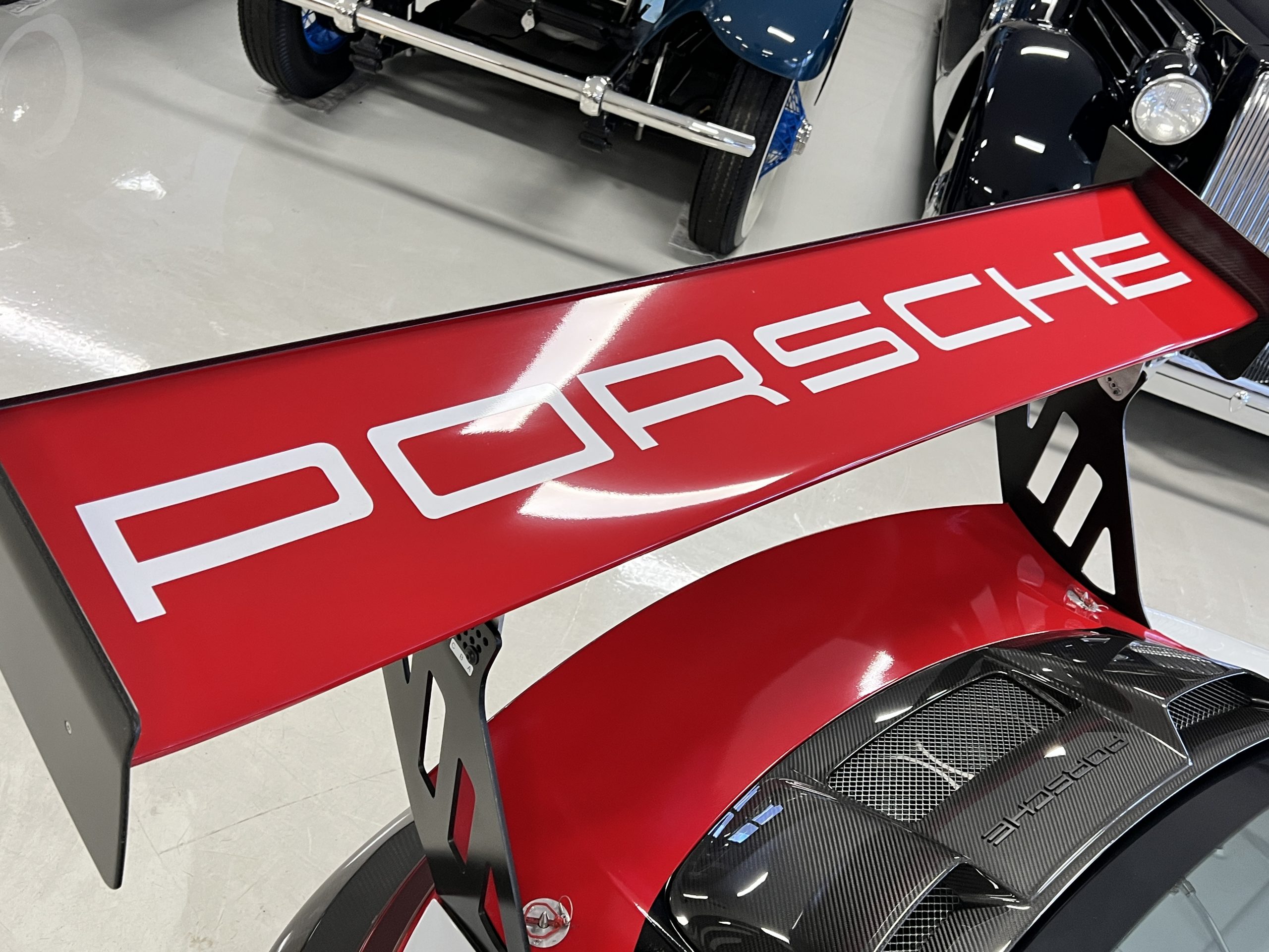 A single Recaro P1300 GT racing seat is mounted within the stripped cockpit and features fore and aft adjustment as well as a Schroth six-point harness. The car is equipped with a factory-integrated roll cage, a fire-suppression system, air conditioning, a carbon-fiber switch panel, an electrical cutoff switch, an integrated lap trigger, and the Porsche Track Precision race app. A lithium-ion battery is positioned in the passenger footwell along with the ECU. Modifications include a two-camera VBOX Video HD2 track package, a Teradek live stream system, a Coolshirt system, a Maglock fresh air helmet system, and an intercom radio.