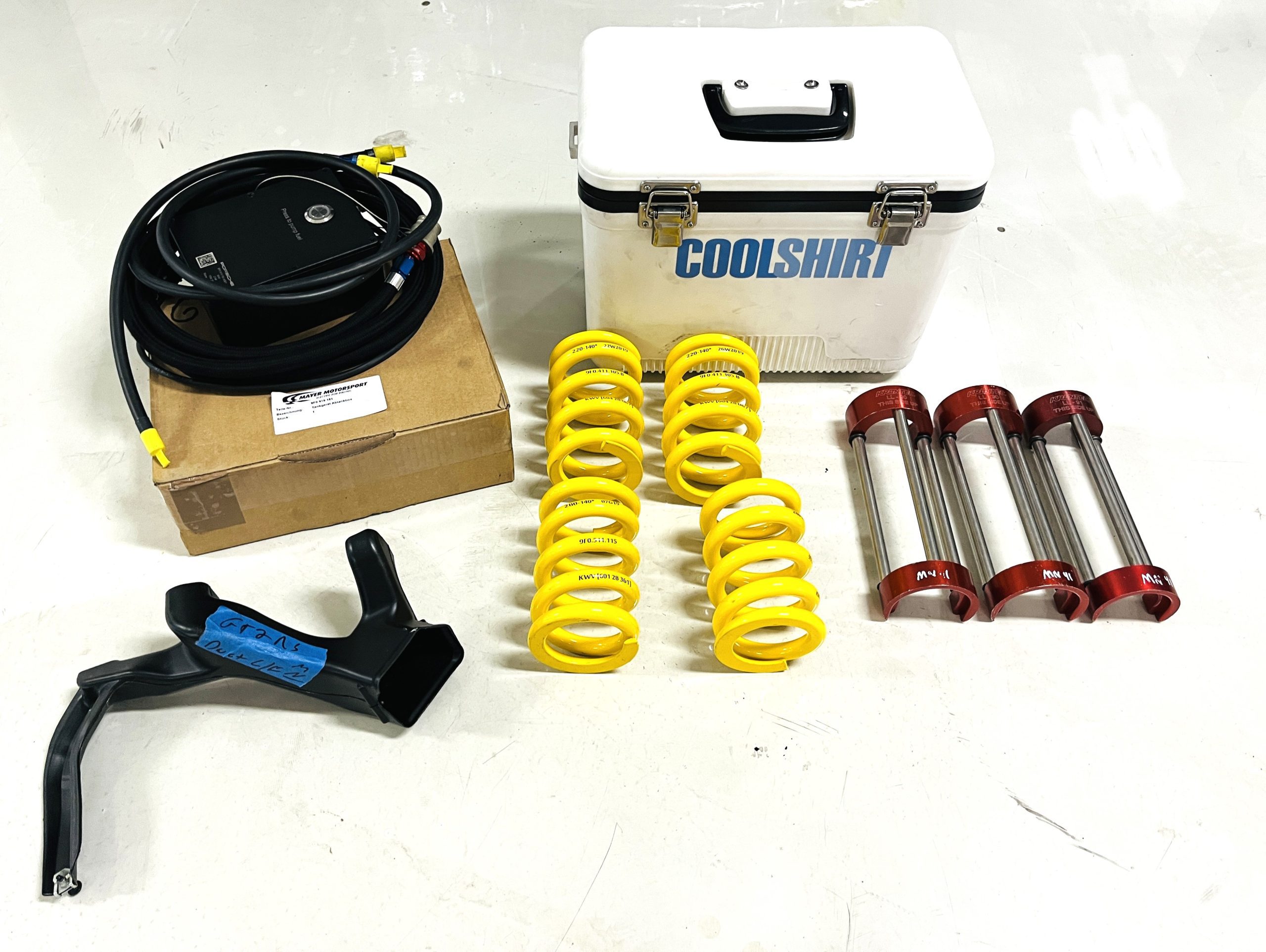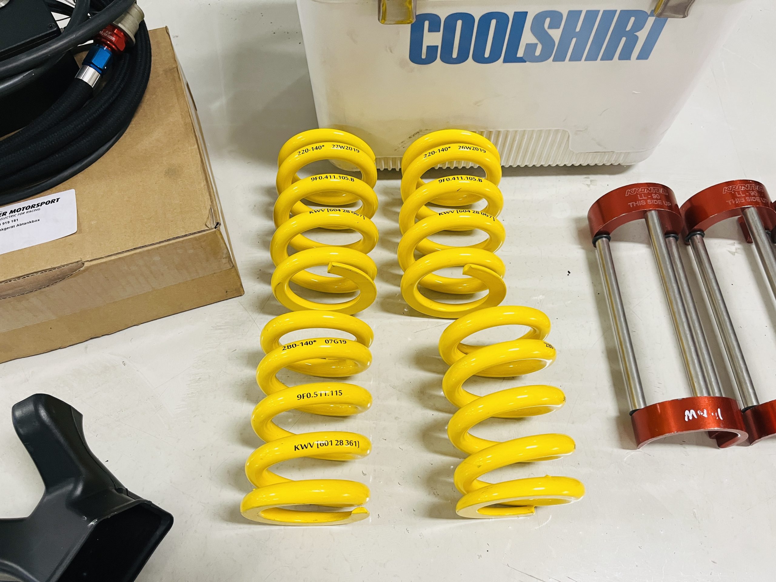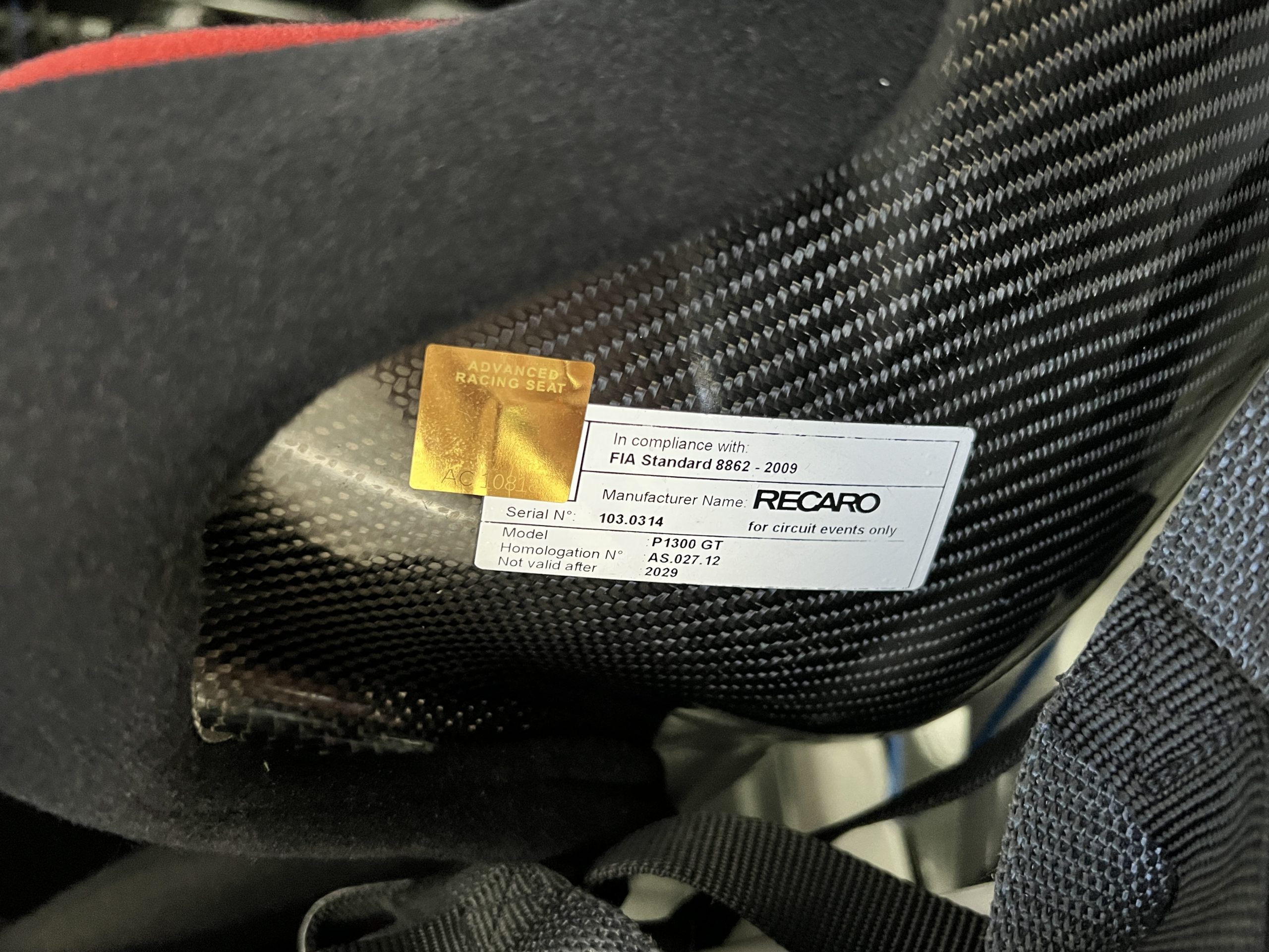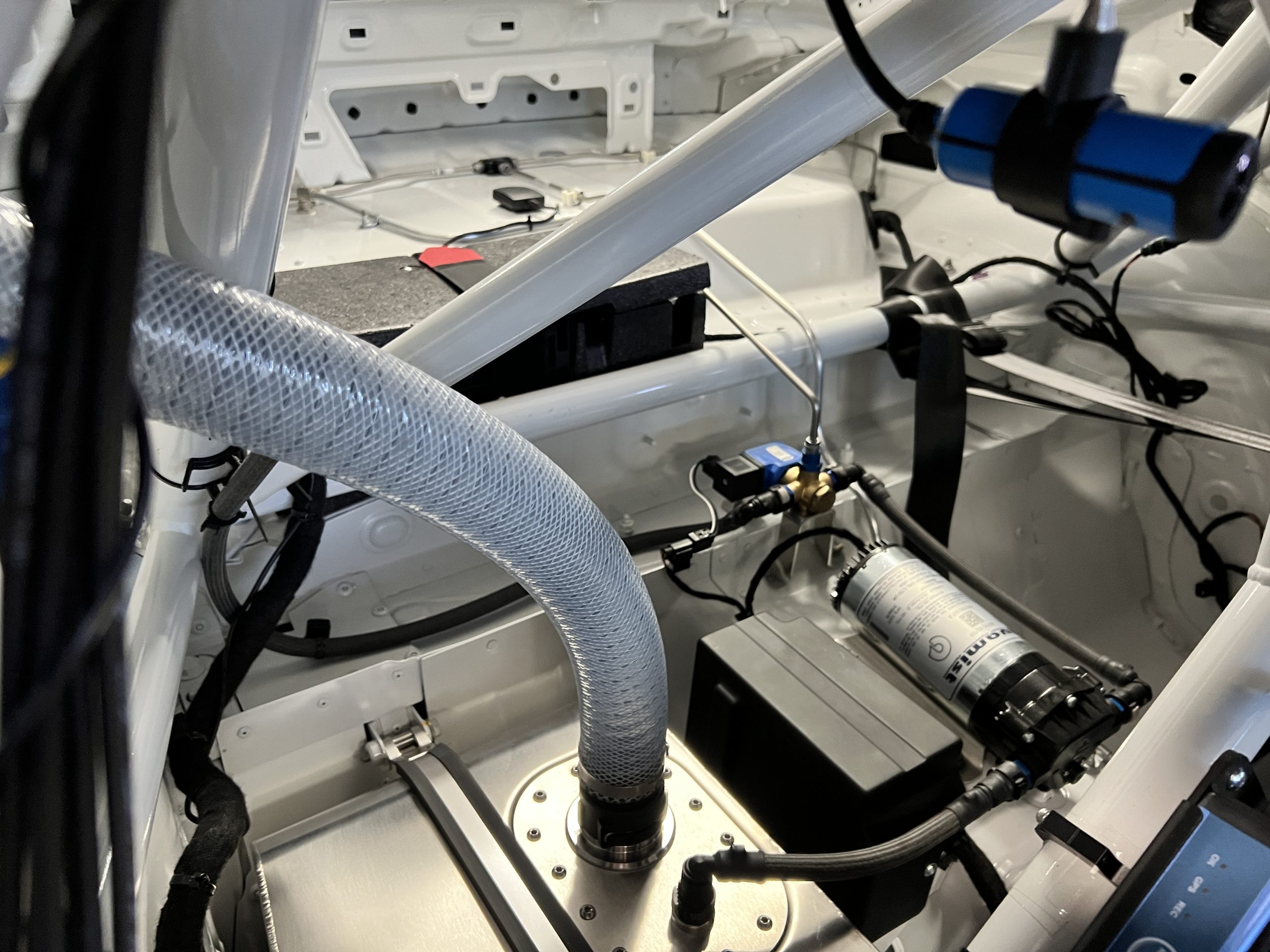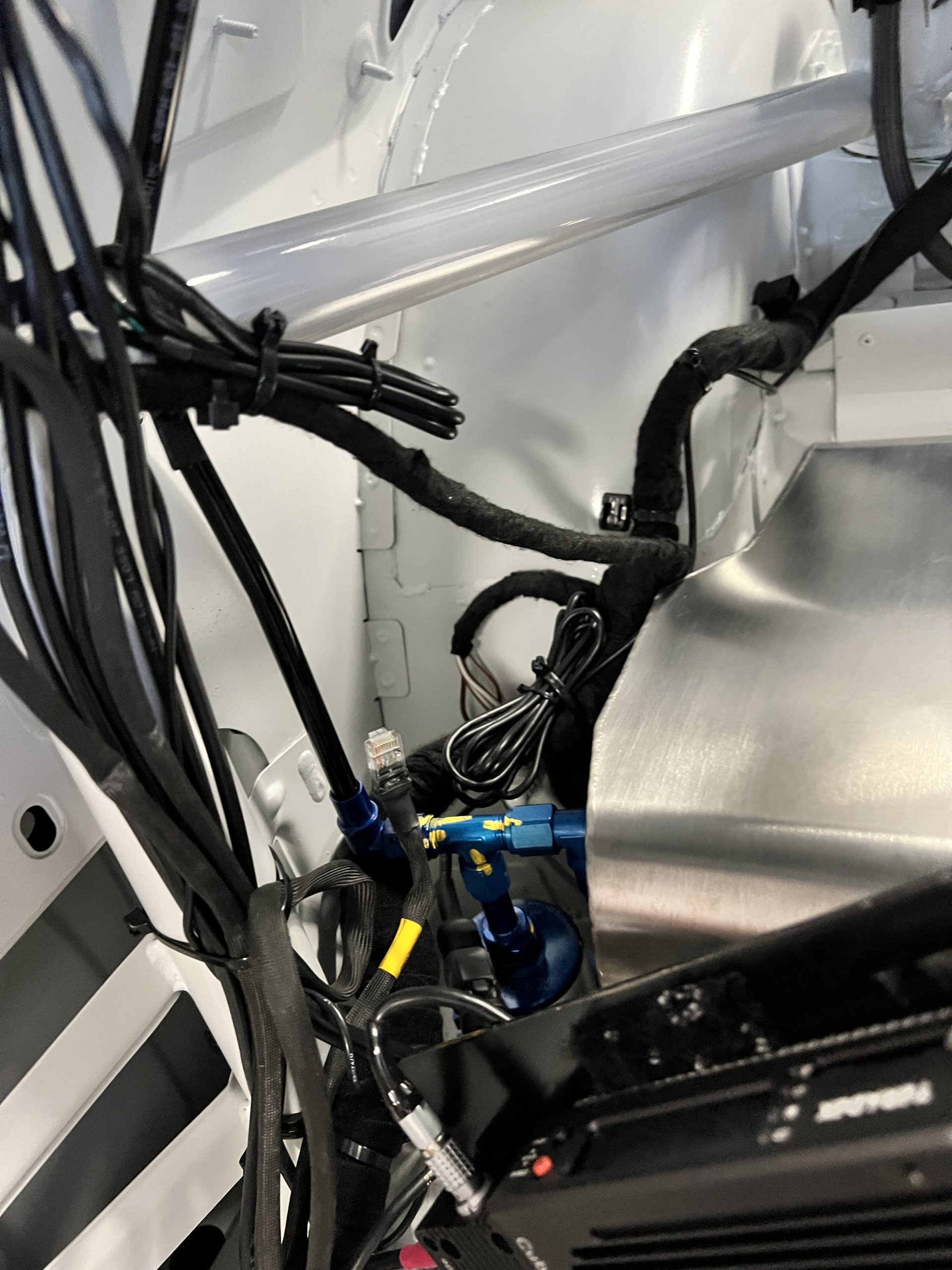 A single Recaro P1300 GT racing seat is mounted within the stripped cockpit and features fore and aft adjustment as well as a Schroth six-point harness. The car is equipped with a factory-integrated roll cage, a fire-suppression system, air conditioning, a carbon-fiber switch panel, an electrical cutoff switch, an integrated lap trigger, and the Porsche Track Precision race app. A lithium-ion battery is positioned in the passenger footwell along with the ECU. Modifications include a two-camera VBOX Video HD2 track package, a Teradek live stream system, a Coolshirt system, a Maglock fresh air helmet system, and an intercom radio.
