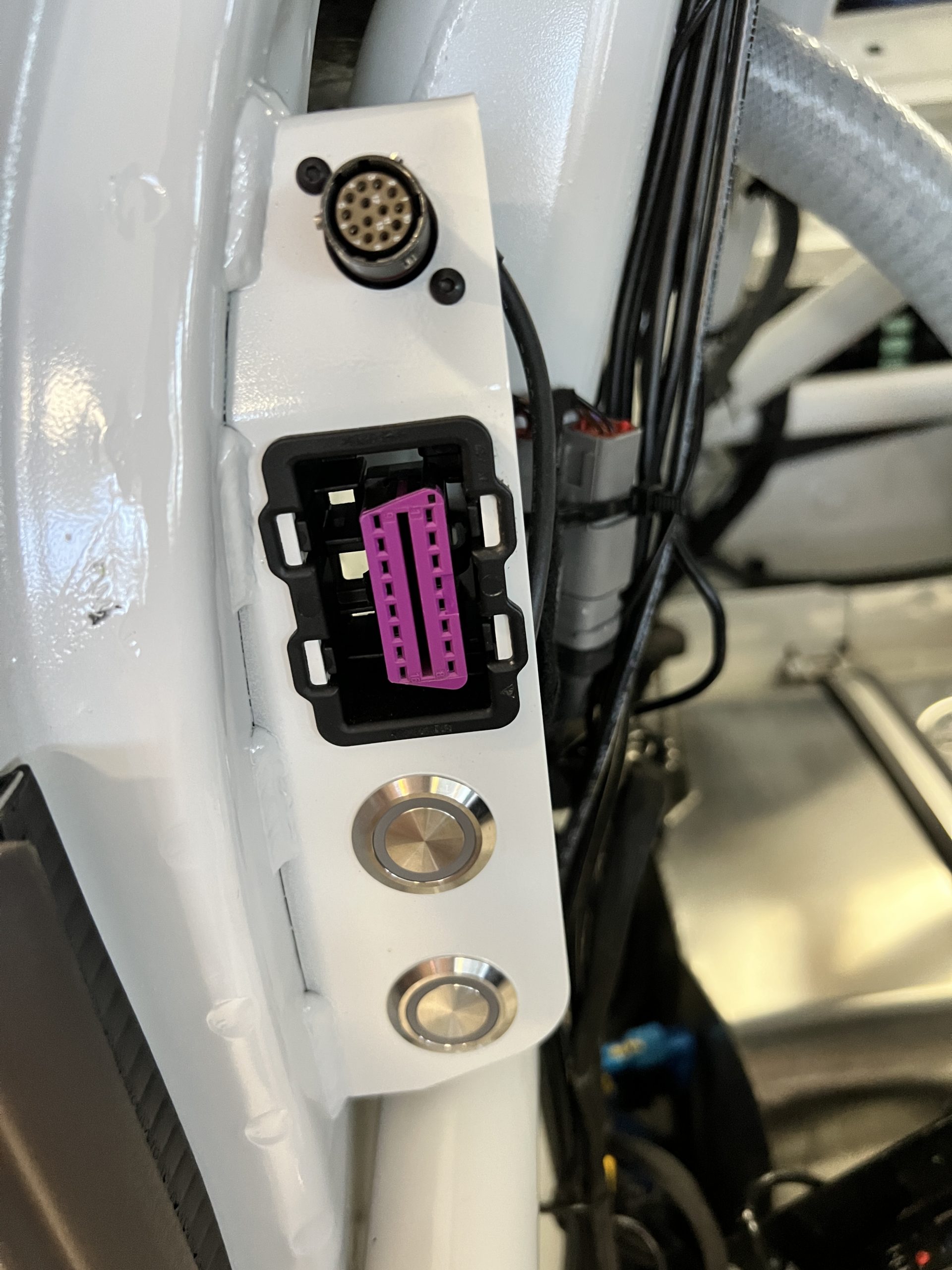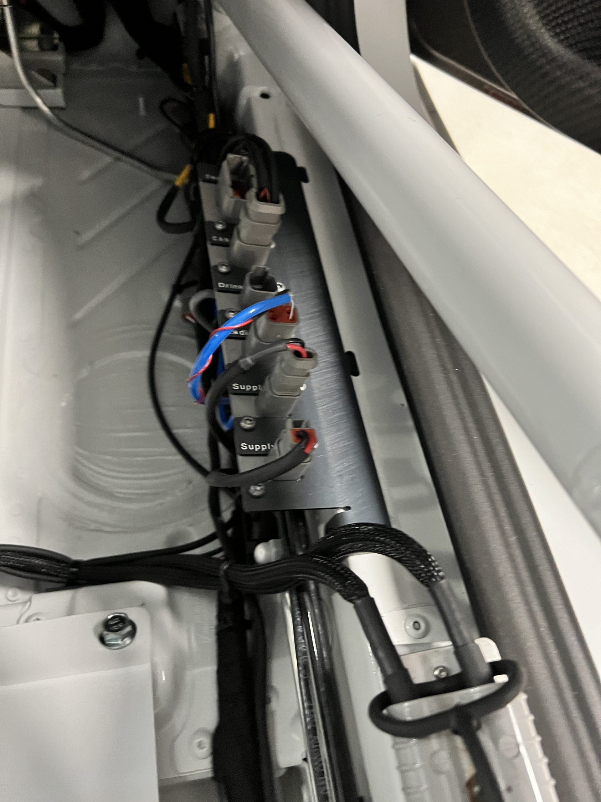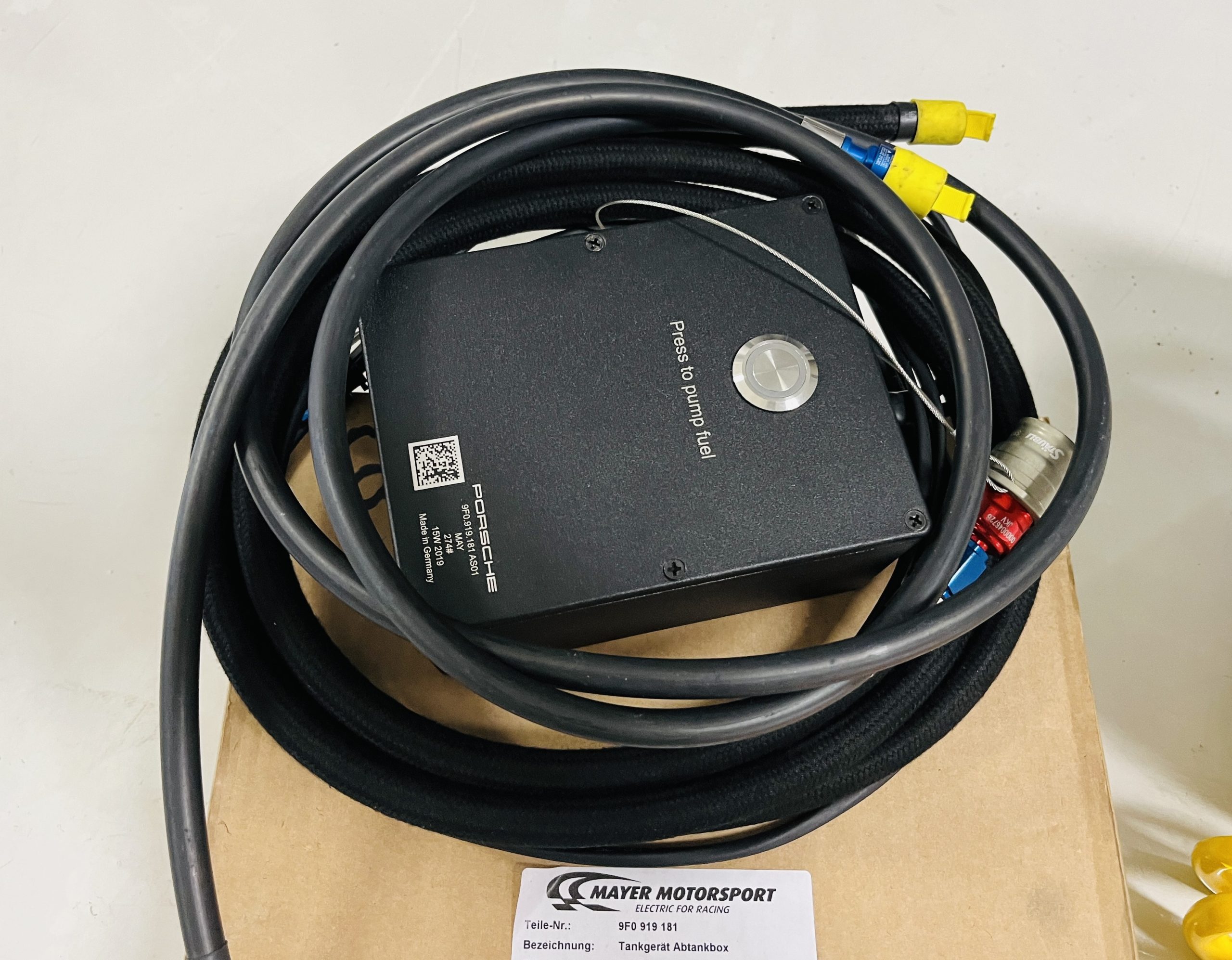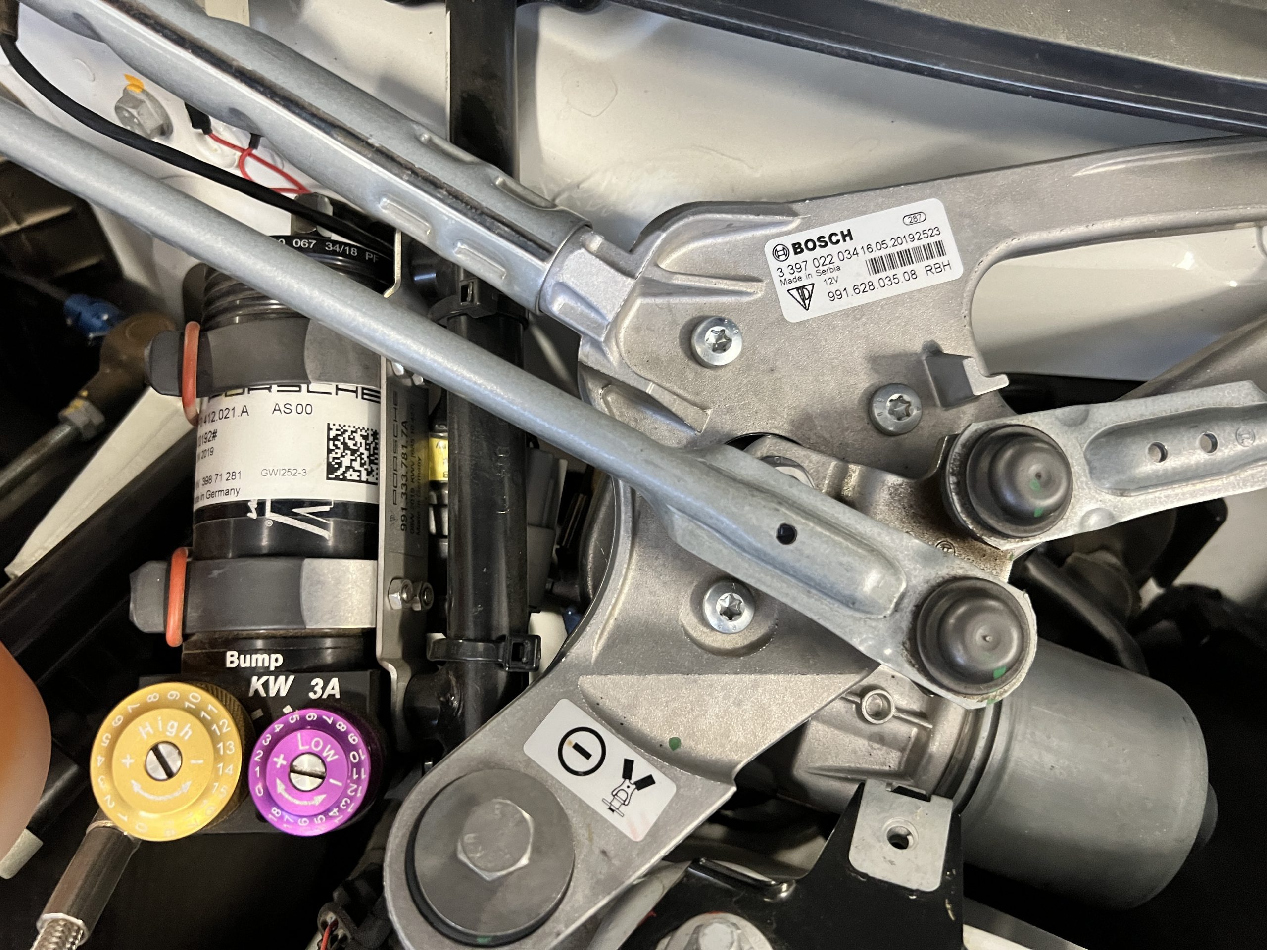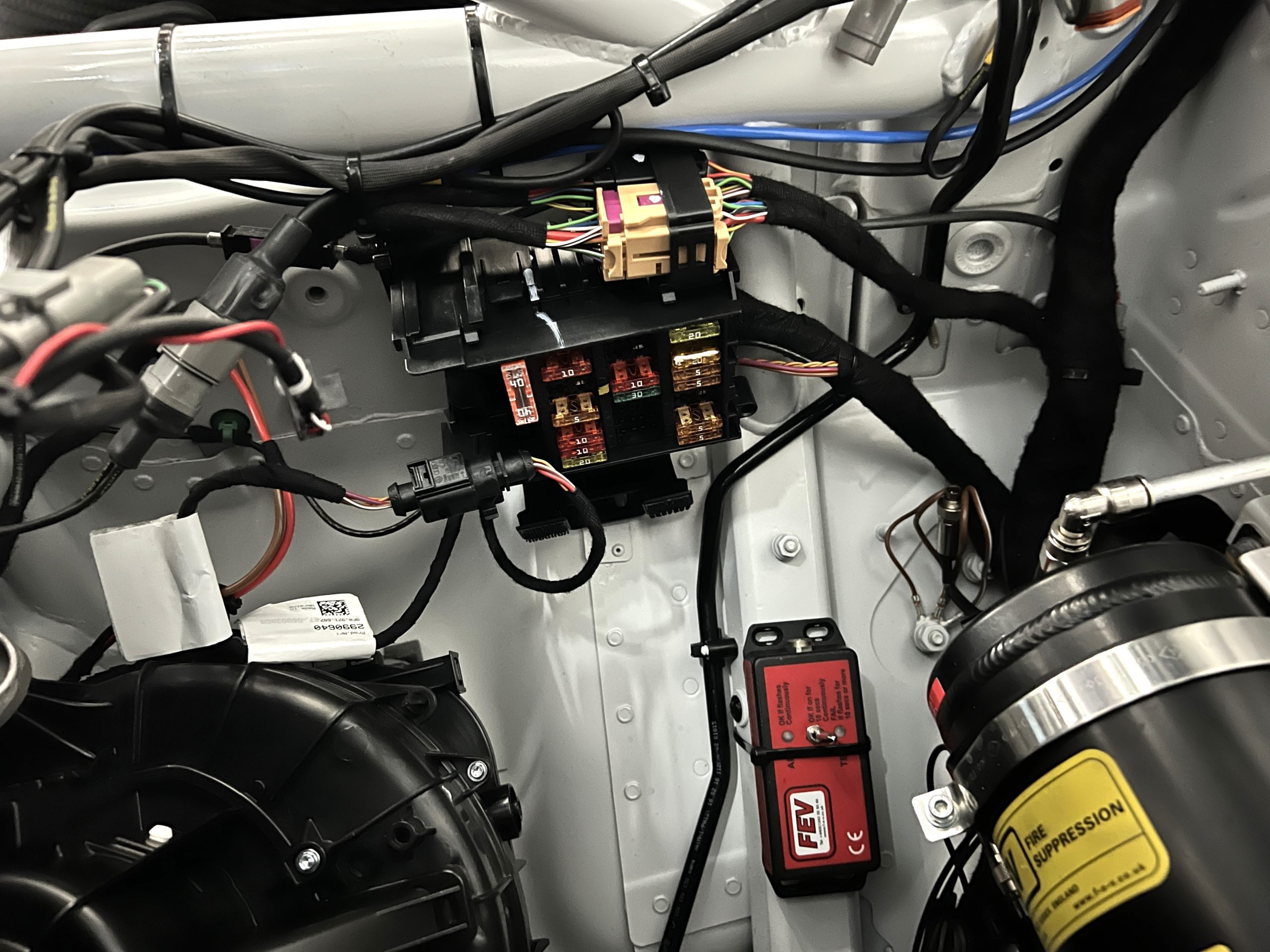 A single Recaro P1300 GT racing seat is mounted within the stripped cockpit and features fore and aft adjustment as well as a Schroth six-point harness. The car is equipped with a factory-integrated roll cage, a fire-suppression system, air conditioning, a carbon-fiber switch panel, an electrical cutoff switch, an integrated lap trigger, and the Porsche Track Precision race app. A lithium-ion battery is positioned in the passenger footwell along with the ECU. Modifications include a two-camera VBOX Video HD2 track package, a Teradek live stream system, a Coolshirt system, a Maglock fresh air helmet system, and an intercom radio.