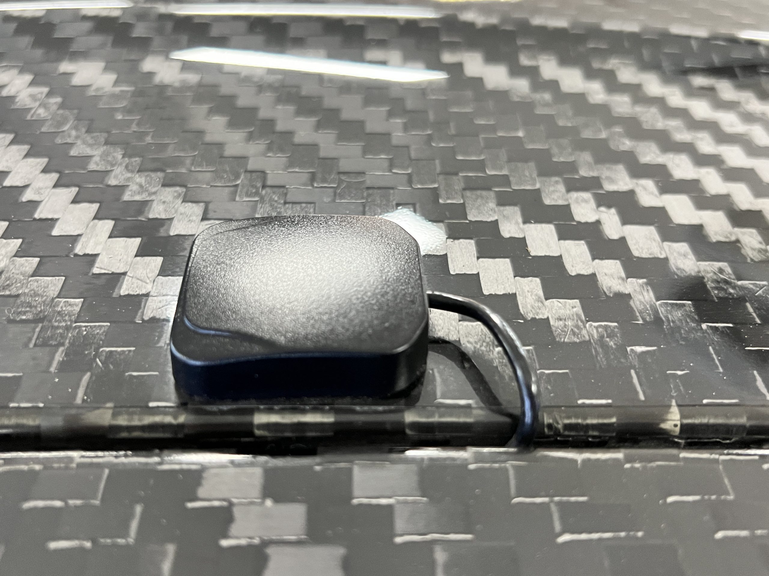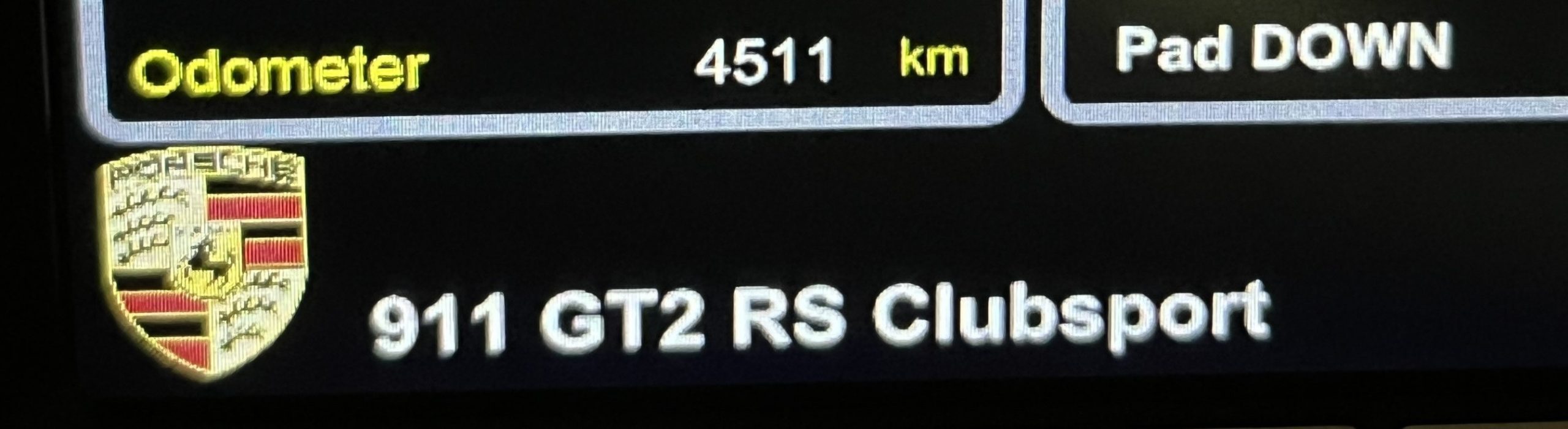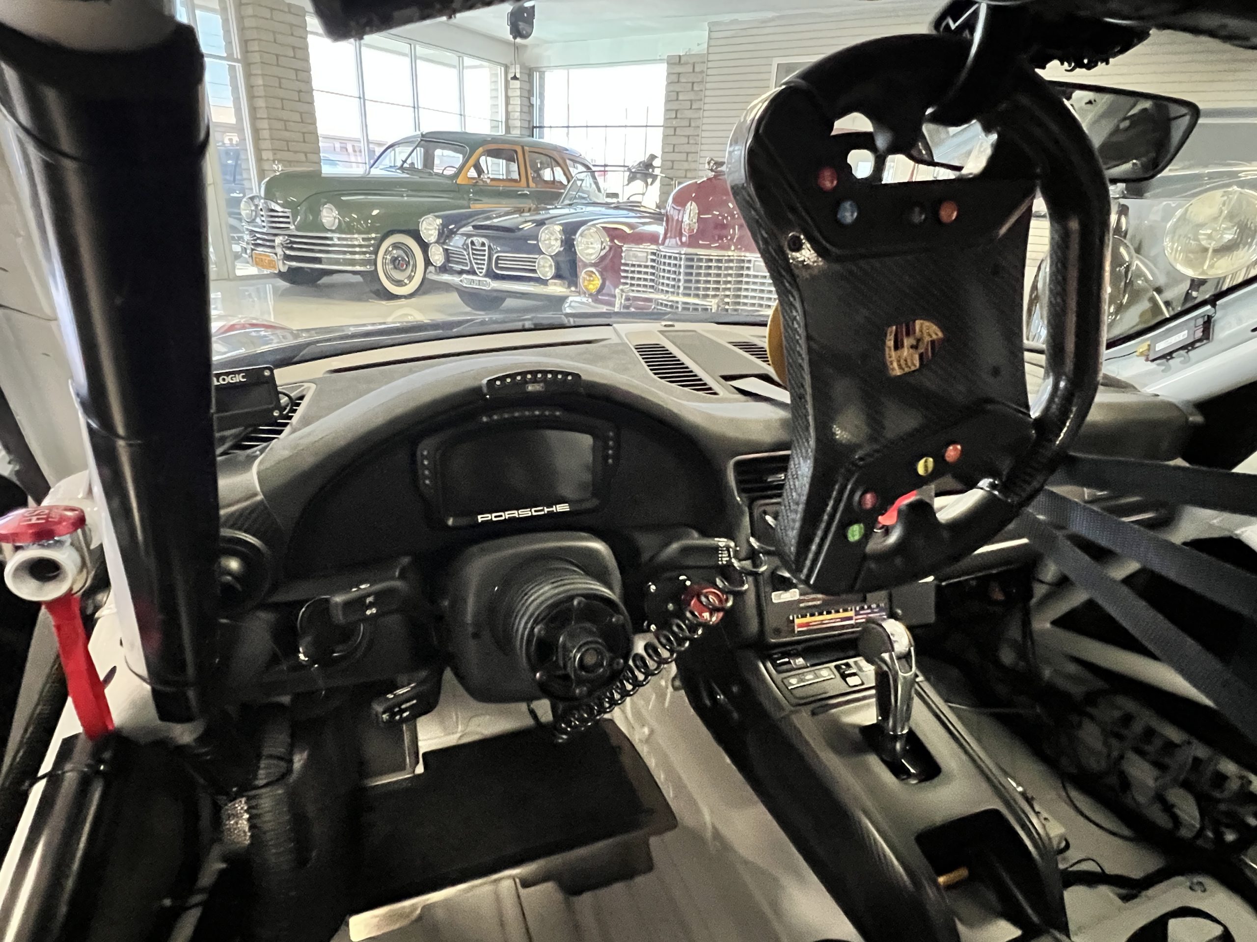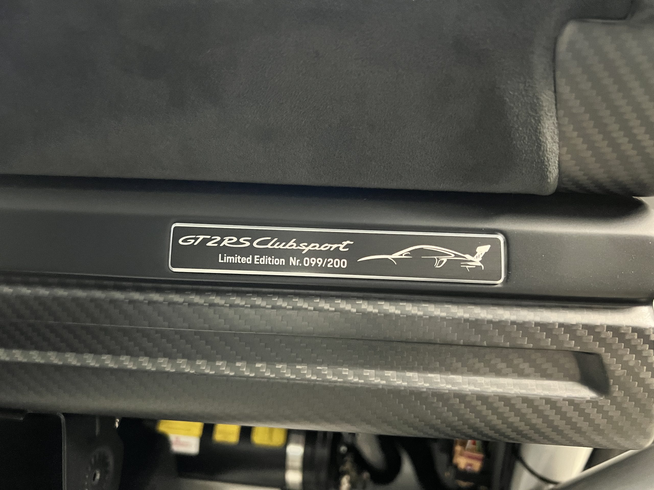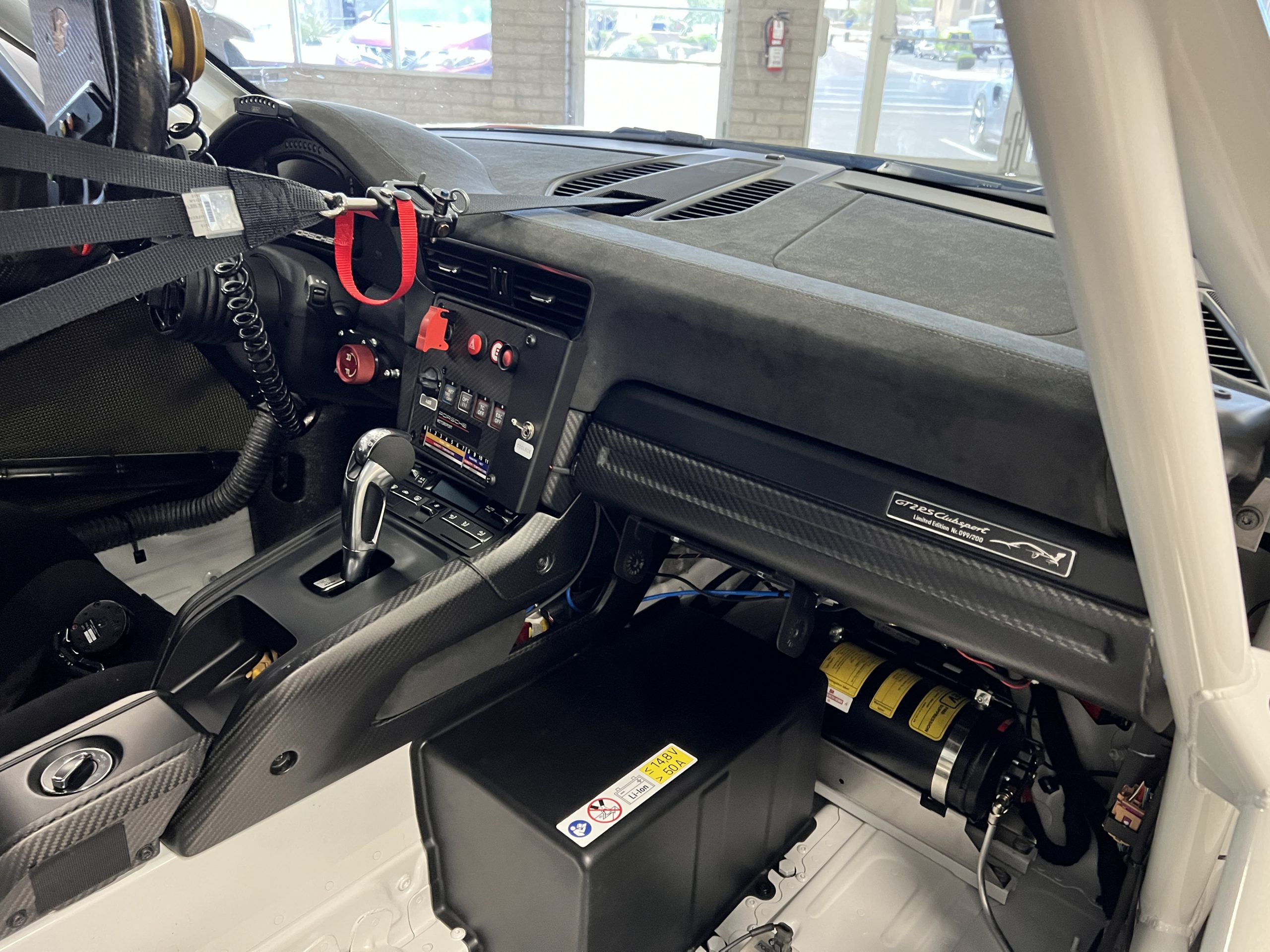 The carbon-fiber steering wheel is mounted on a quick-release hub and features an integrated pit speed limiter and shift paddles. Instrumentation is displayed on a Cosworth LCD screen with an integrated data logger. A Racelogic predictive lap timer and a MoTeC shift light module are also fitted. The digital odometer shows 4,500 kilometers (~2,800 miles). A dash-mounted plaque indicates that this car is #99 of 200 GT2 RS Clubsport cars built.
