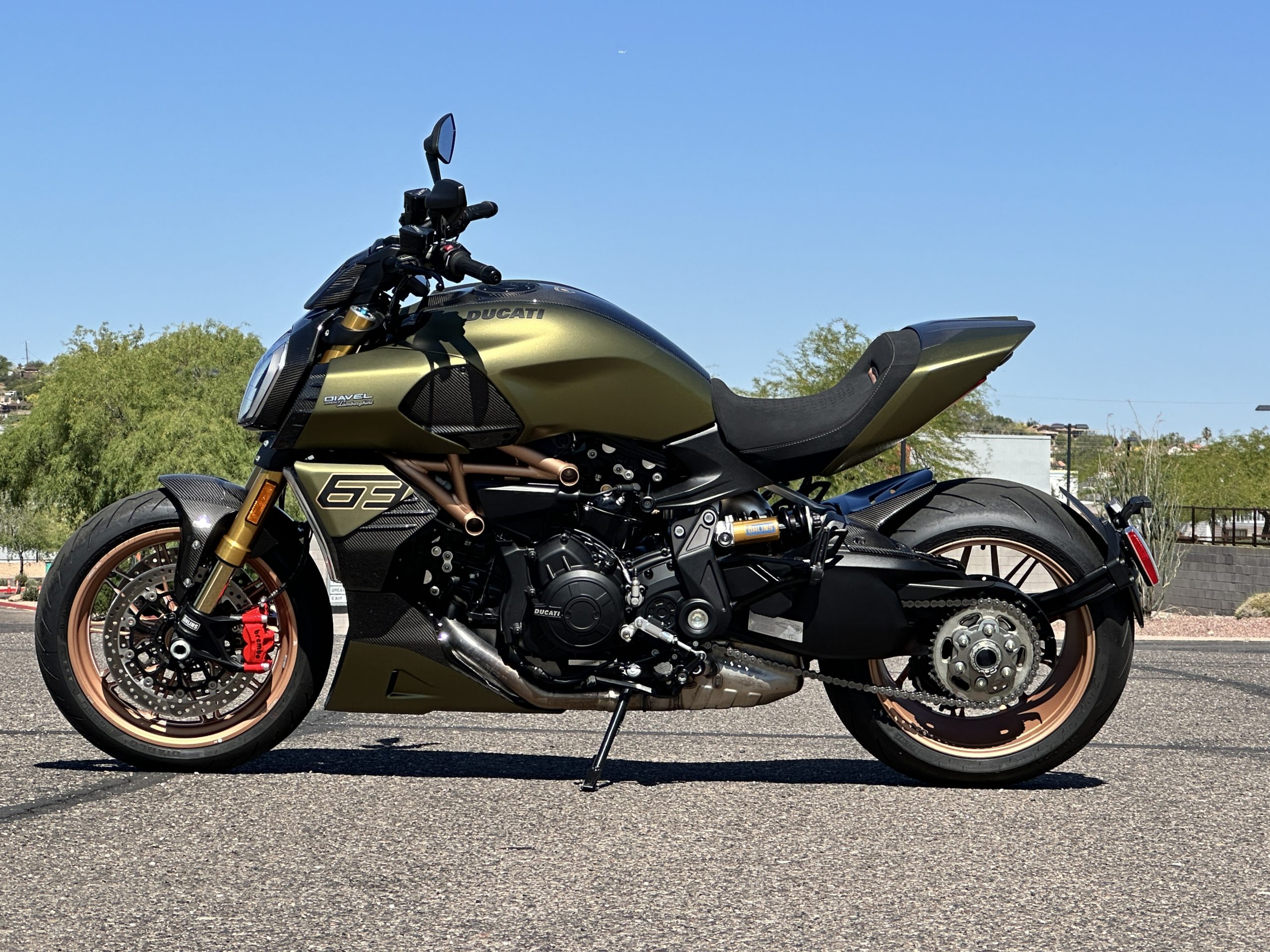 SOLD ON BaT.  This 2021 Ducati Diavel 1260 Lamborghini is one of 630 examples produced and was previously listed on BaT in July 2023, and it was subsequently acquired by the current owner. Power is provided by a 1,262cc Testastretta L-twin mated to a six-speed transmission with Ducati Quick Shift (DQS), and the bike’s carbon-fiber bodywork is finished in Gia Green with design accents from the Lamborghini Siàn. Additional features include Bosch electronic fuel injection, a stainless-steel exhaust system, adjustable Öhlins suspension, 17″ forged wheels, triple disc brakes with Brembo calipers, and an Alcantara seat along with an electronics package that consists of a color TFT instrument display, ABS, traction control, wheelie control, launch control, and cruise control. This Diavel 1260 Lamborghini has 762 miles and is offered on dealer consignment in Arizona with a color-coordinated Arai Ram-X helmet, a paddock stand, and a clean Wisconsin title.