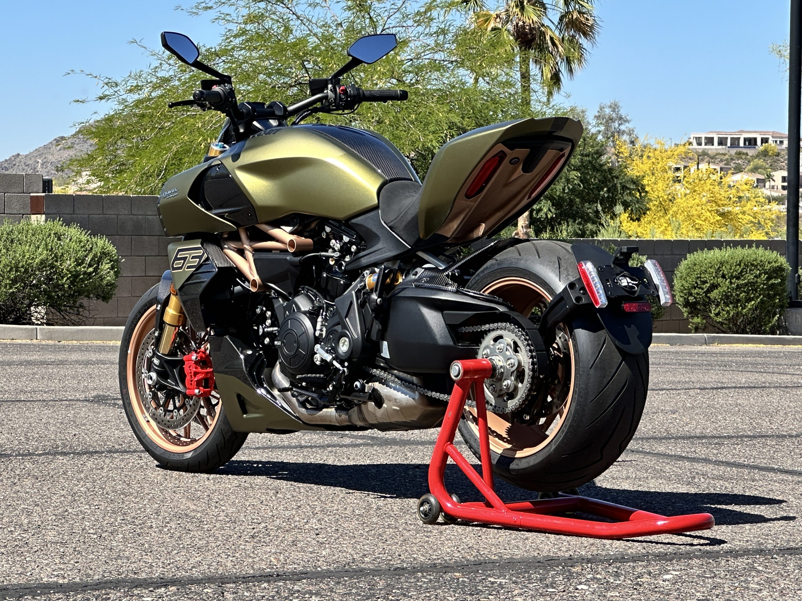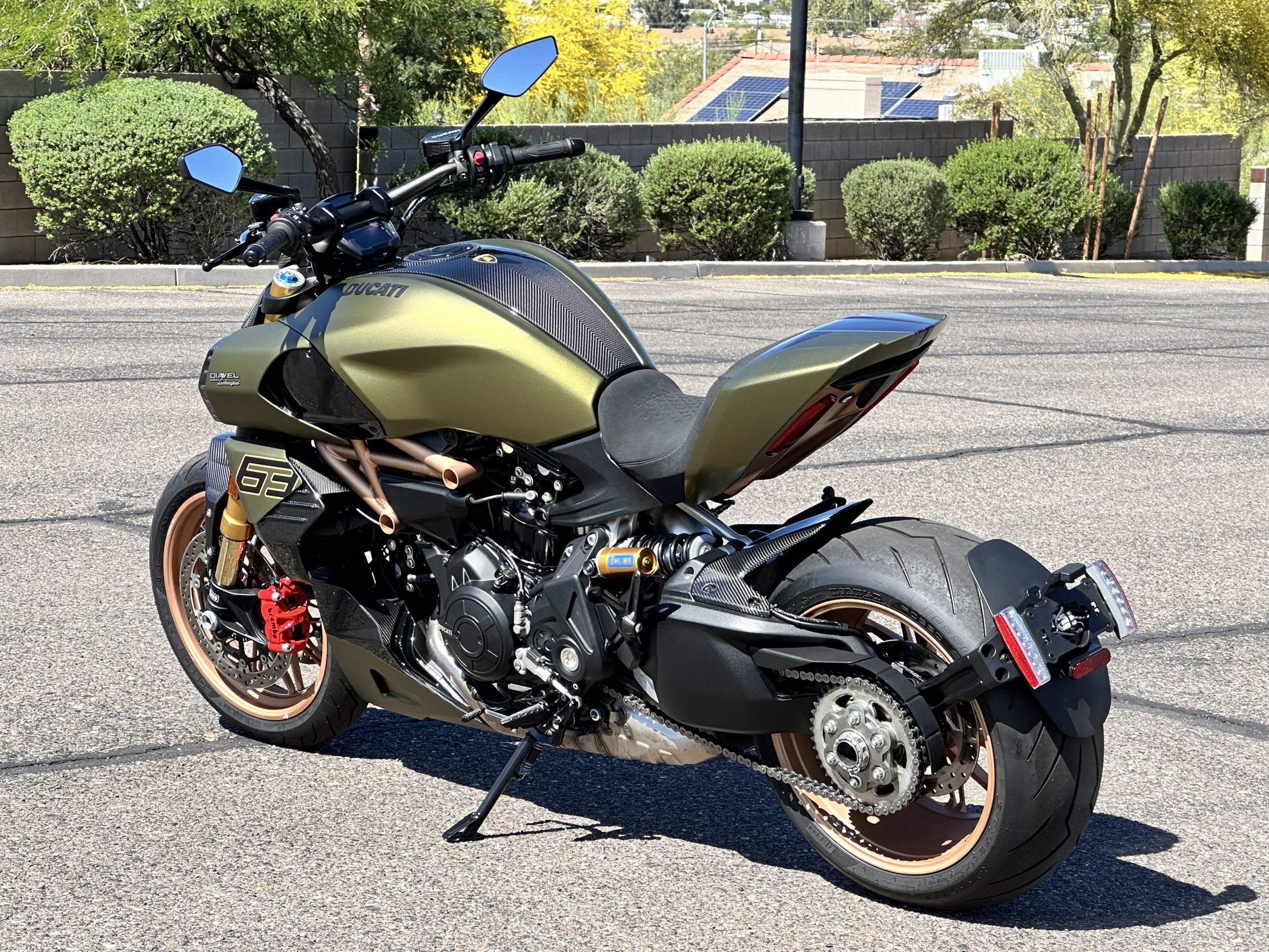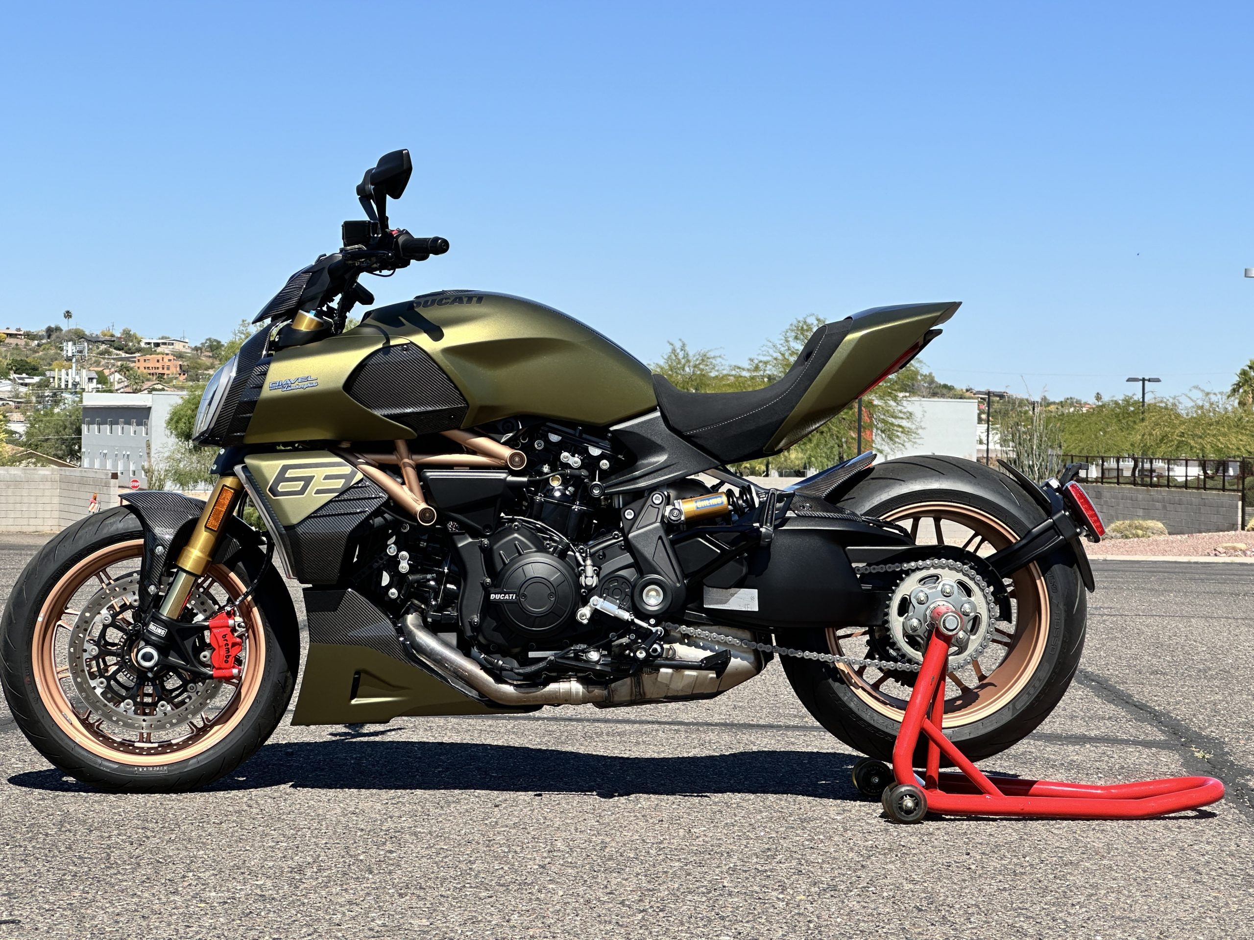The liquid-cooled 1,262cc Testastretta L-twin was factory rated at 157 horsepower and 95 lb-ft of torque and is equipped with Desmodromic Variable Timing (DVT), Bosch electronic fuel injection, twin-spark cylinders, and a stainless-steel exhaust system with a single muffler and twin tailpipes that exit ahead of the rear wheel. The oil was changed in preparation for the sale.
