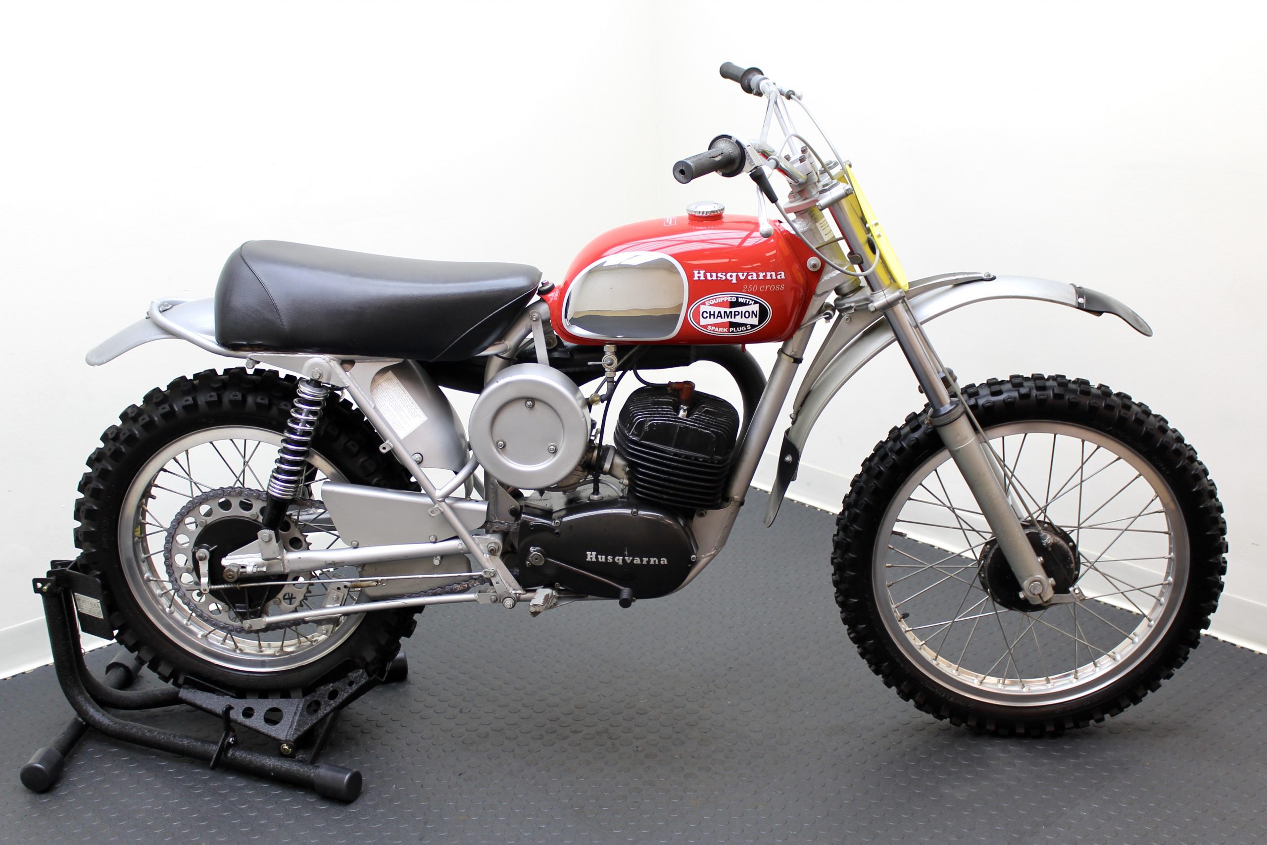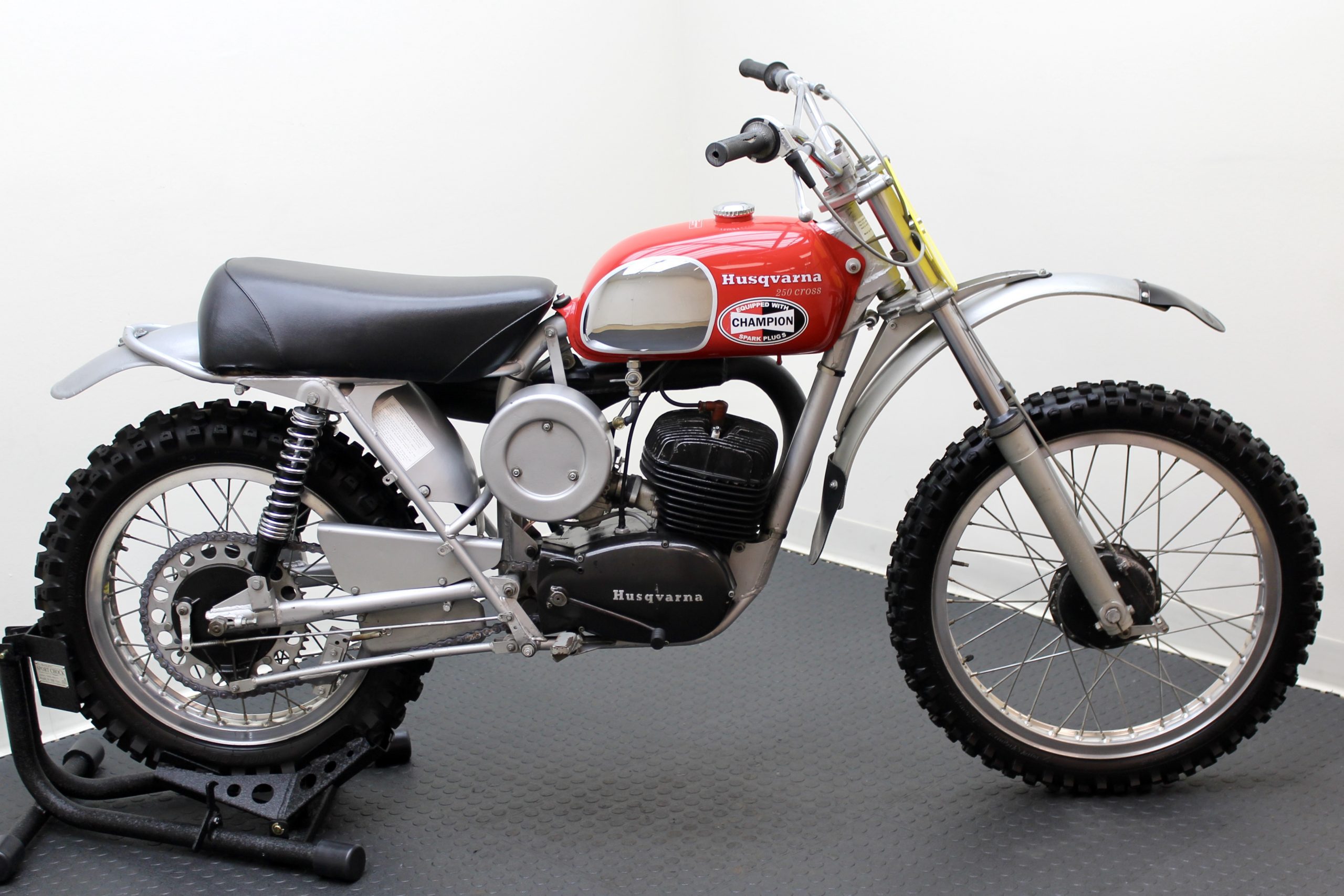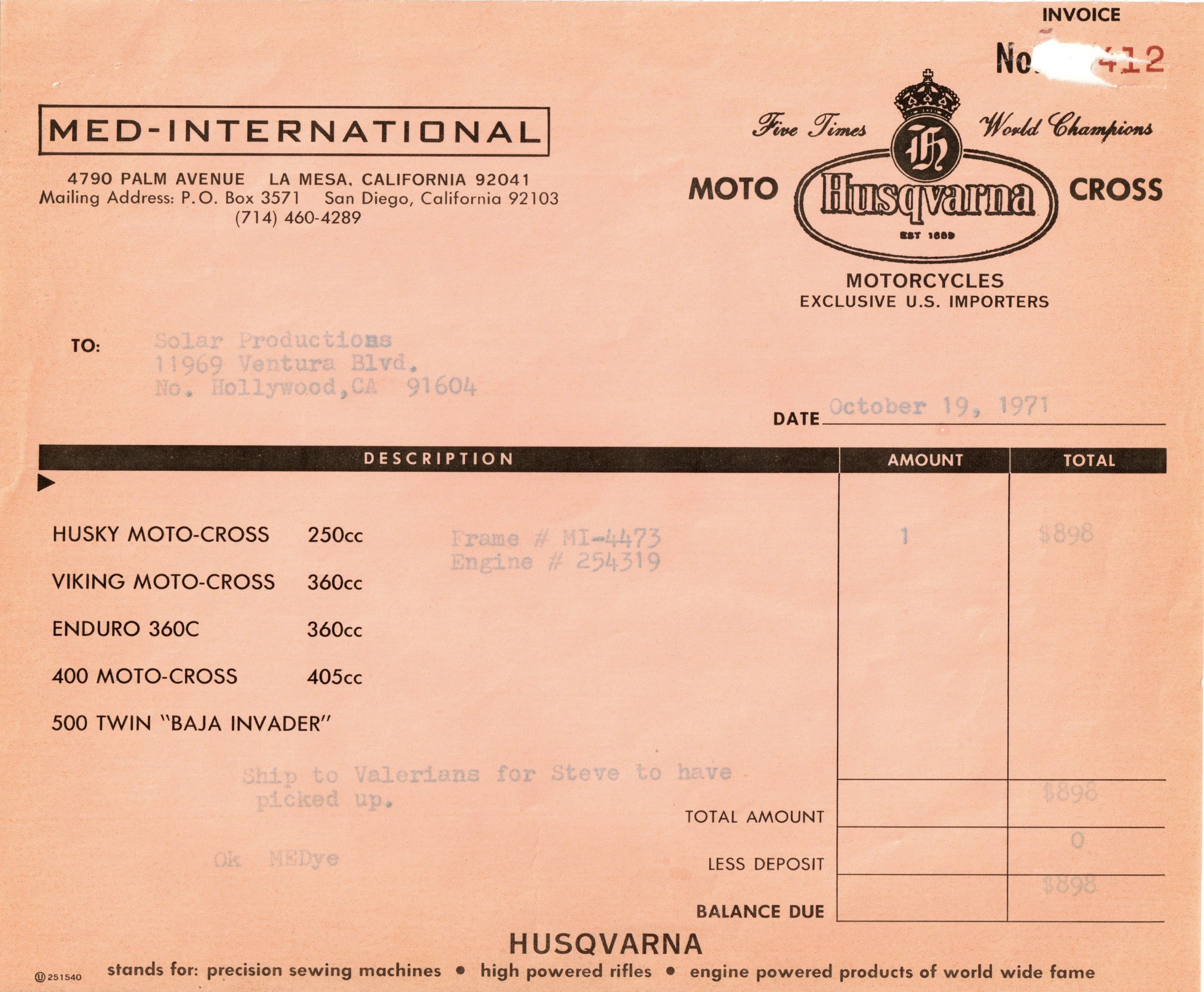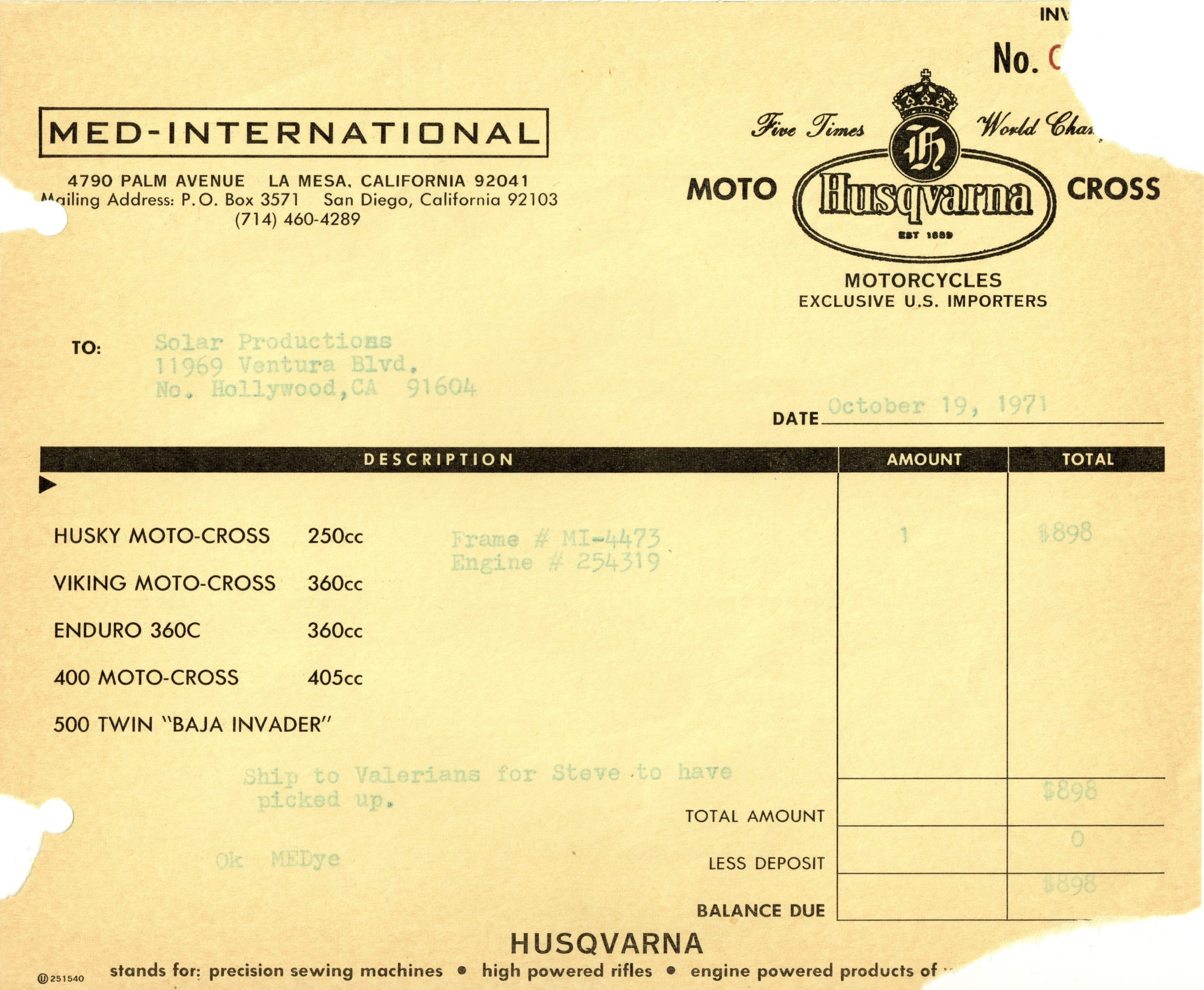 The 250 Cross available here has been sympathetically preserved as it was when McQueen owned it. This red and silver 1971 Husqvarna Moto-Cross 250 motorcycle is fully documented with the original Med-International Husqvarna dealer invoice, dated October 19, 1971, reflecting Solar Productions, McQueen’s production company, as being the buyer of “Husky Moto-Cross 250cc Frame No. MI-4473 and Engine No. 254319” for the total price of $898. There is a typed note at the bottom of the invoice stating, “Ship to Valerians for Steve to have picked up.”