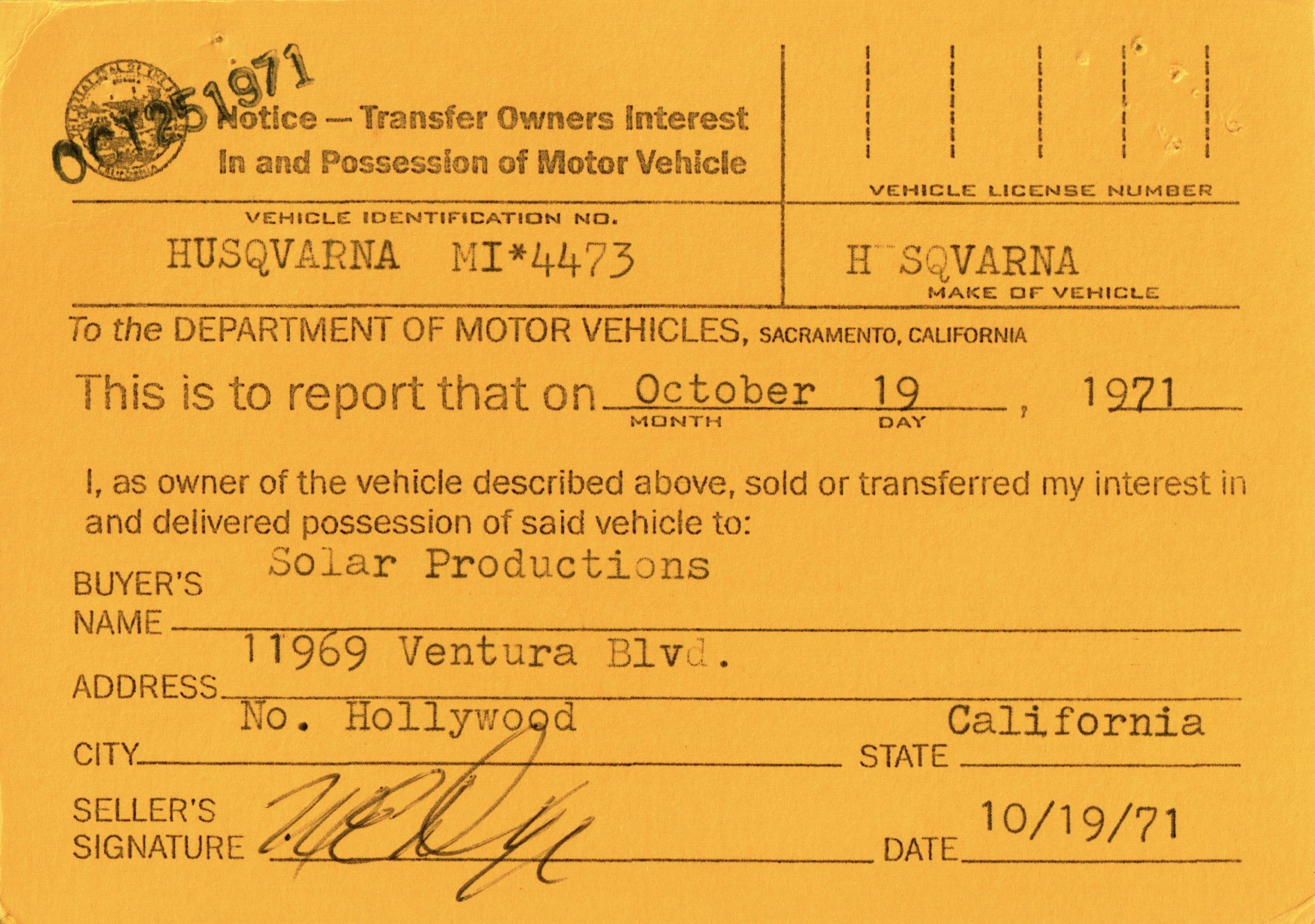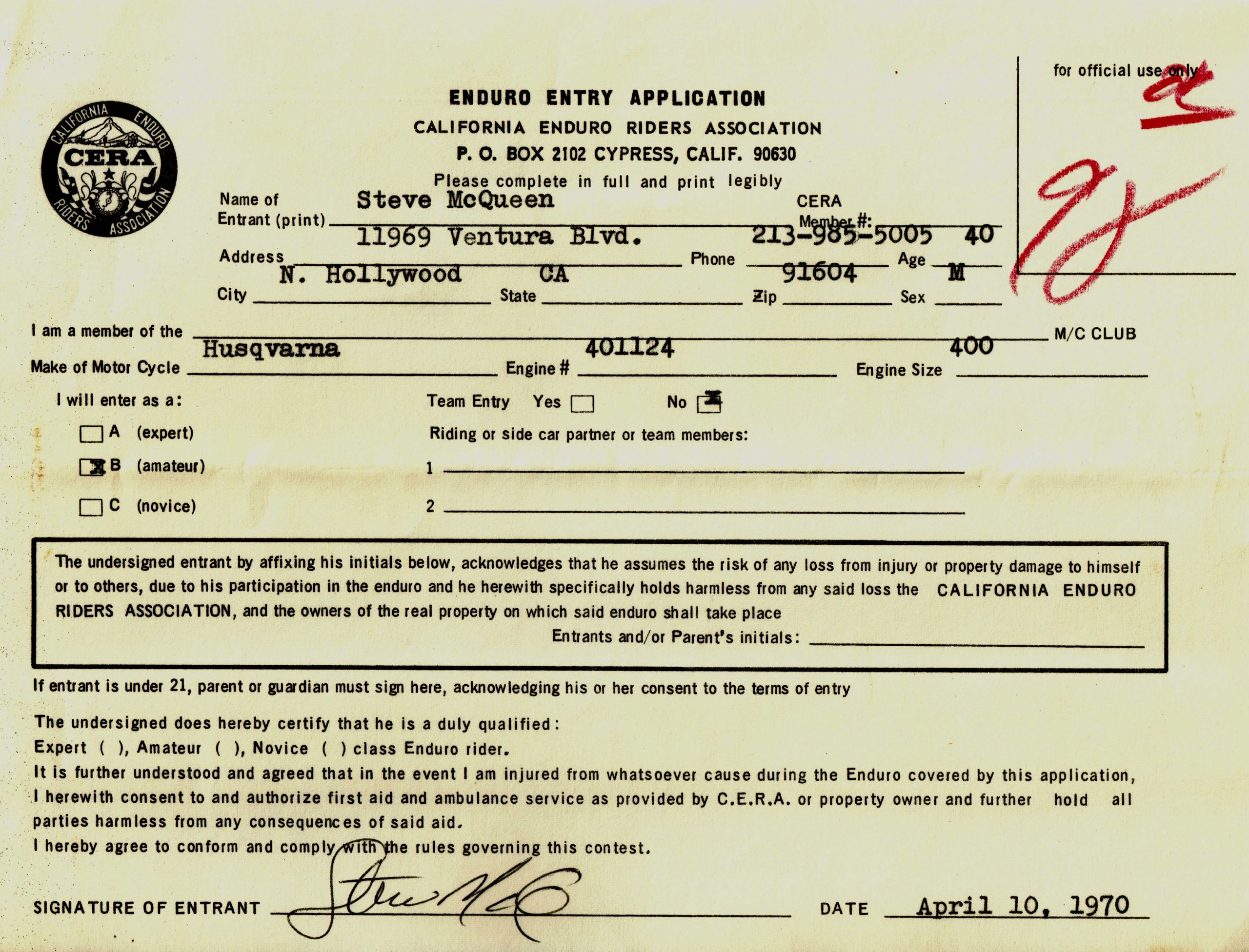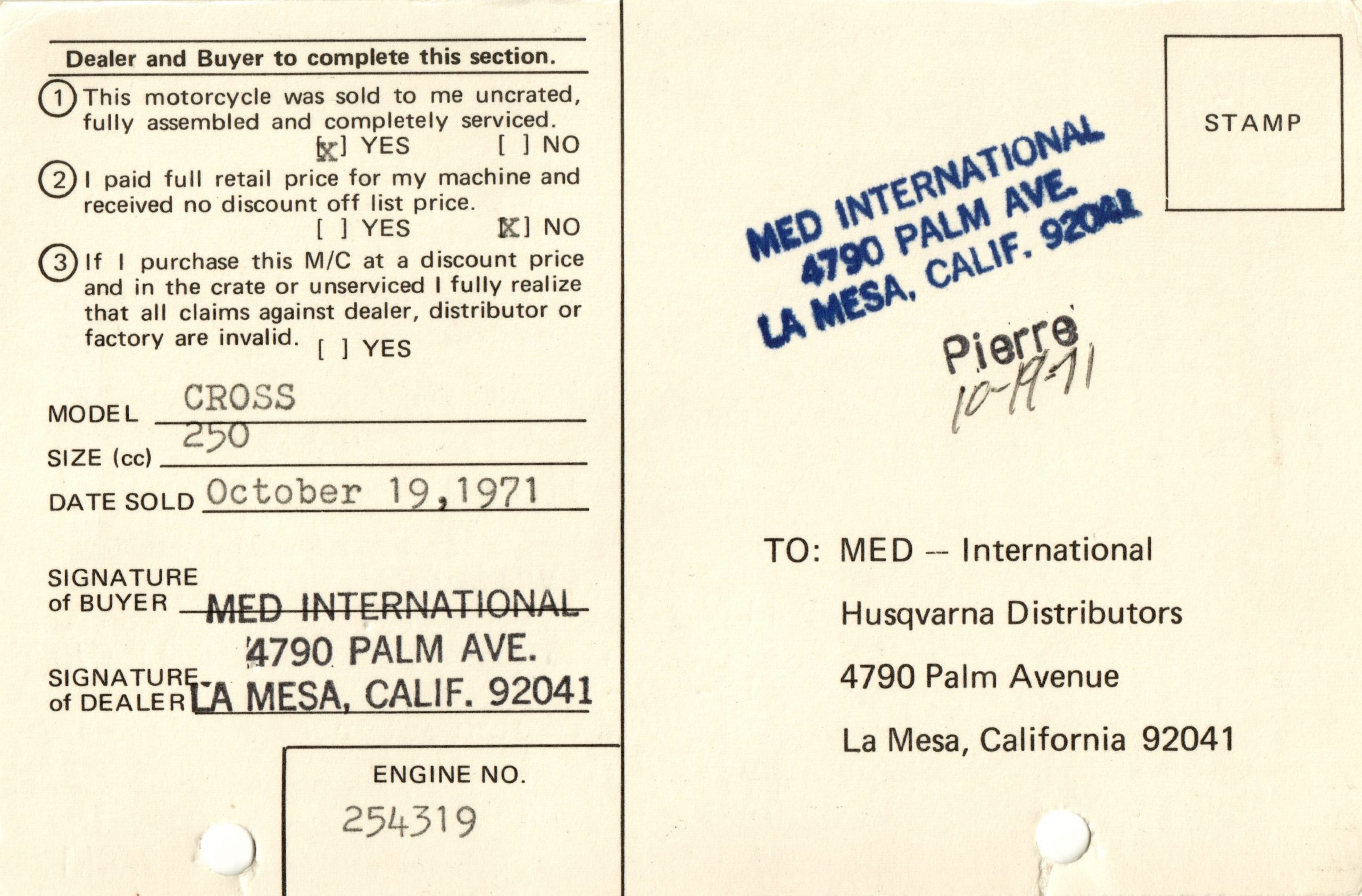 Also included is the original Manufacturer’s Statement of Origin document, dated October 19, 1971, stating the matching Solar Productions buyer information, complete with matching make, model and serial number. Along with that, the Husqvarna Motorcycle Buyer’s Registration Card, made out to Solar Productions in North Hollywood, dated October 19, 1971, the Med International Selling Invoice (both copies, yellow and pink) dated October 19, 1971, the California DMV Transfer of Owners Interest In and Possession of Motor Vehicle from Med International, the selling dealer, dated October 19, 1971, and an Enduro Entry Application from the California Enduro Riders Association signed by Steve McQueen.