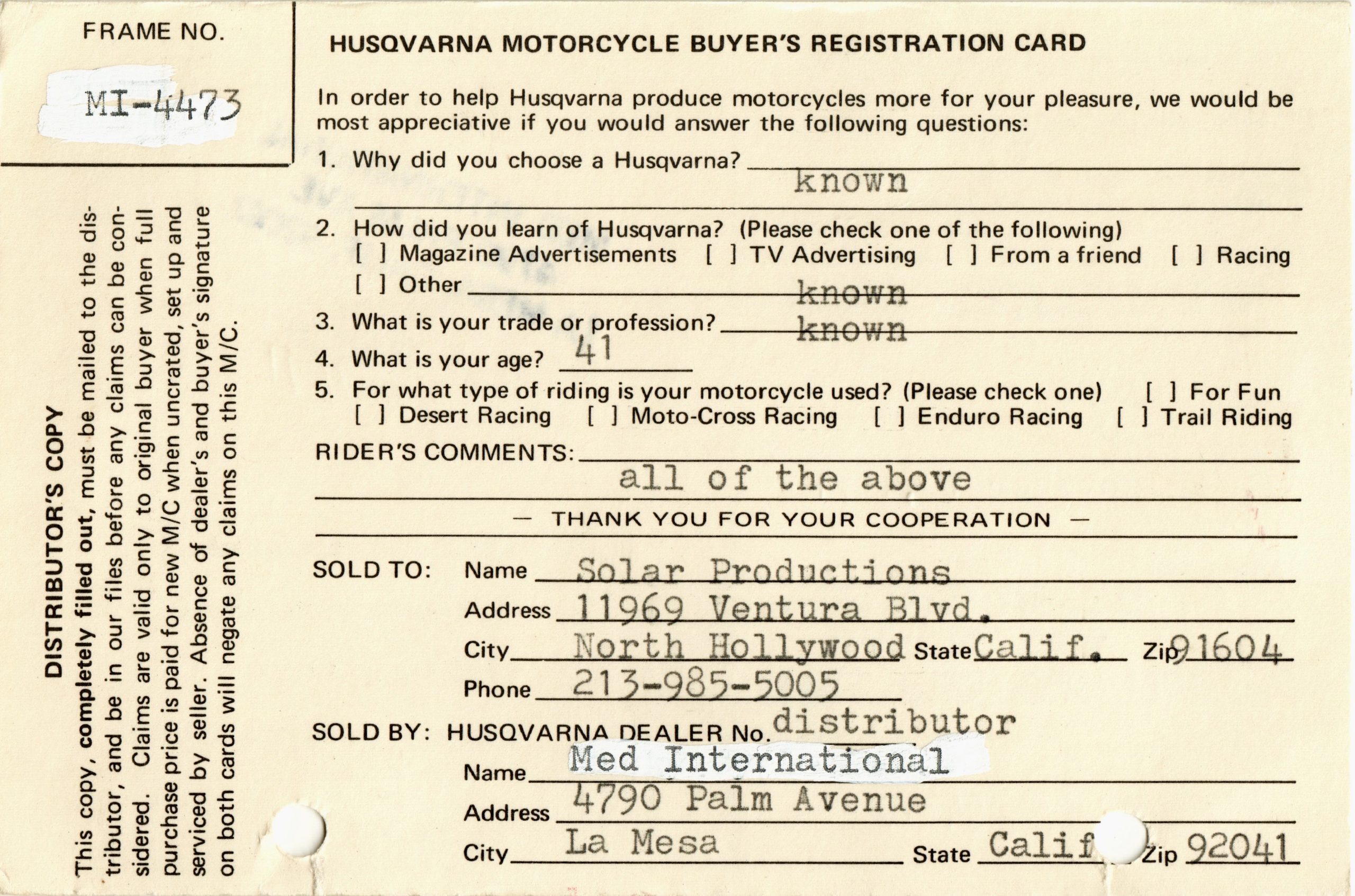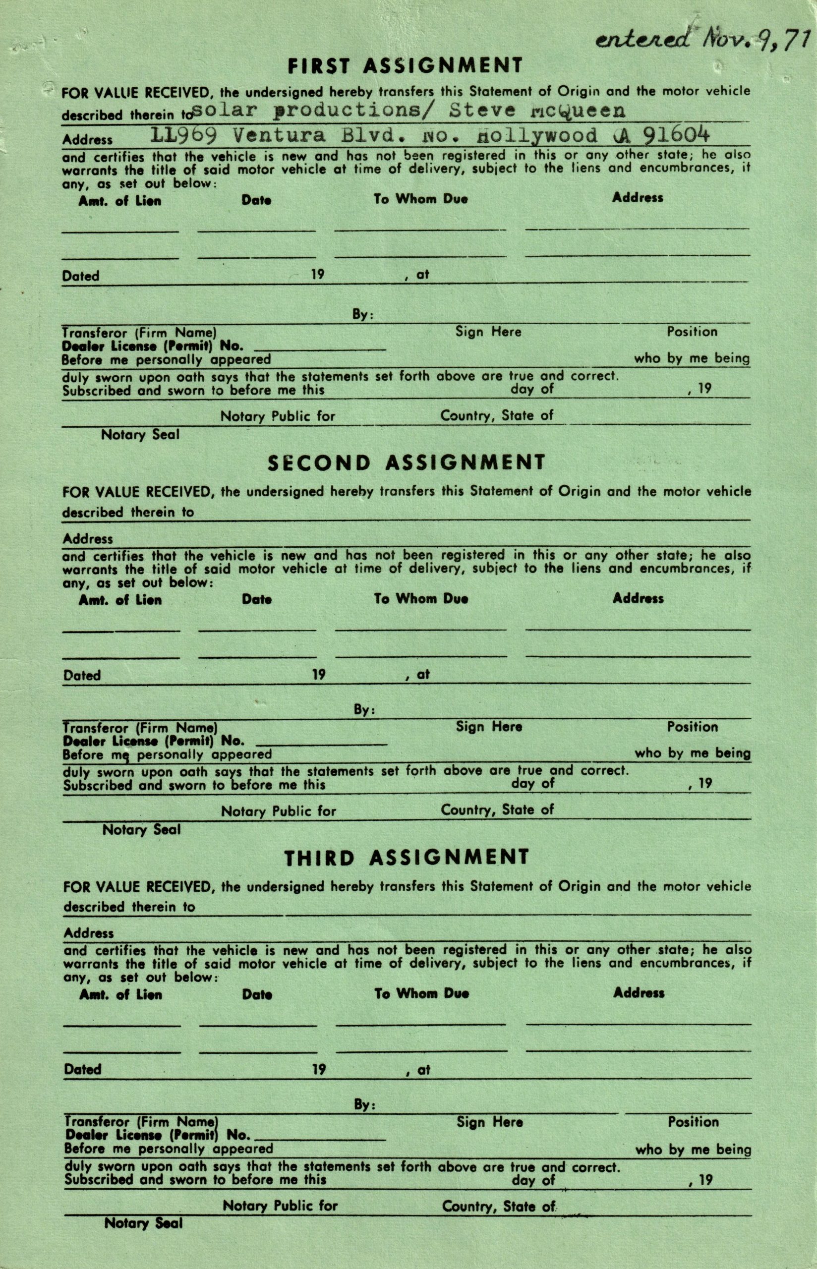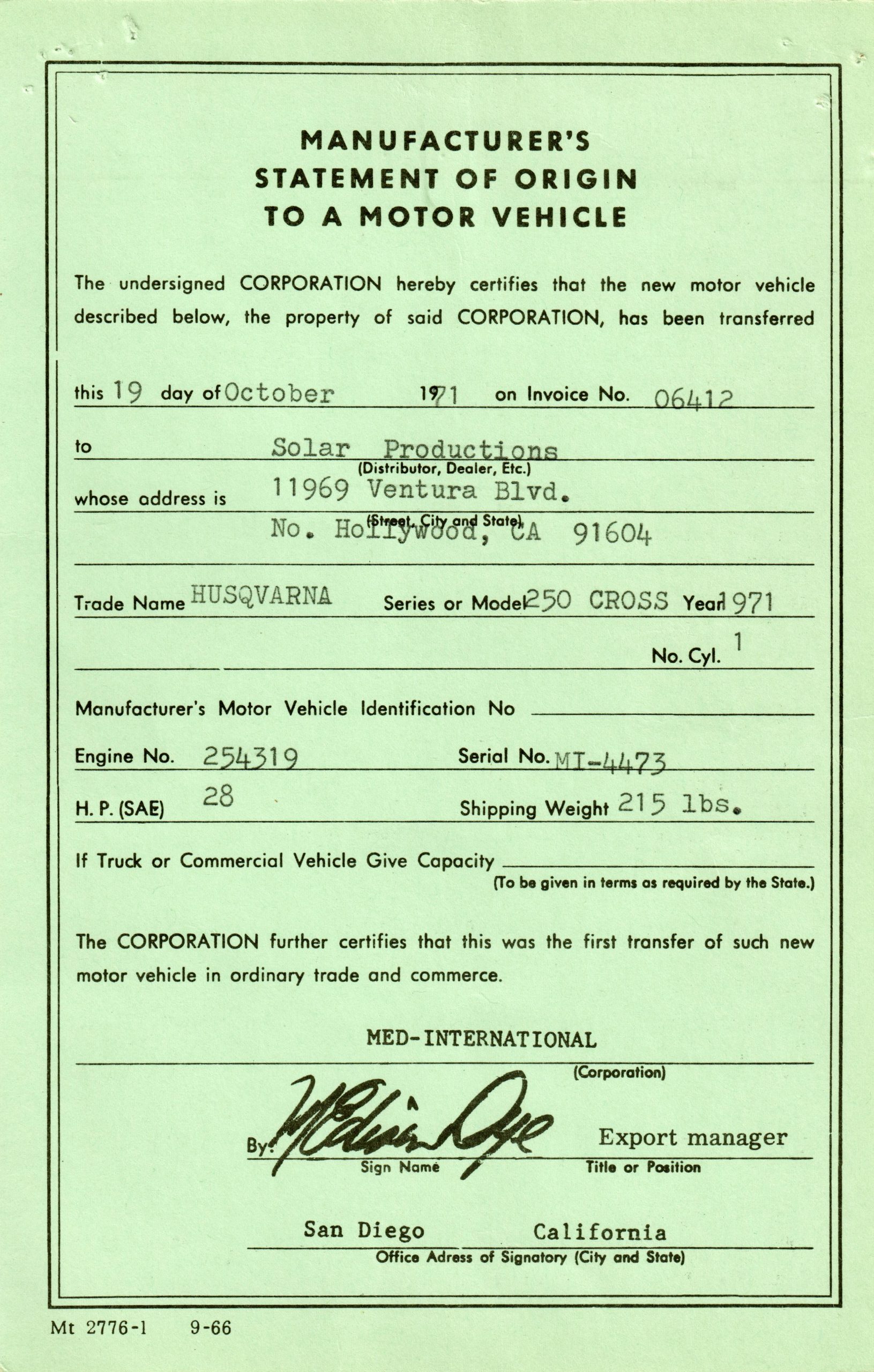 Also included is the original Manufacturer’s Statement of Origin document, dated October 19, 1971, stating the matching Solar Productions buyer information, complete with matching make, model and serial number. Along with that, the Husqvarna Motorcycle Buyer’s Registration Card, made out to Solar Productions in North Hollywood, dated October 19, 1971, the Med International Selling Invoice (both copies, yellow and pink) dated October 19, 1971, the California DMV Transfer of Owners Interest In and Possession of Motor Vehicle from Med International, the selling dealer, dated October 19, 1971, and an Enduro Entry Application from the California Enduro Riders Association signed by Steve McQueen.