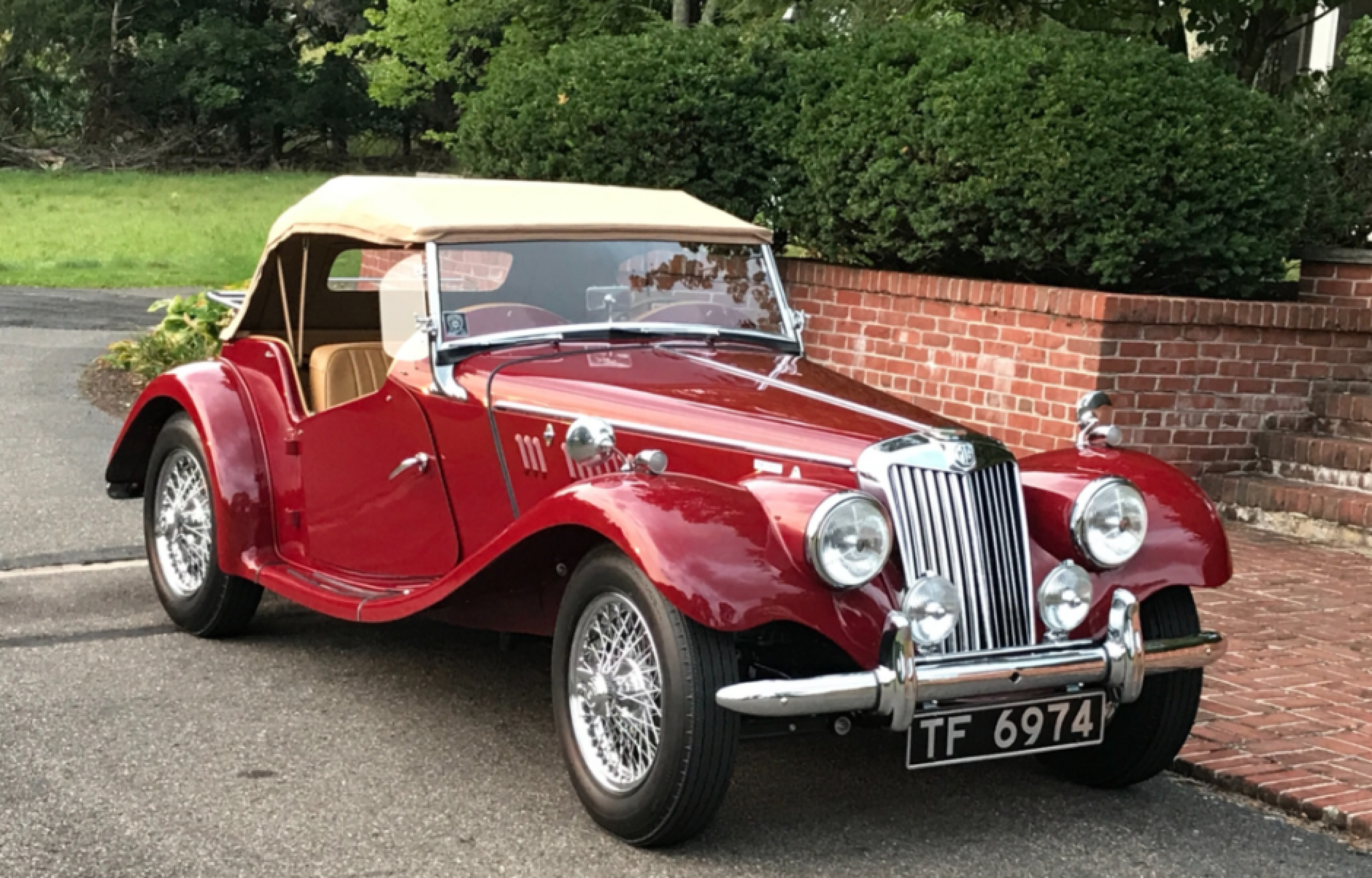 The TF Midget, launched on 15 October 1953, was a facelifted TD, fitted with the TD Mark II engine, headlights faired into the fenders, a sloping radiator grille concealing a separate radiator, and a new pressurised cooling system along with a simulated external radiator cap. This XPAG engine’s compression ratio had been increased to 8.1:1 and extra-large valves with stronger valve springs and larger carburettors increased output to 57.5 bhp at 5,500 rpm.